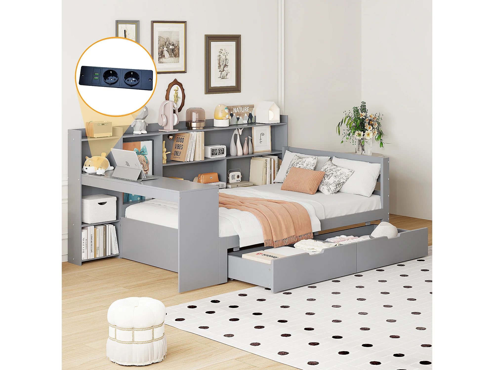 Lit banquette 90x200 cm - Lit enfant avec étagères et 2 tiroirs - bois gris - sans matelas