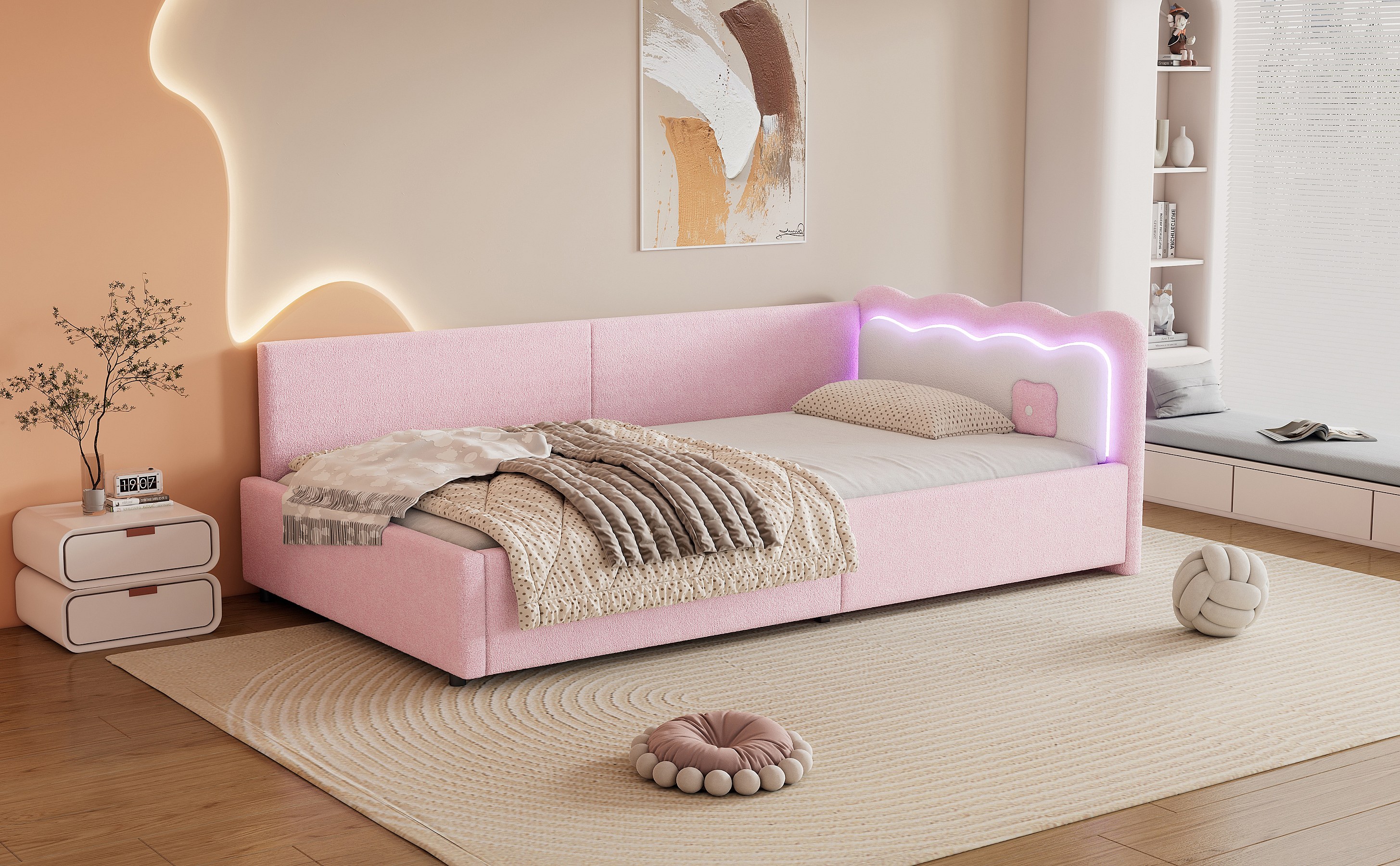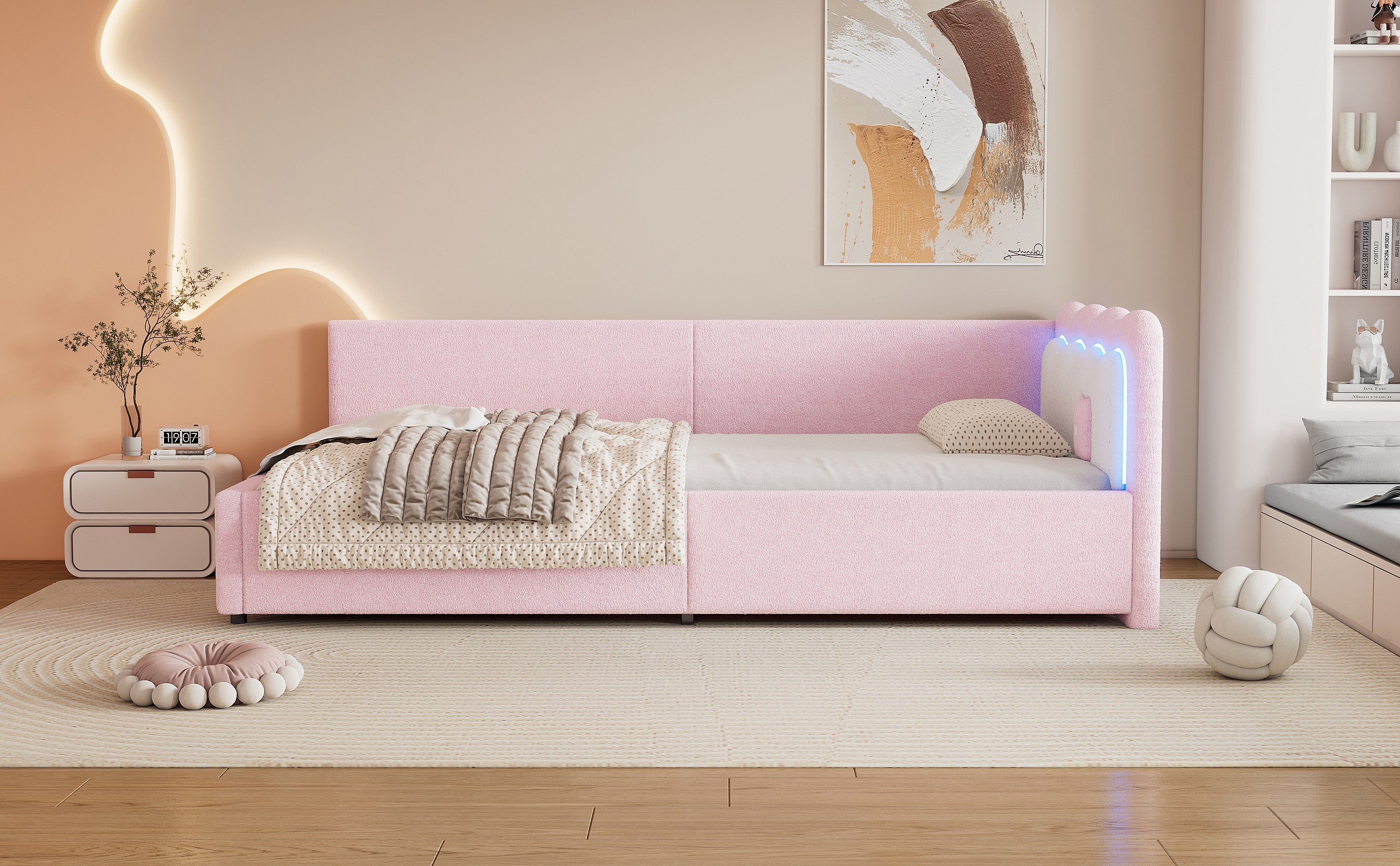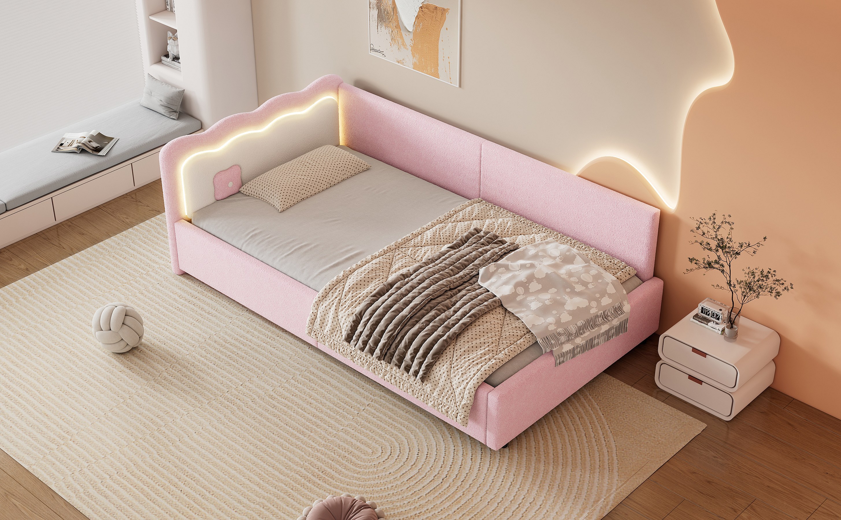 Lit banquette 90x200 cm rose avec LED et télécommande, structure avec sommier, tissu imitation laine doux