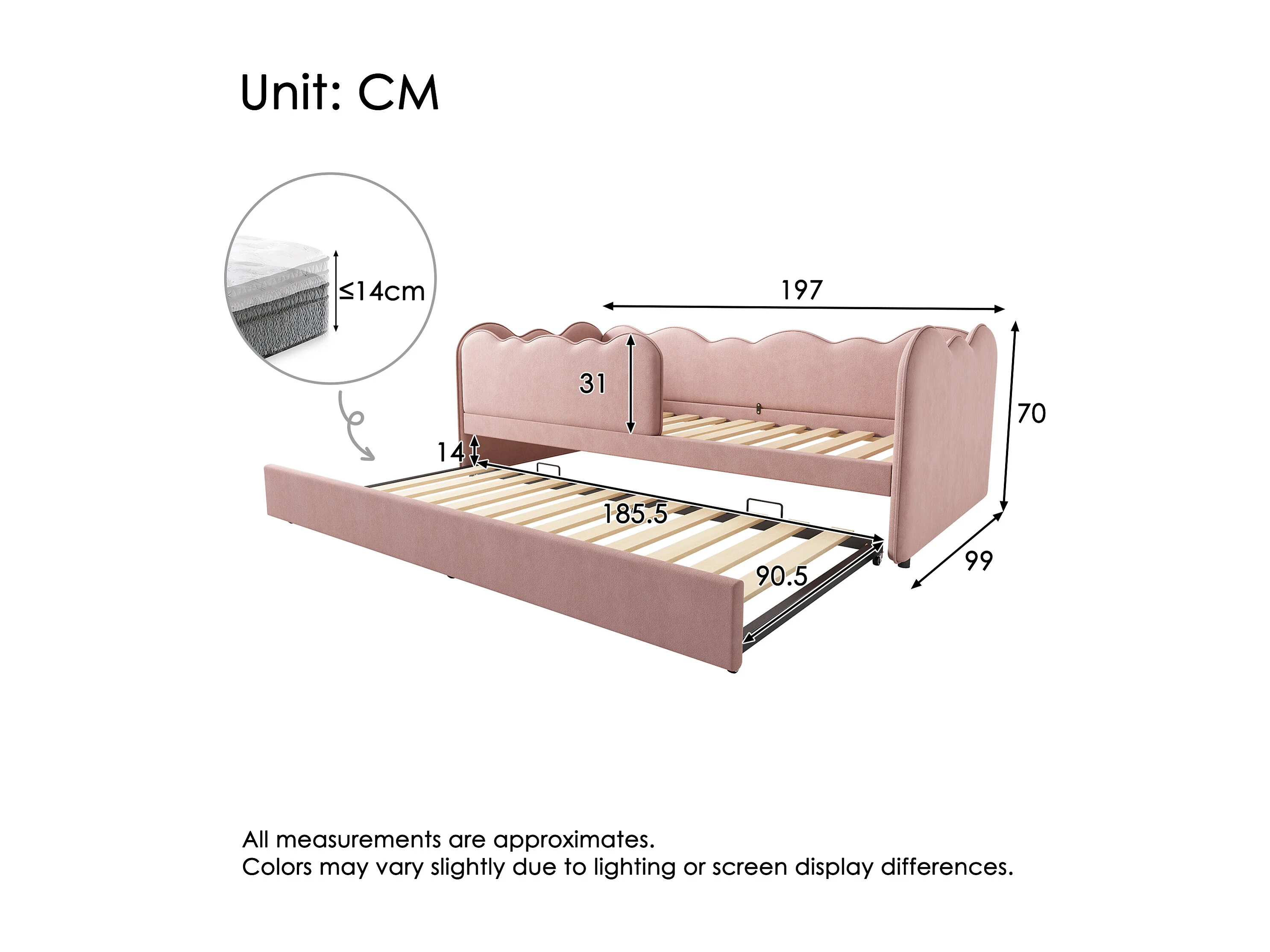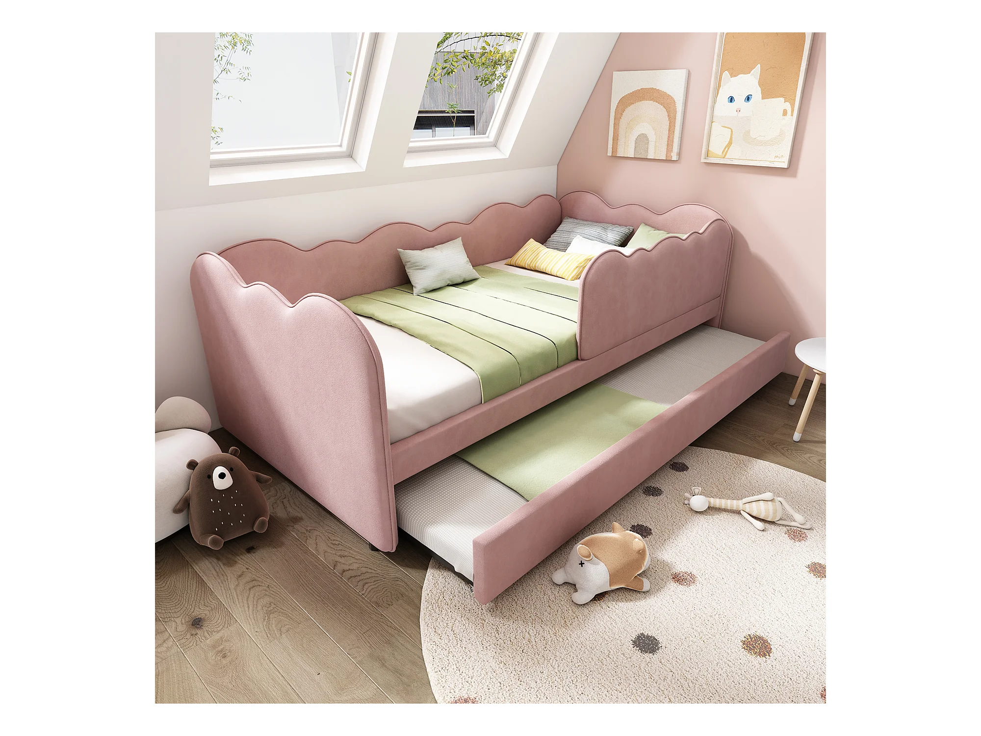 Lit Banquette capitonné 90×190 cm, lit d’appoint extensible pour enfant, velours rose, sans matelas