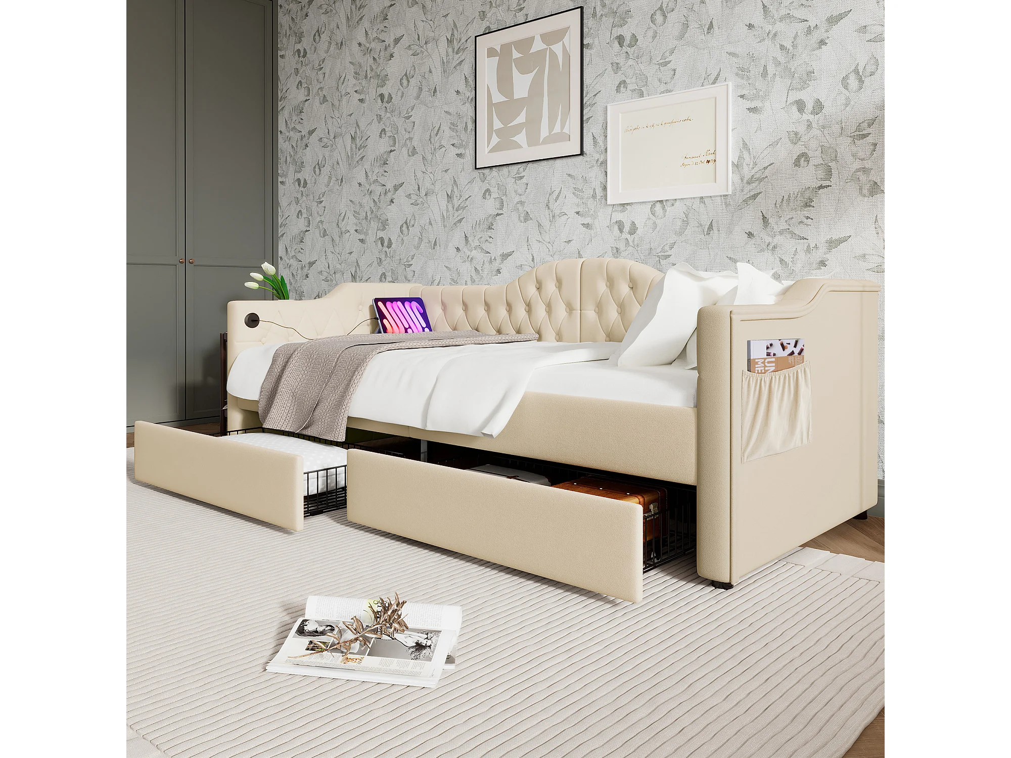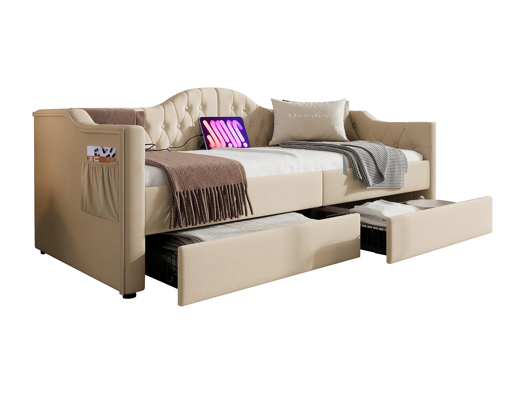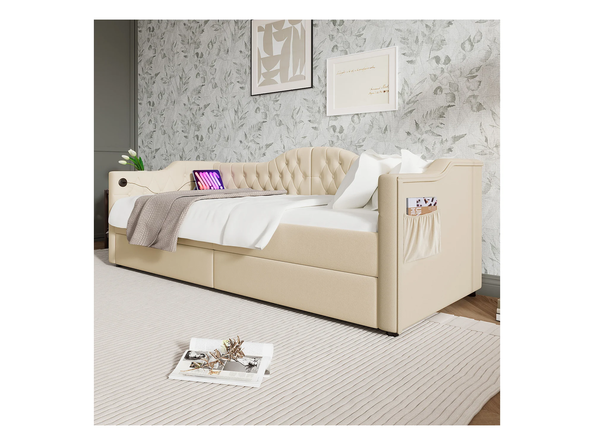 Lit banquette capitonné 90×200 cm, canapé-lit avec 2 tiroirs et ports USB-C, velours beige, sans matelas