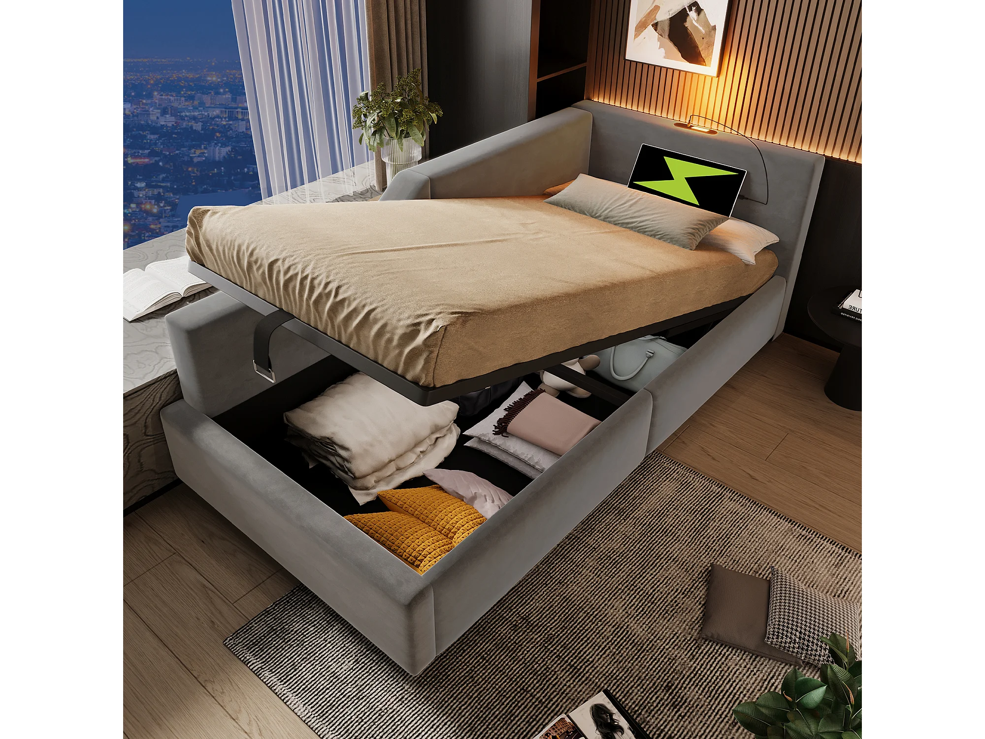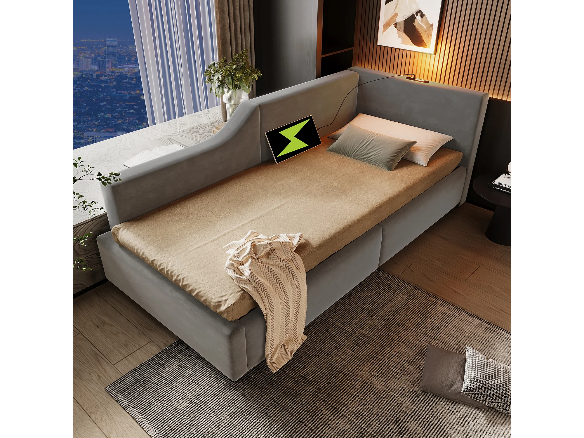 Lit banquette capitonné 90×200 cm, canapé-lit avec coffre hydraulique, lumière de lecture et port USB-C, velours gris, sans matelas