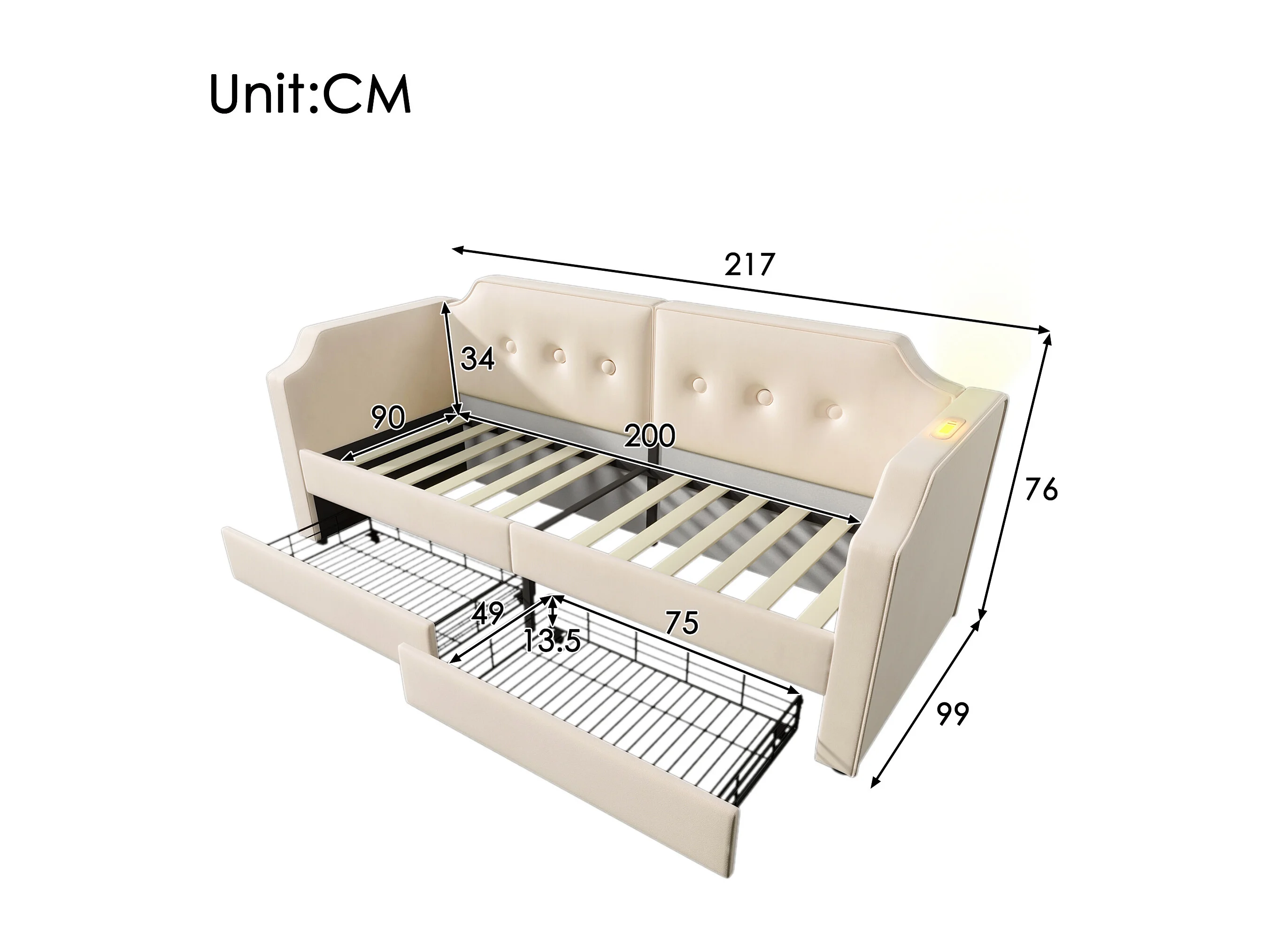 Lit banquette capitonné 90×200 cm, canapé-lit avec lumière de lecture USB-C et 2 tiroirs, velours beige, sans matelas