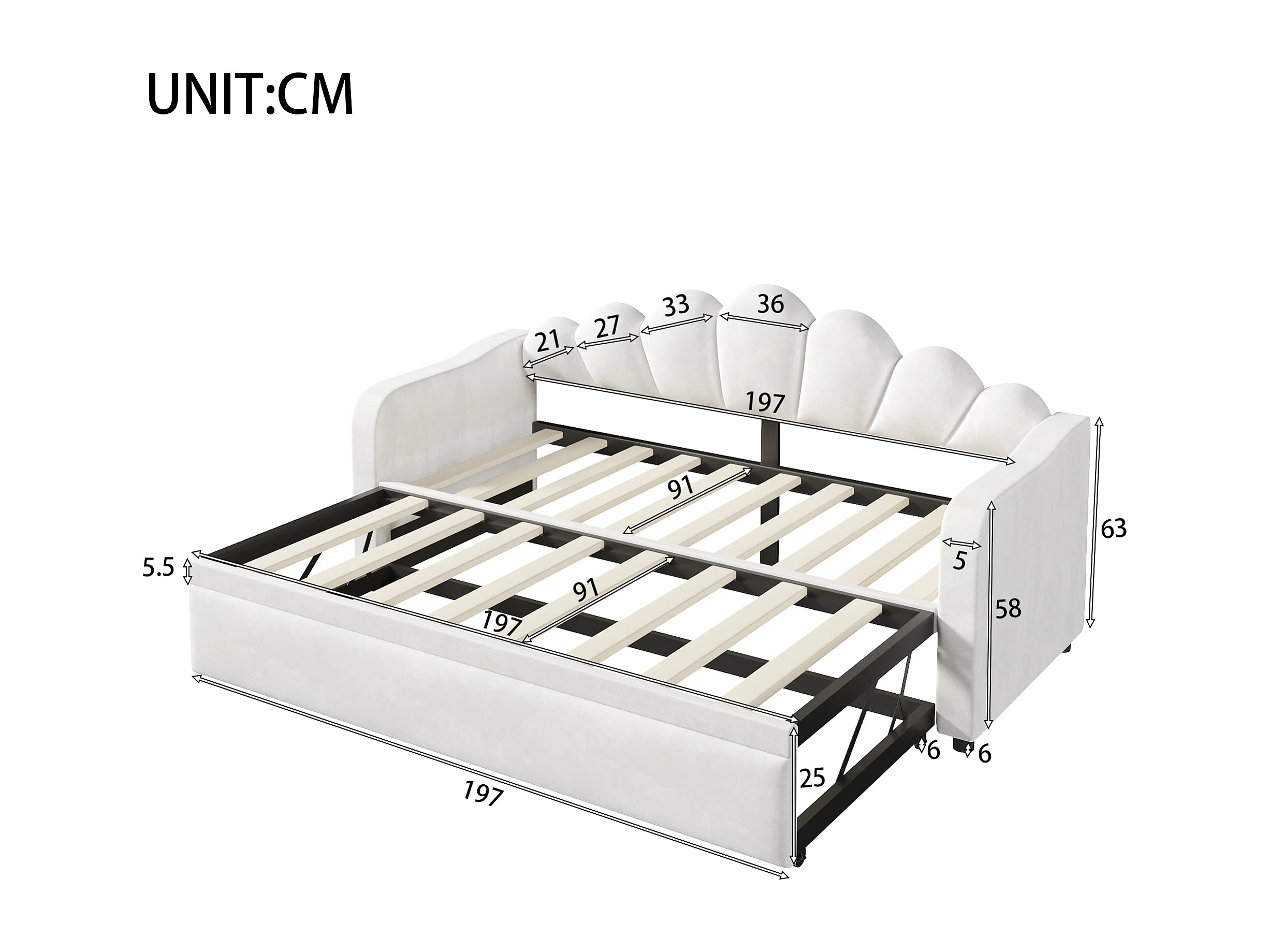 Lit banquette capitonnée gigogne - 90/180 x 200 cm - avec Leds - MDF - blanc