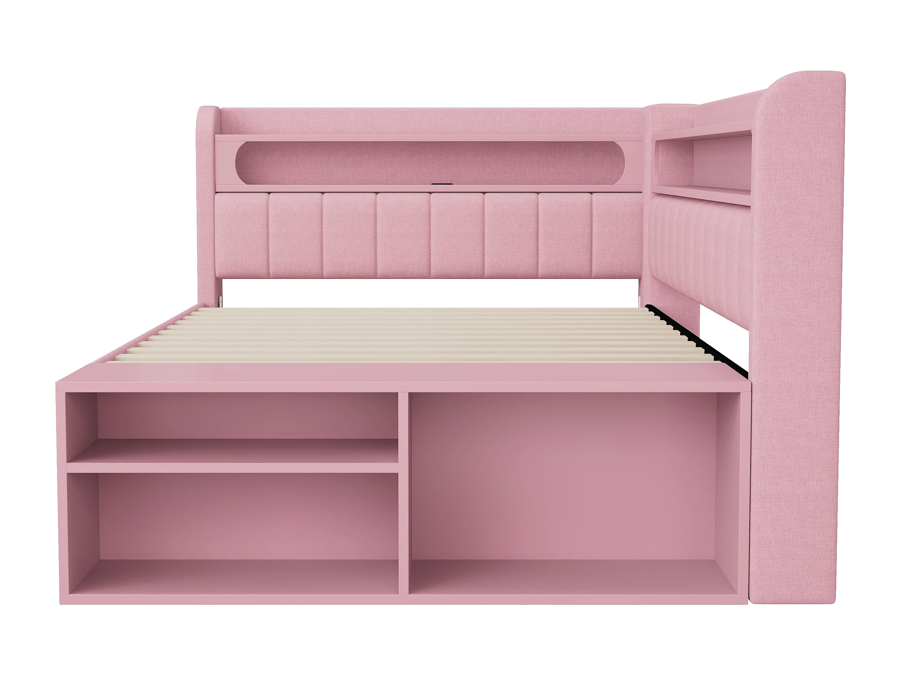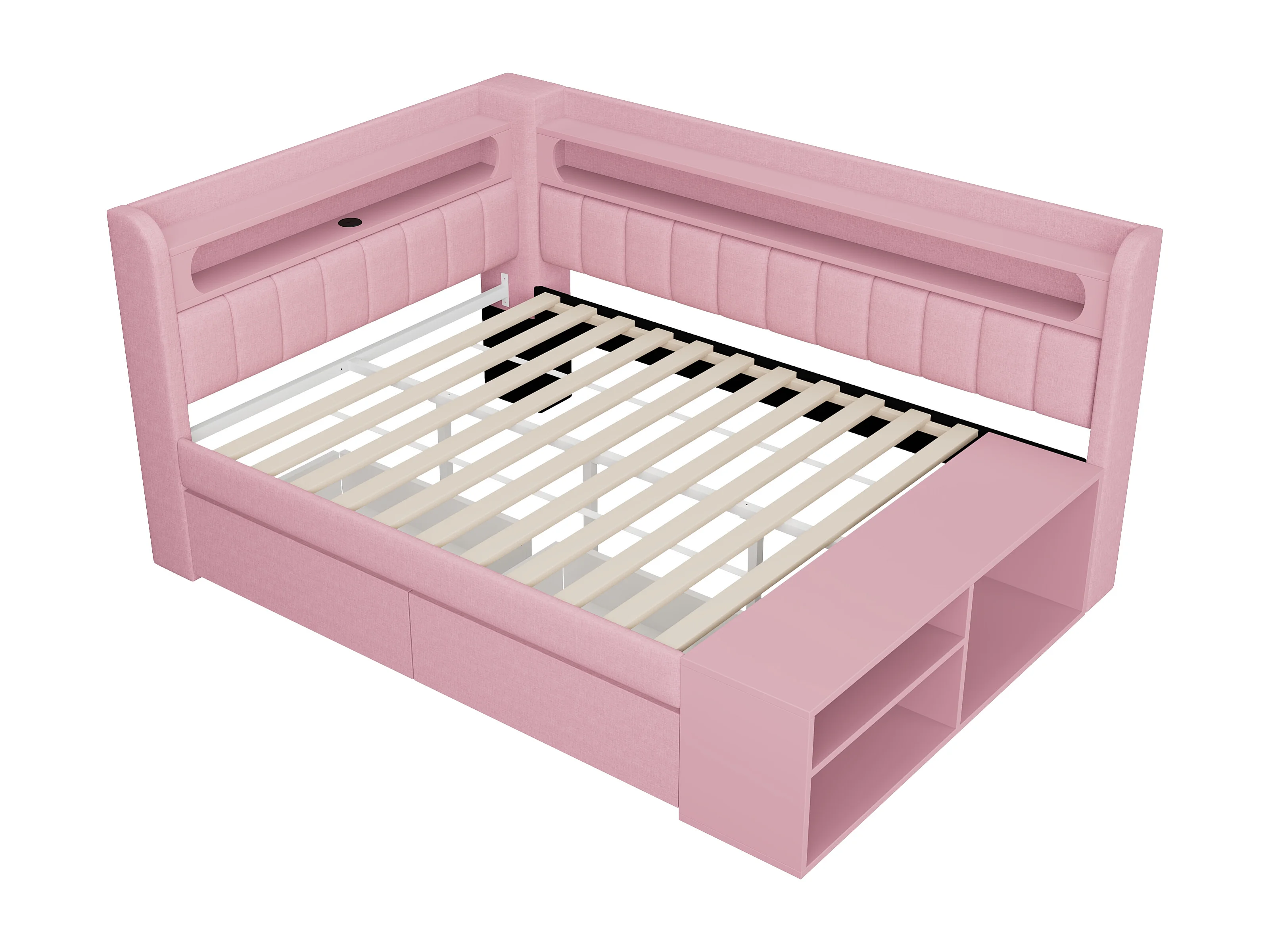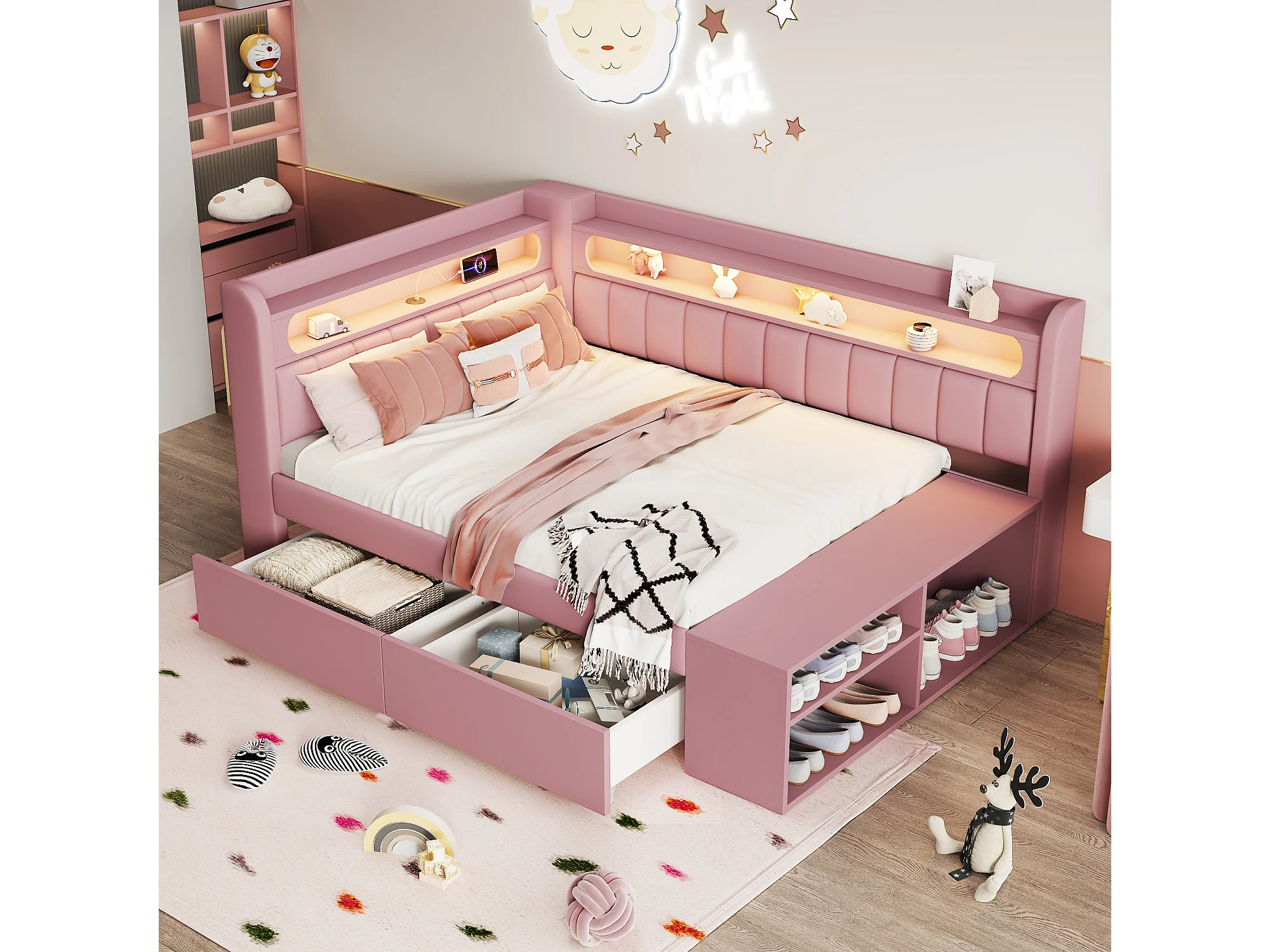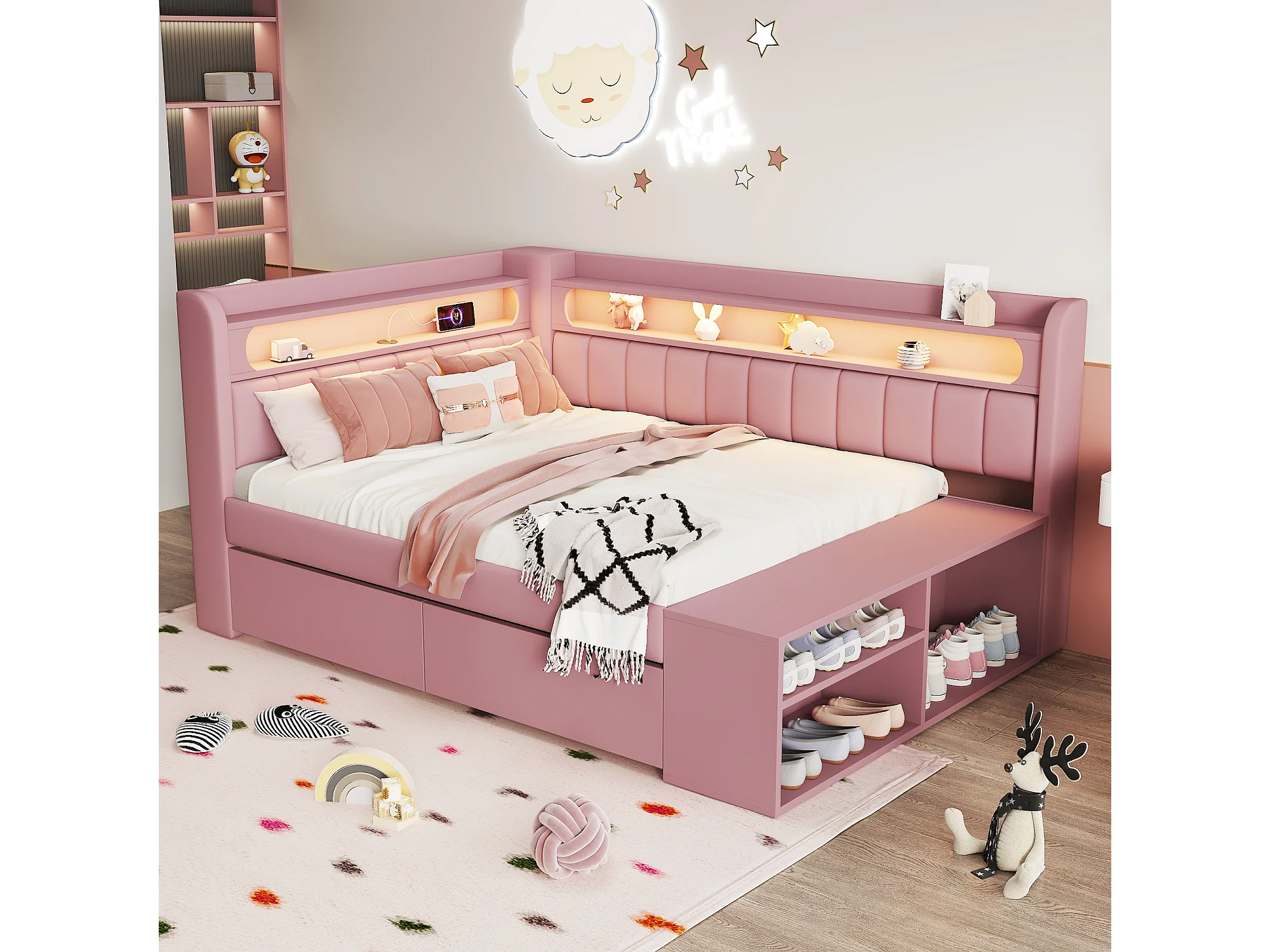 Lit banquette coffre enfant - 90 x 200 cm - avec USB + Leds + étagère + meuble à chaussures + 2 tiroirs - MDF - rose