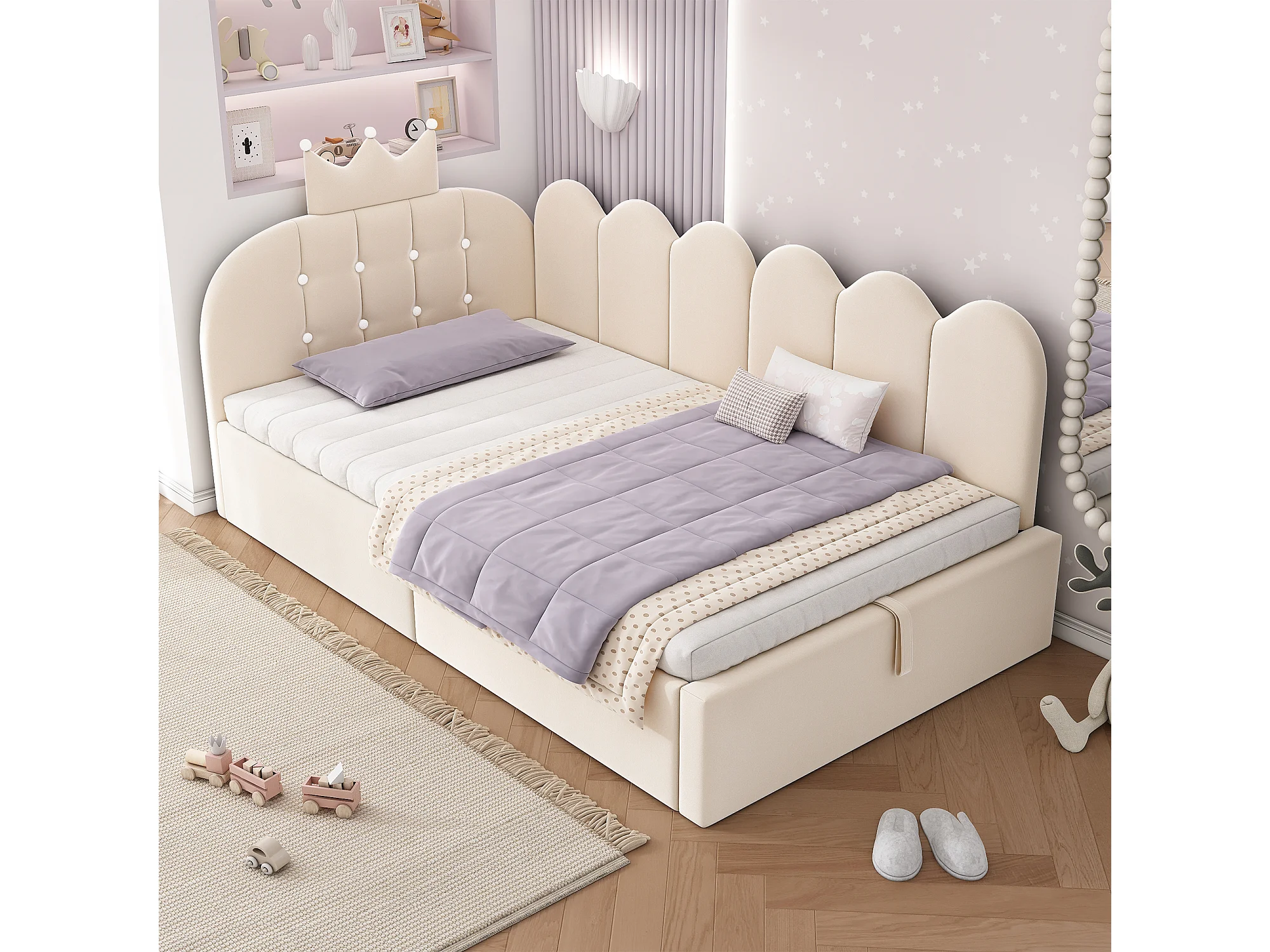 Lit banquette coffre pour enfant - 90 x 200 cm - avec tête de lit + rangement hydraulique - velours - beige