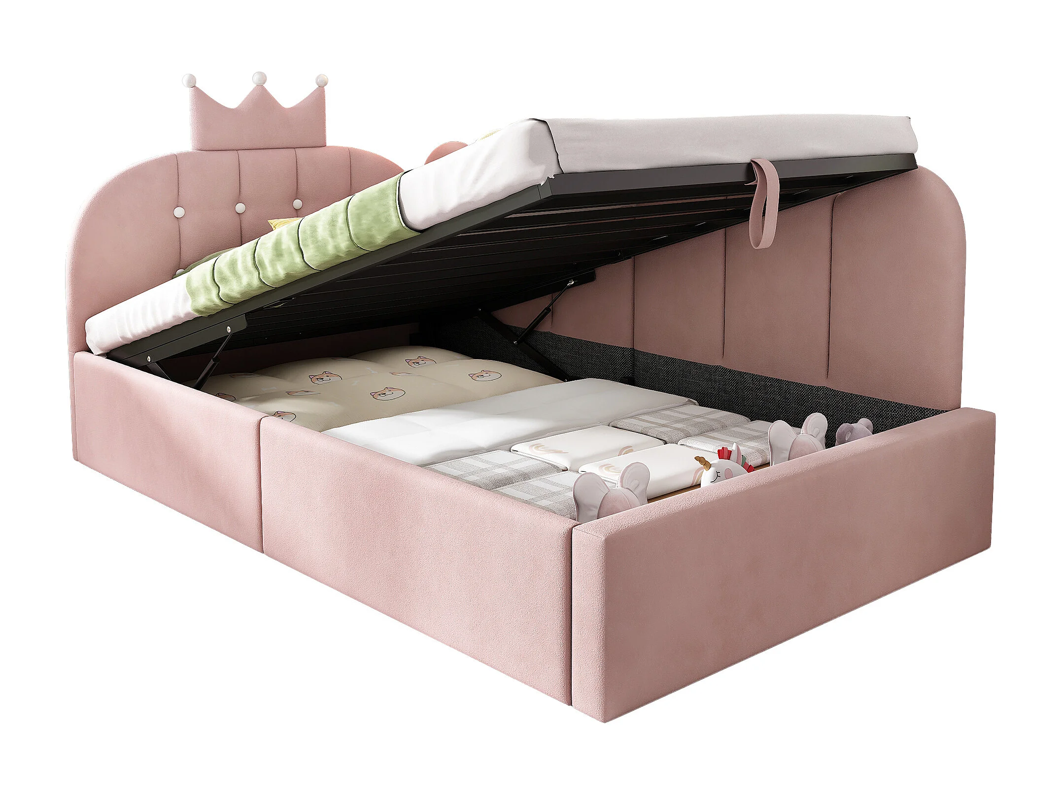 Lit banquette coffre pour enfant - 90 x 200 cm - avec tête de lit + rangement hydraulique - velours - rose