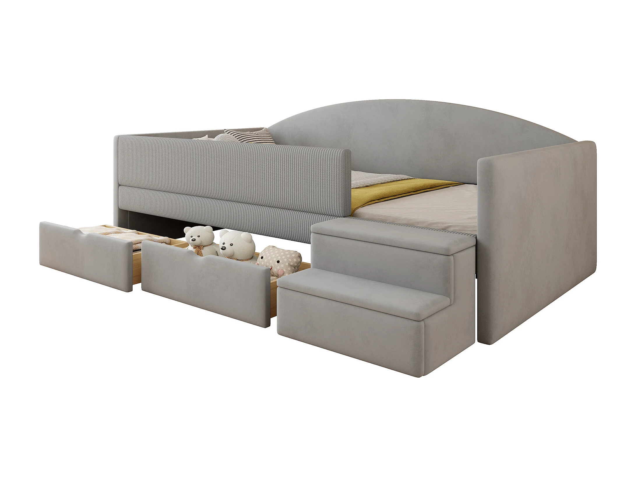 Lit banquette enfant 90 x 190 cm avec 2 tiroirs, barres de sécurité et marchepied -Velours gris clair, sans matelas