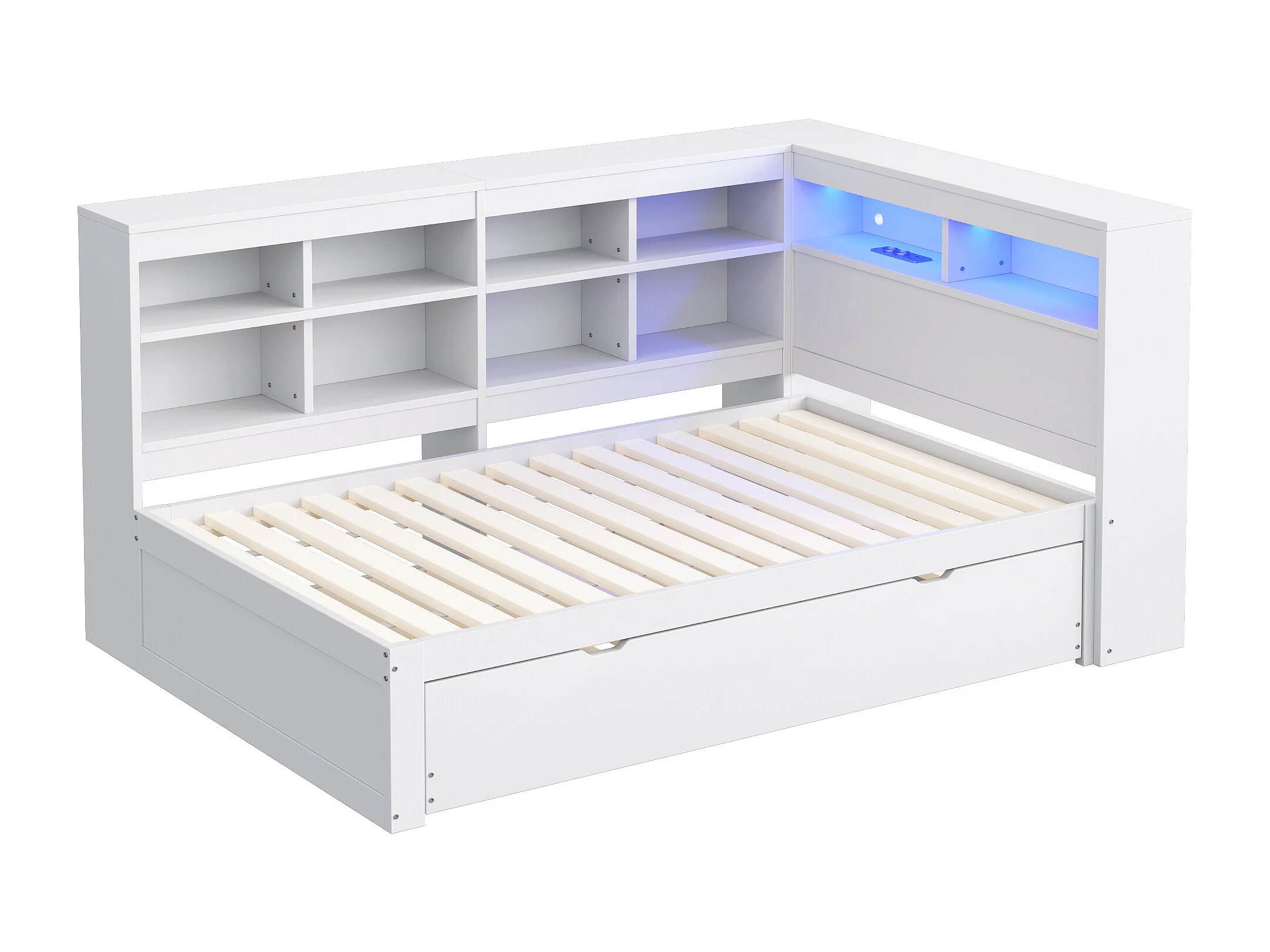 Lit banquette enfant 90 x 200 cm avec lit gigogne 90x190cm - prise USB, LED et rangement - Blanc