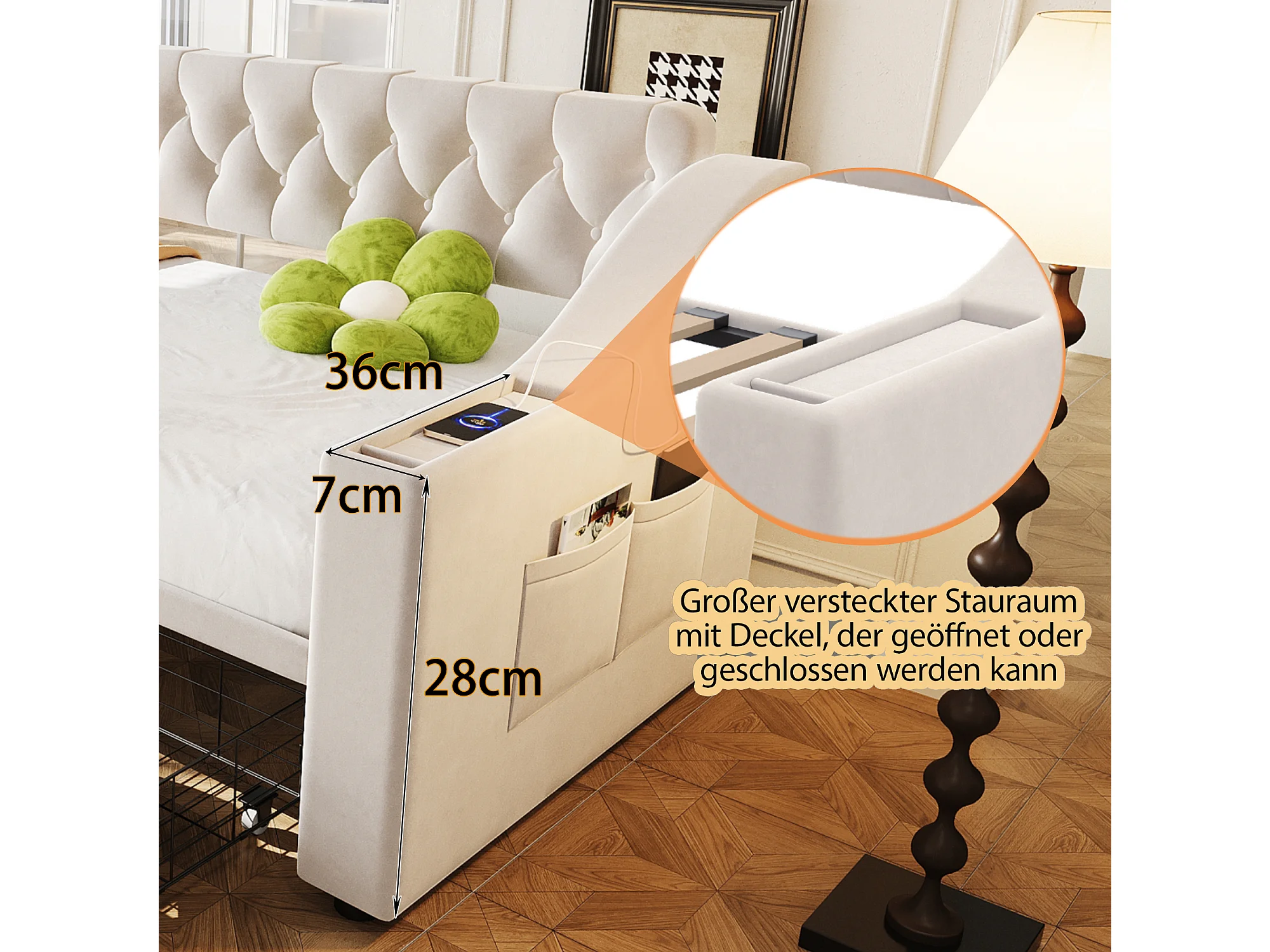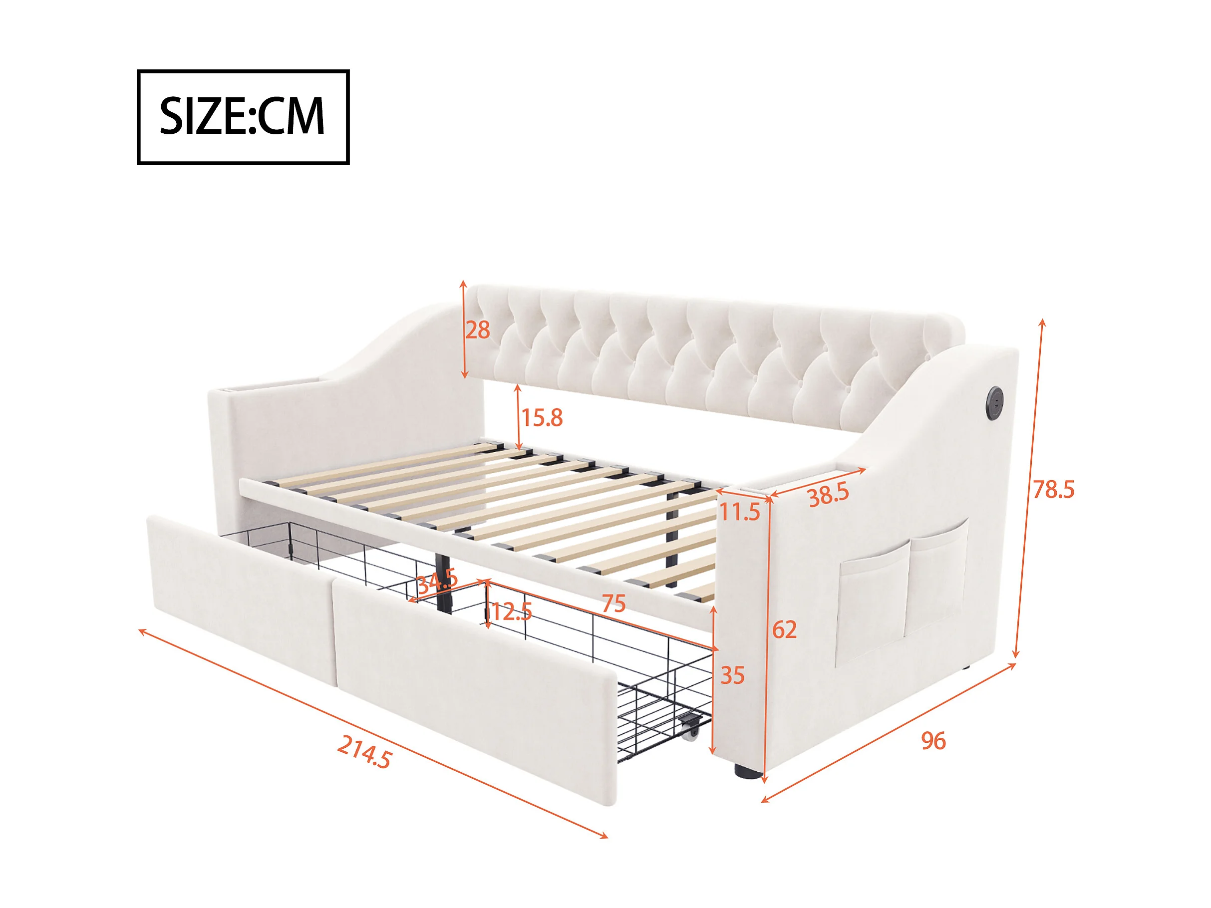 Lit banquette enfant 90x190 cm avec ports USB/Type-C et 2 tiroirs - Velours beige