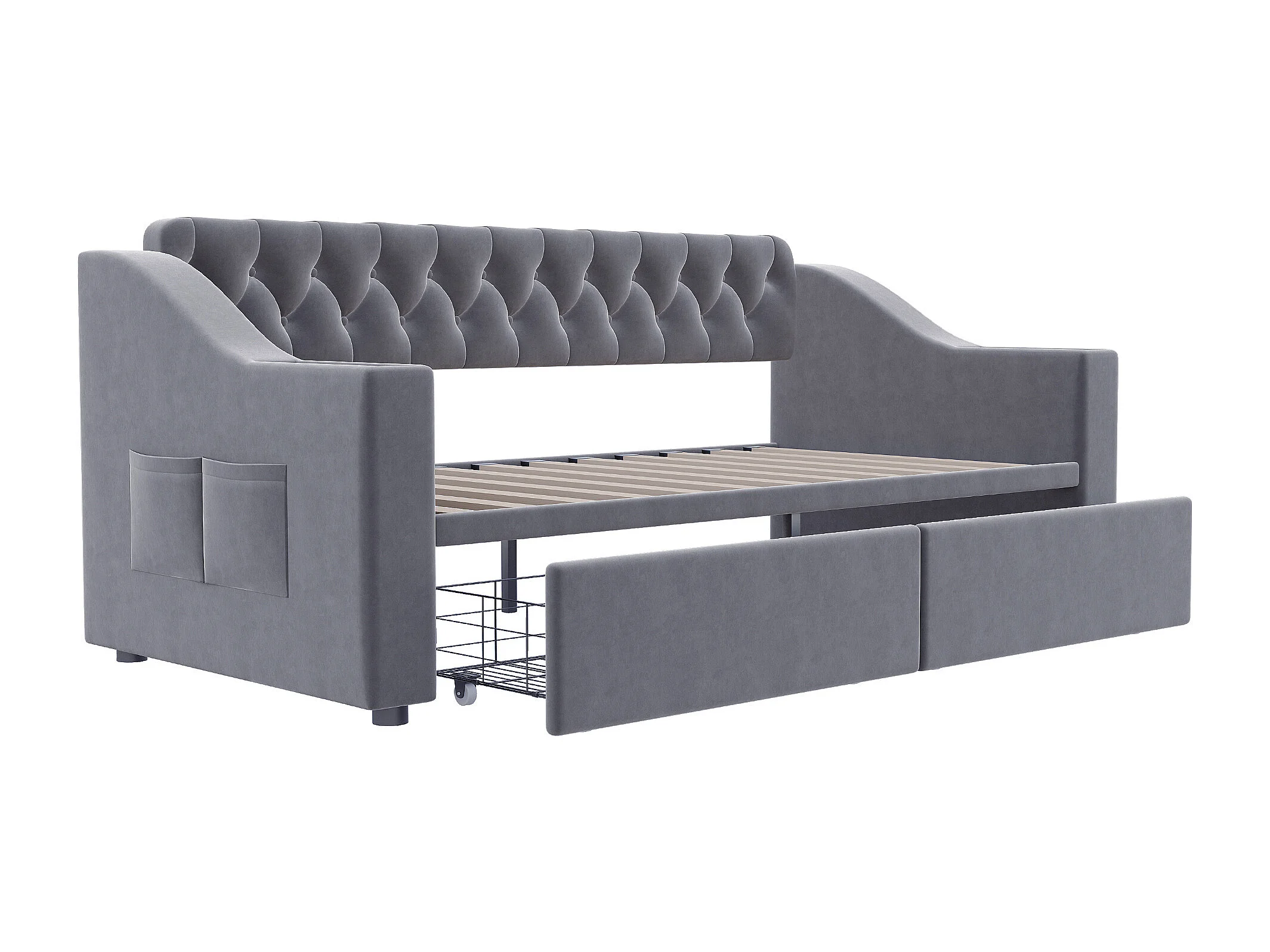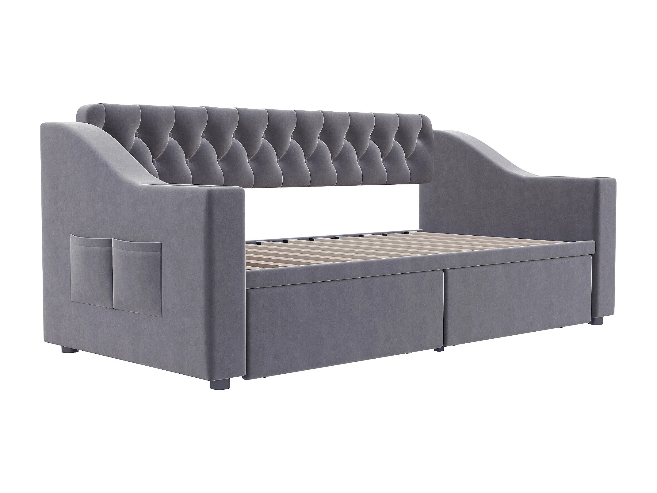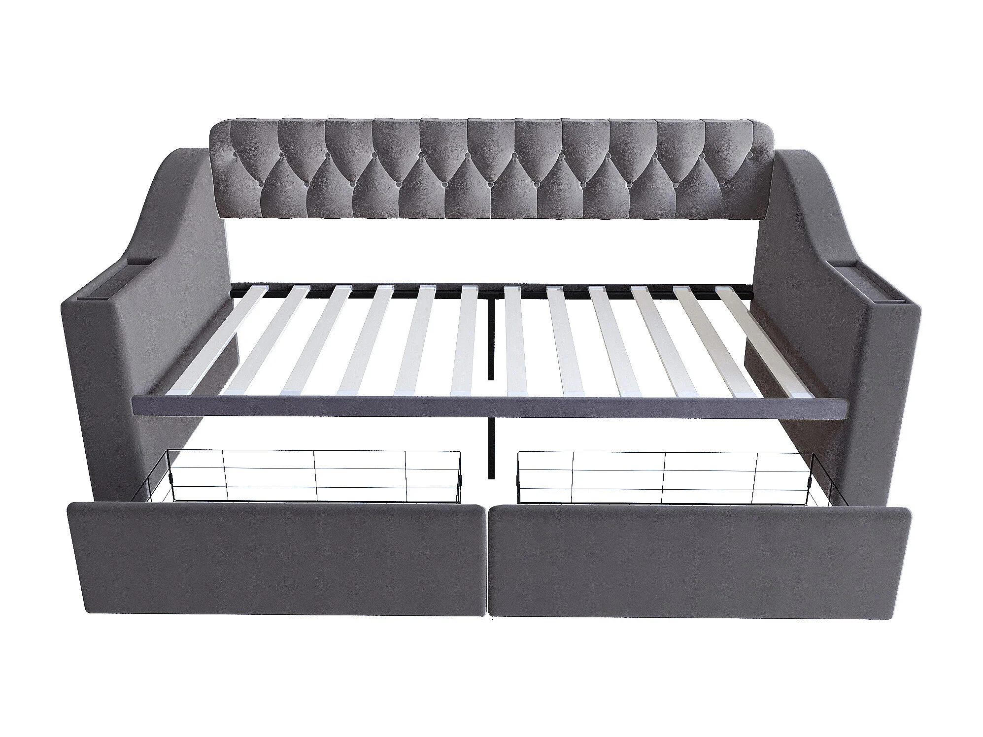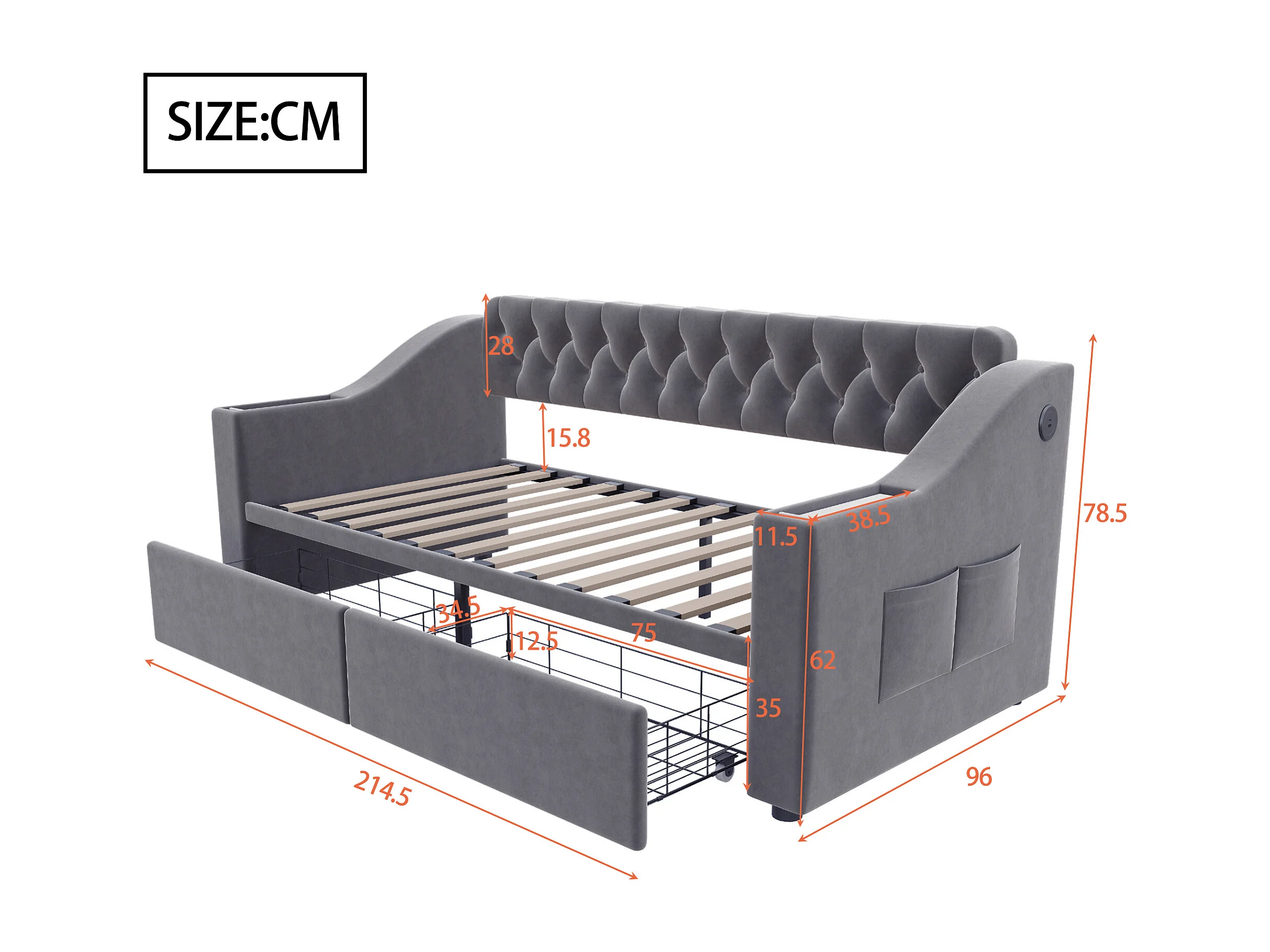 Lit banquette enfant 90x190 cm avec ports USB/Type-C et 2 tiroirs - Velours gris foncé