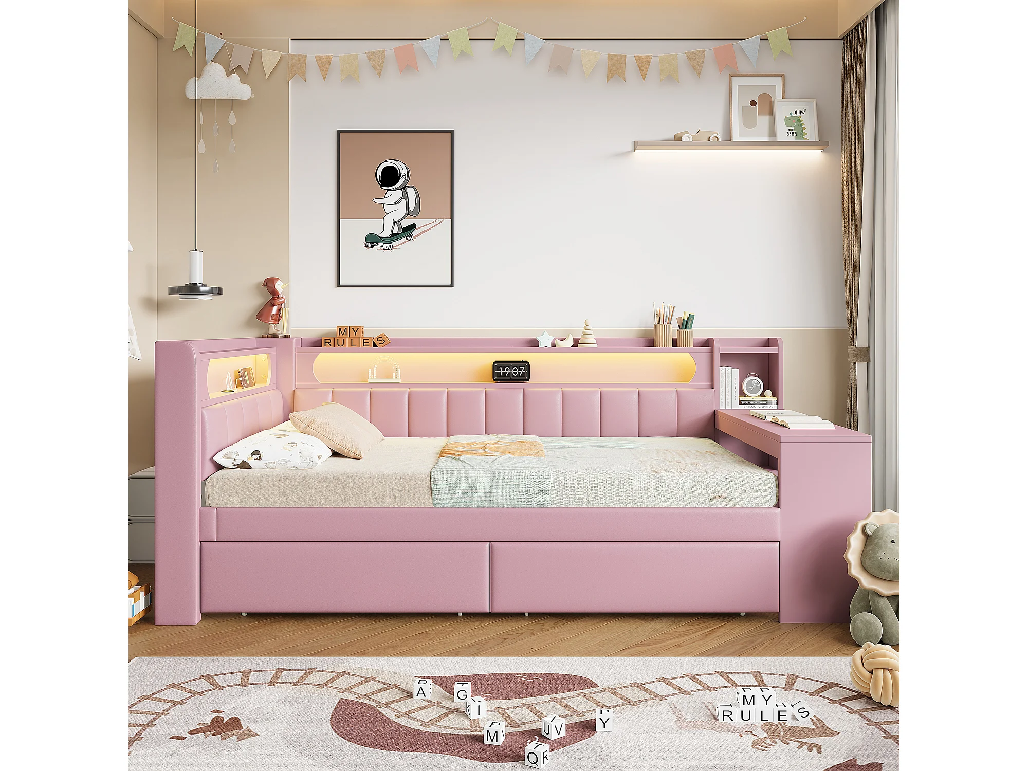 Lit banquette enfant 90x200 cm avec ports USB et LED bureau - Lit capitonné avec 2 tiroirs - Rose