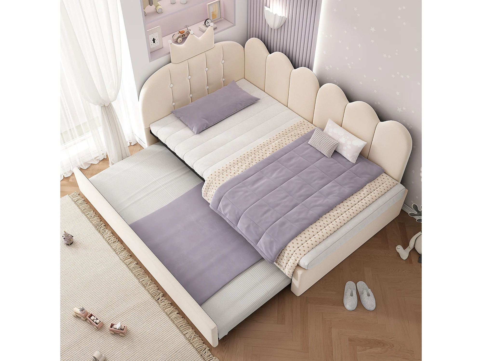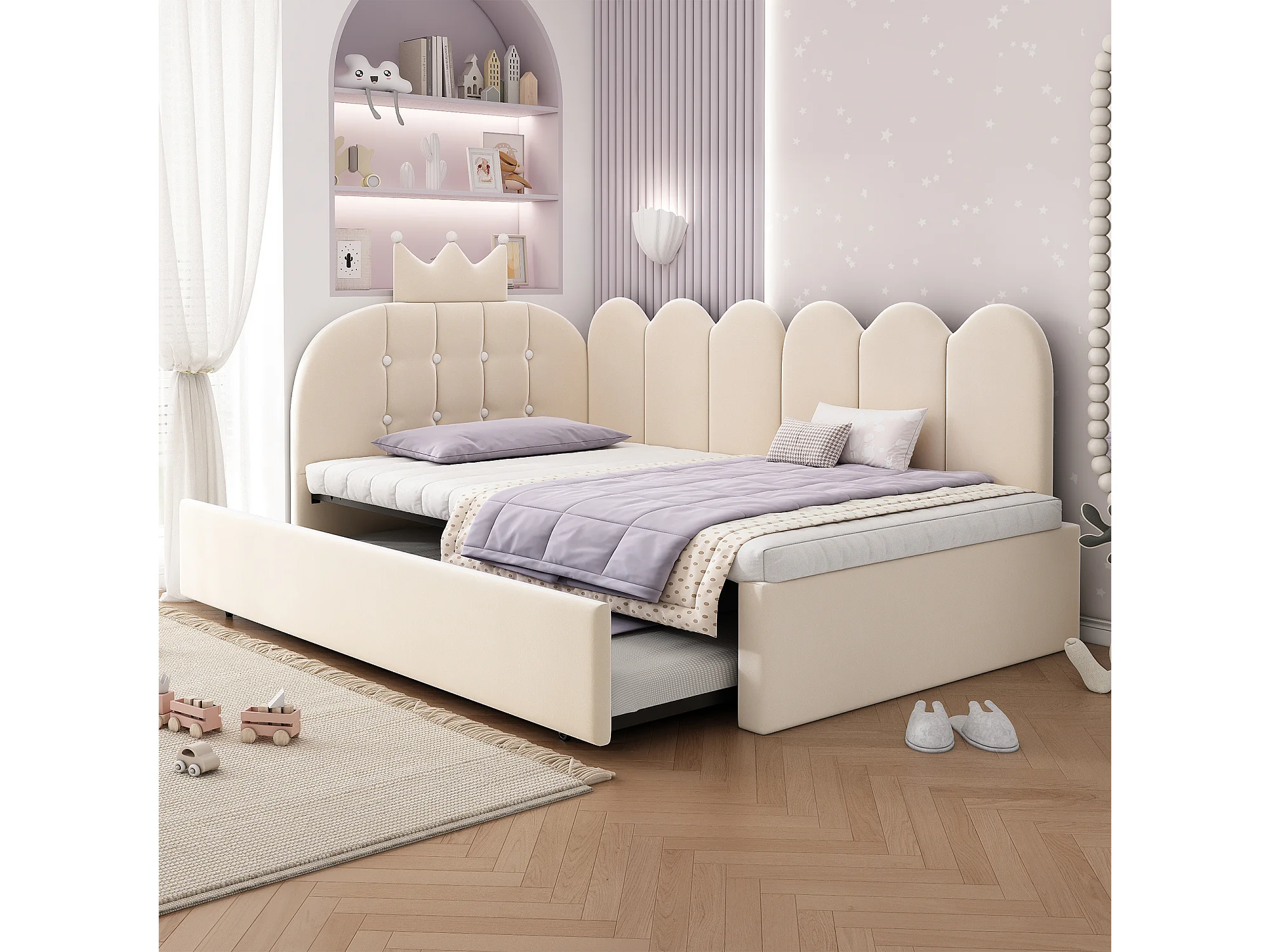 Lit banquette gigogne pour enfant - 90 x 200 cm + 90 x 190 cm - forme en L - tête de lit - velours - beige