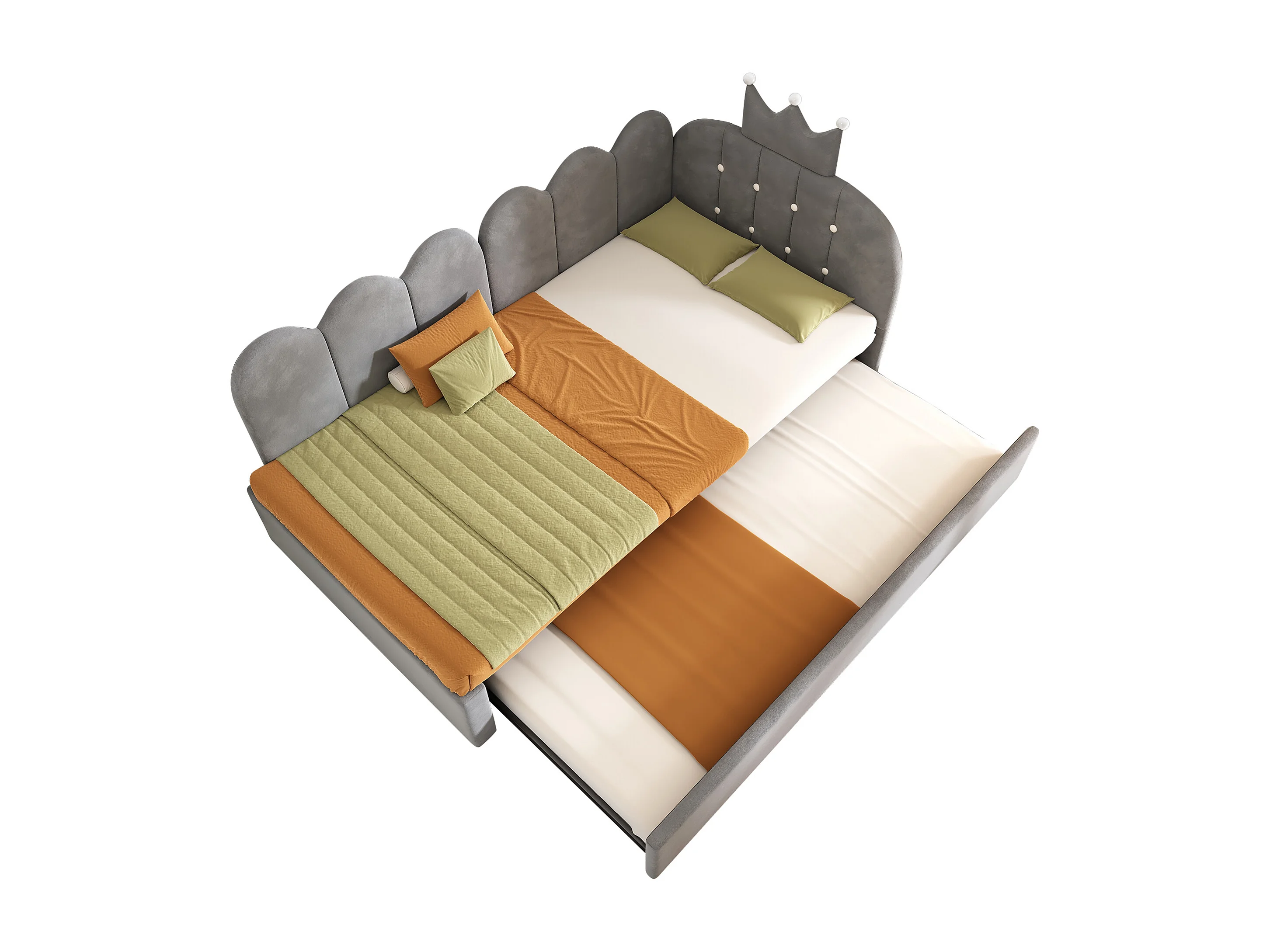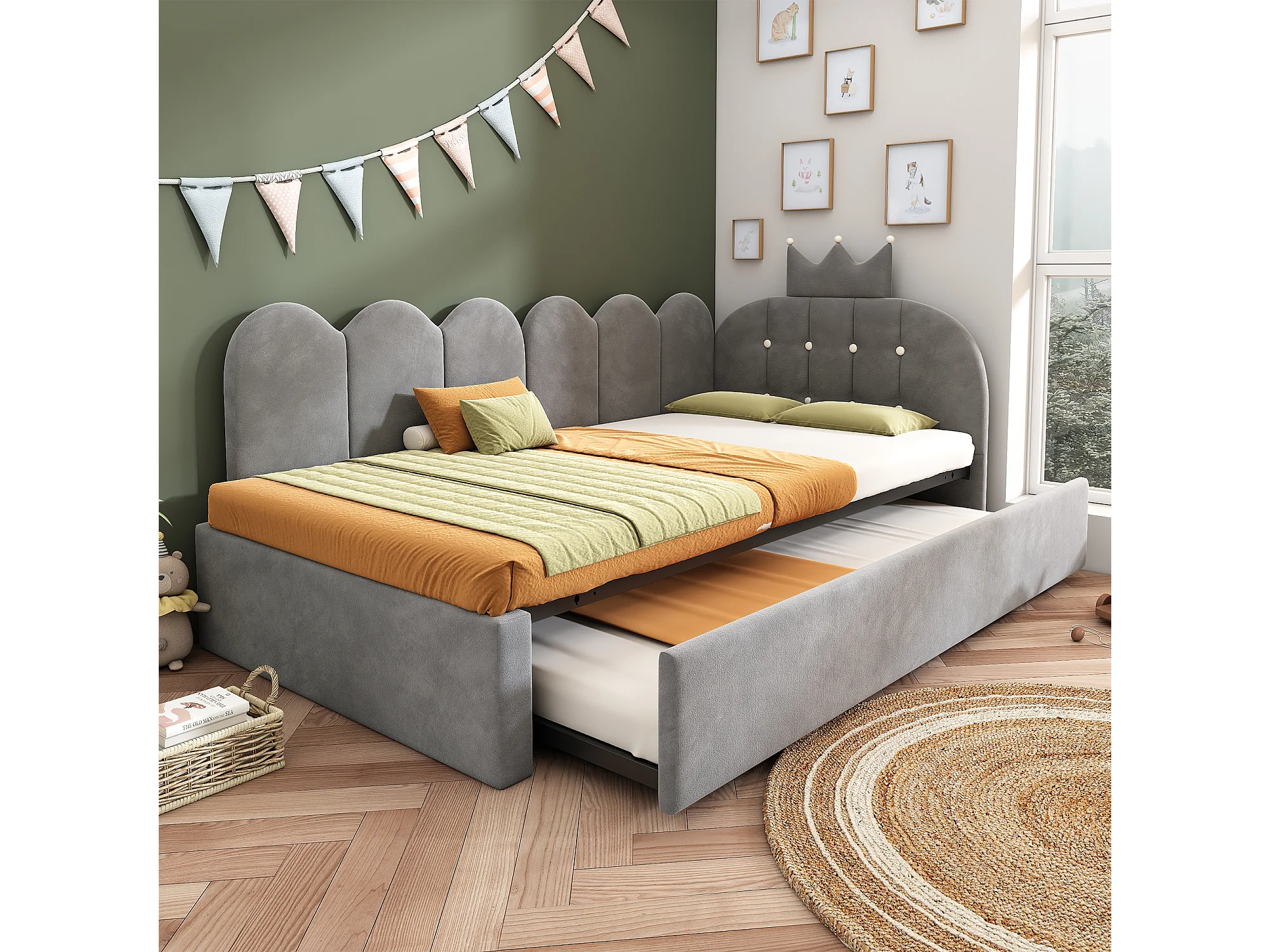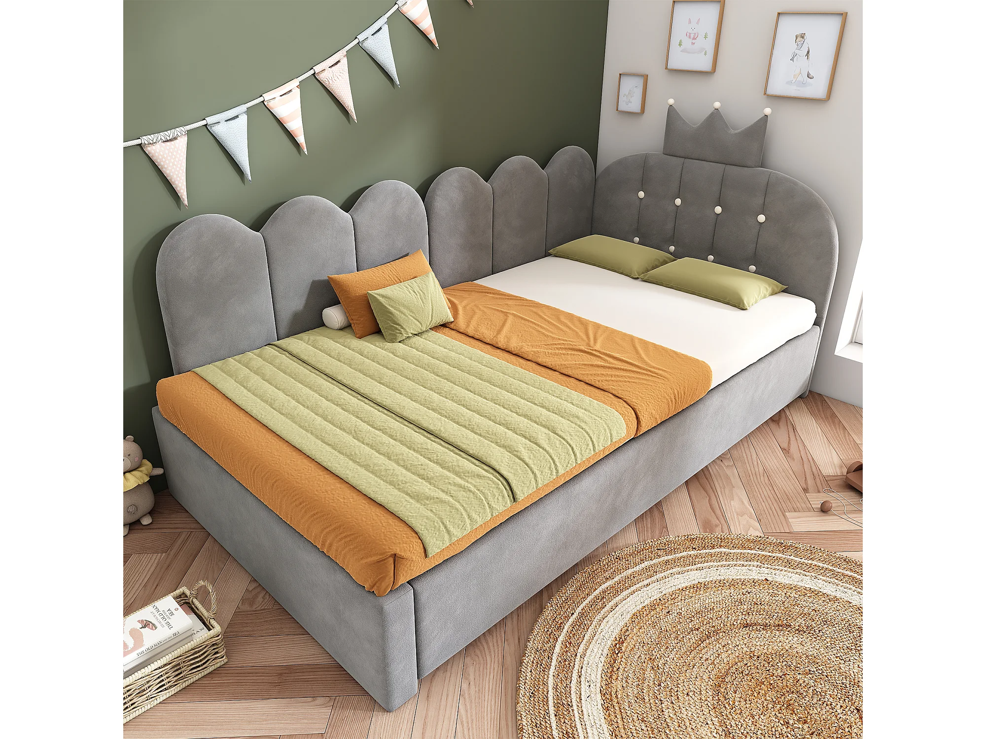 Lit banquette gigogne pour enfant - 90 x 200 cm + 90 x 190 cm - forme en L - tête de lit - velours - gris