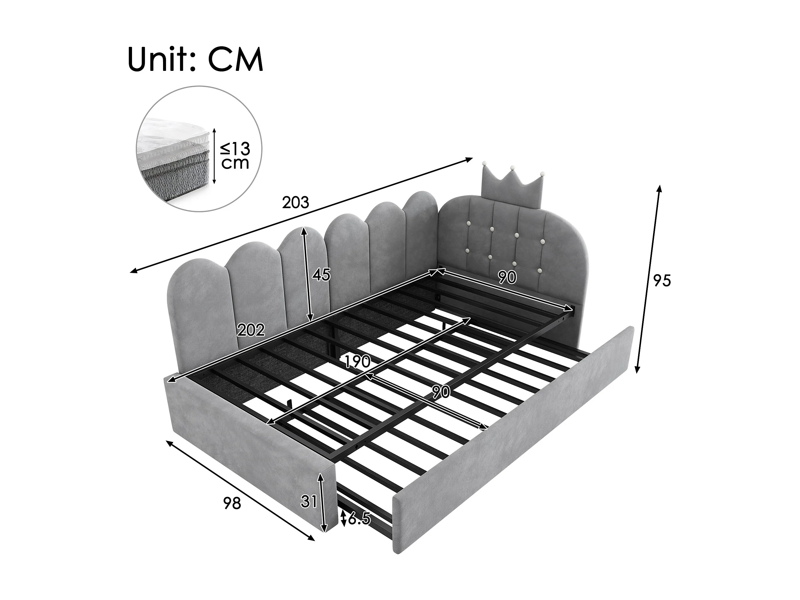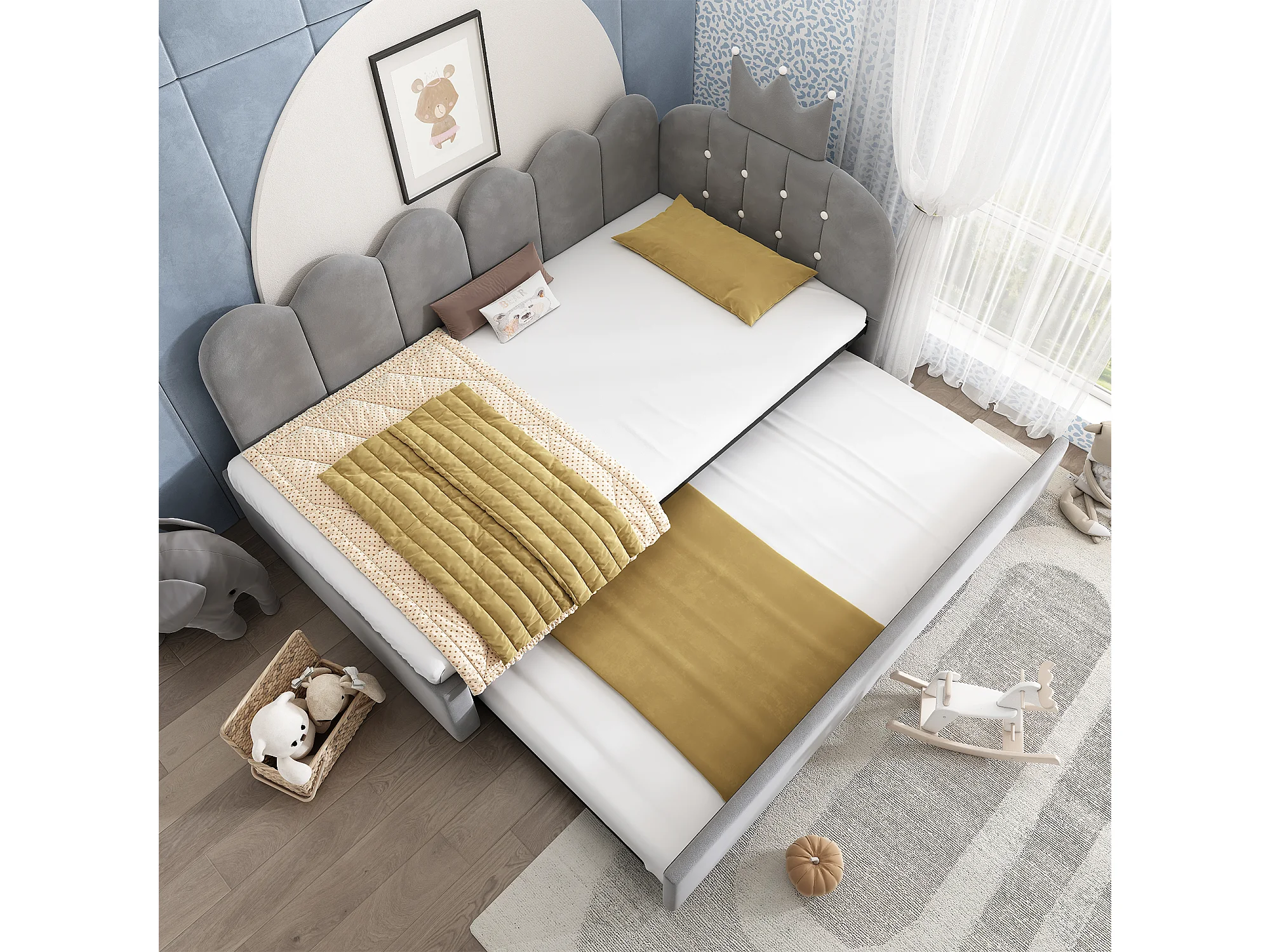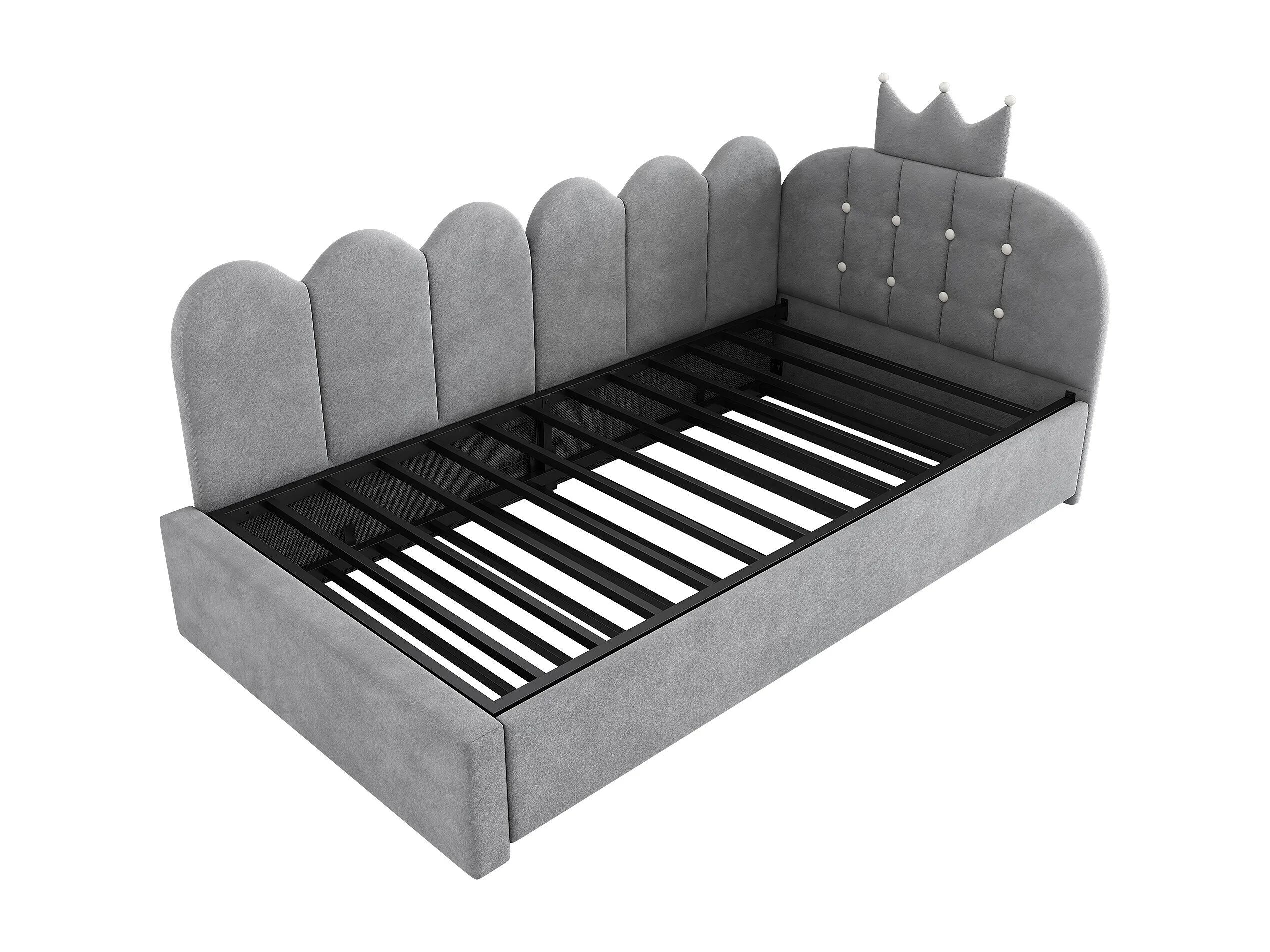 Lit banquette gigogne pour enfant - 90 x 200 cm + 90 x 190 cm - forme en L - tête de lit - velours - gris