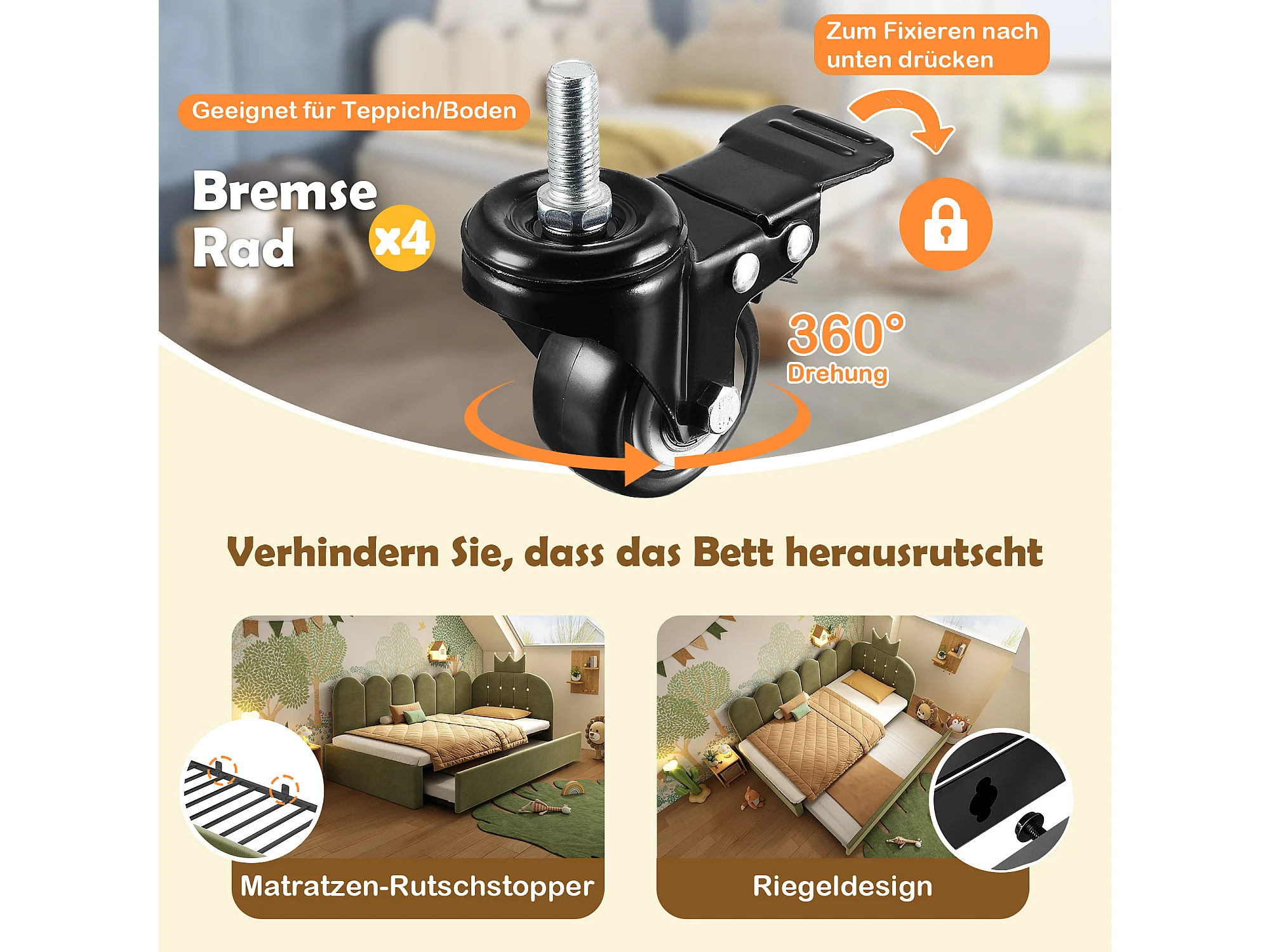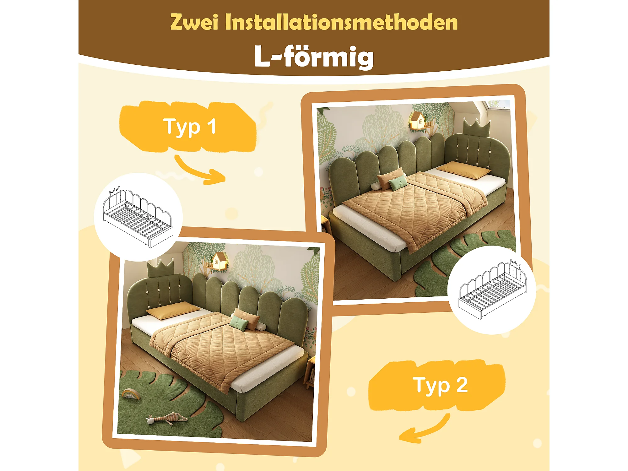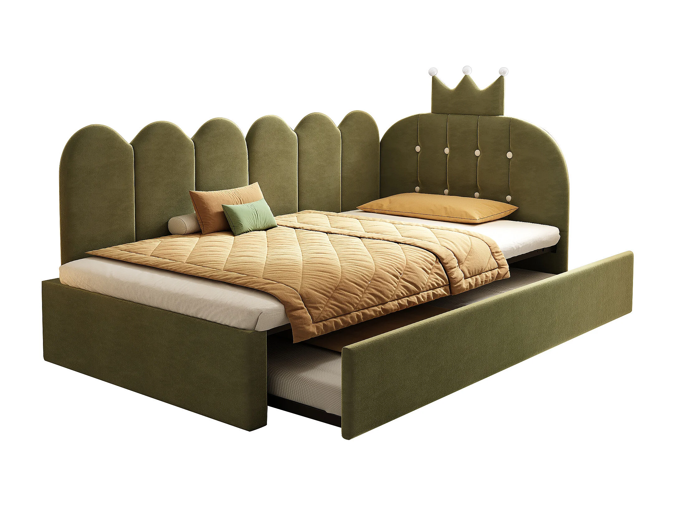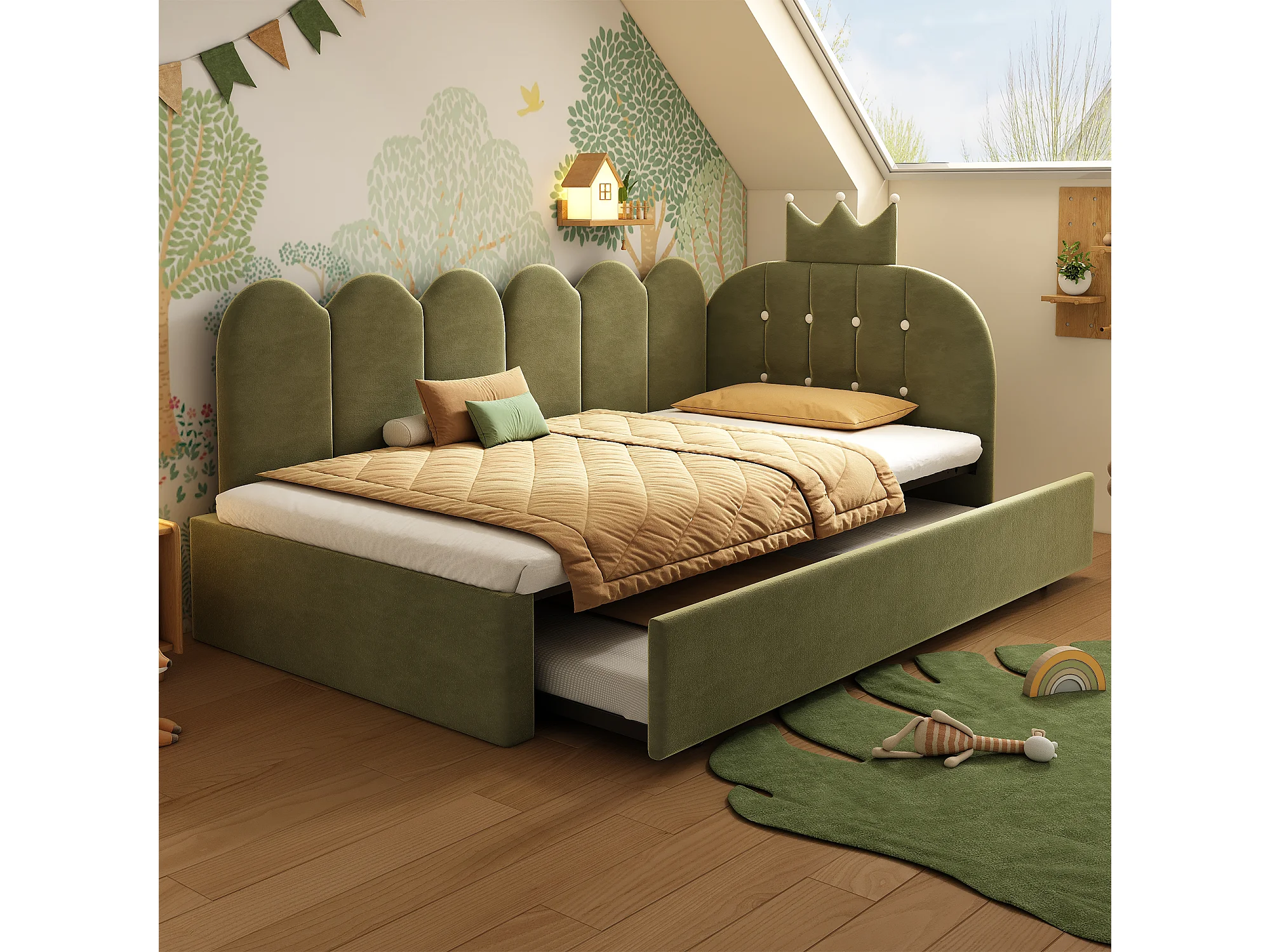 Lit banquette gigogne pour enfant - 90 x 200 cm + 90 x 190 cm - forme en L - tête de lit - velours - vert