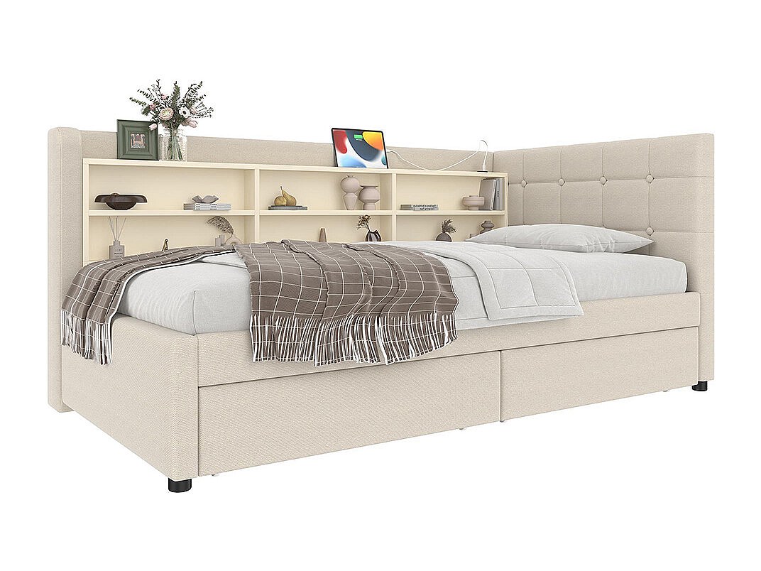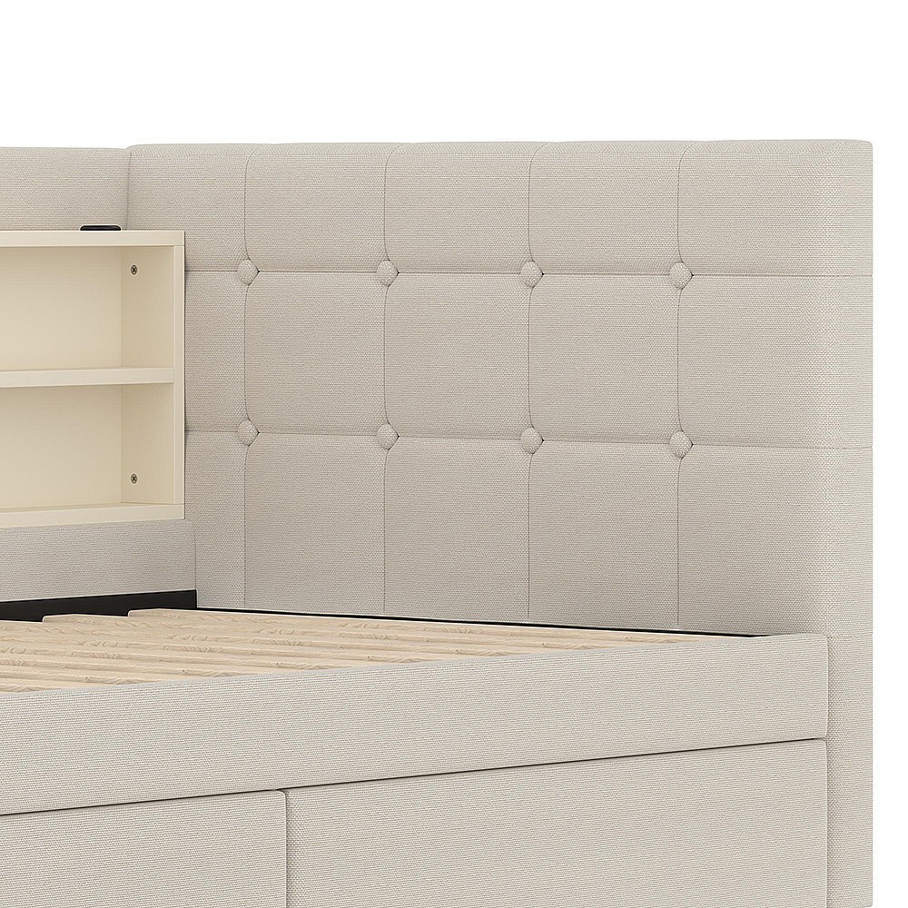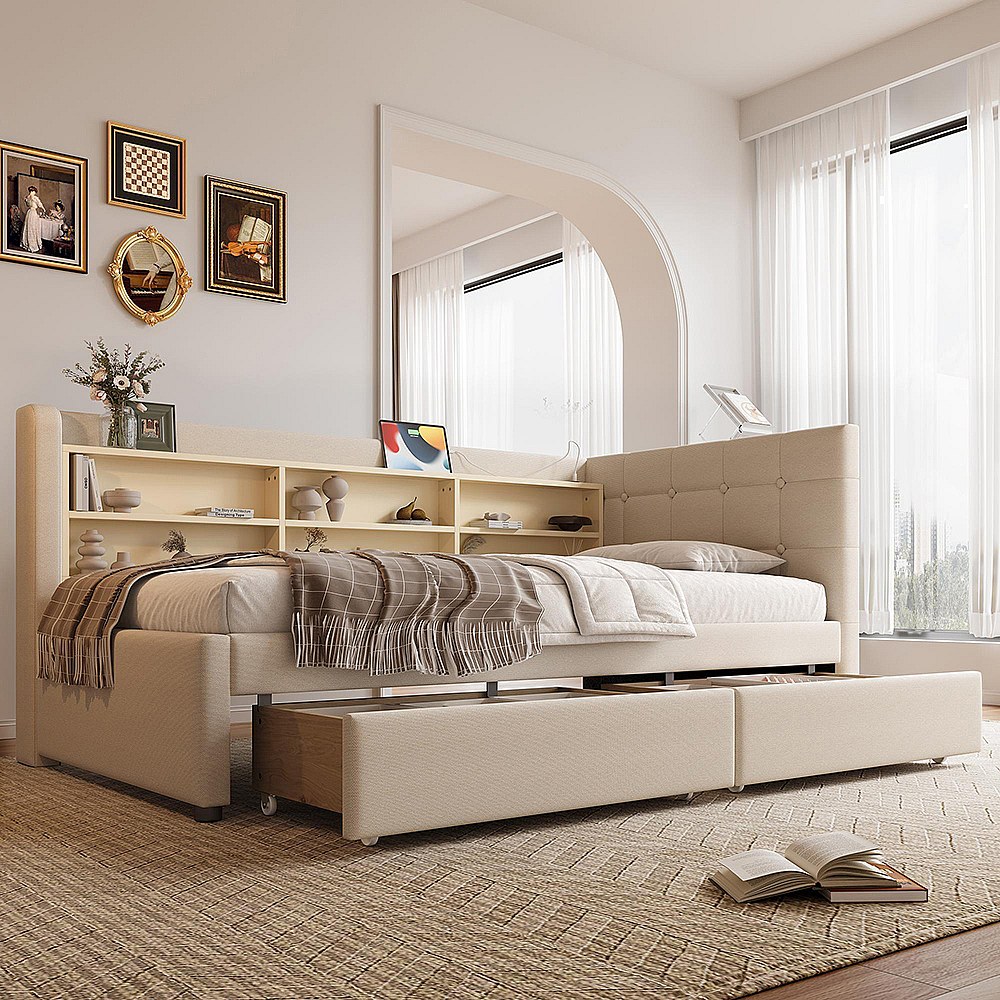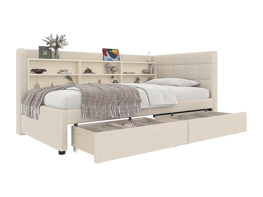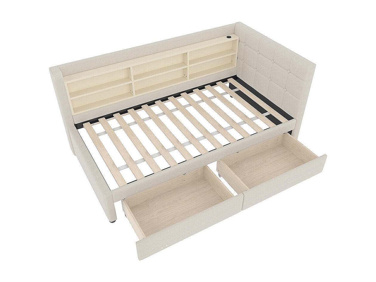 Lit banquette lit de jour convertible 90x200 cm avec 2 tiroirs ports USB Type-C rangement sommier à lattes sans matelas lin beige