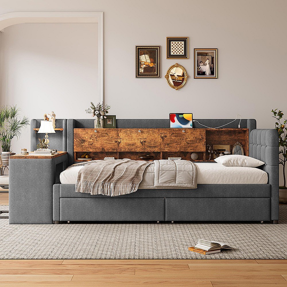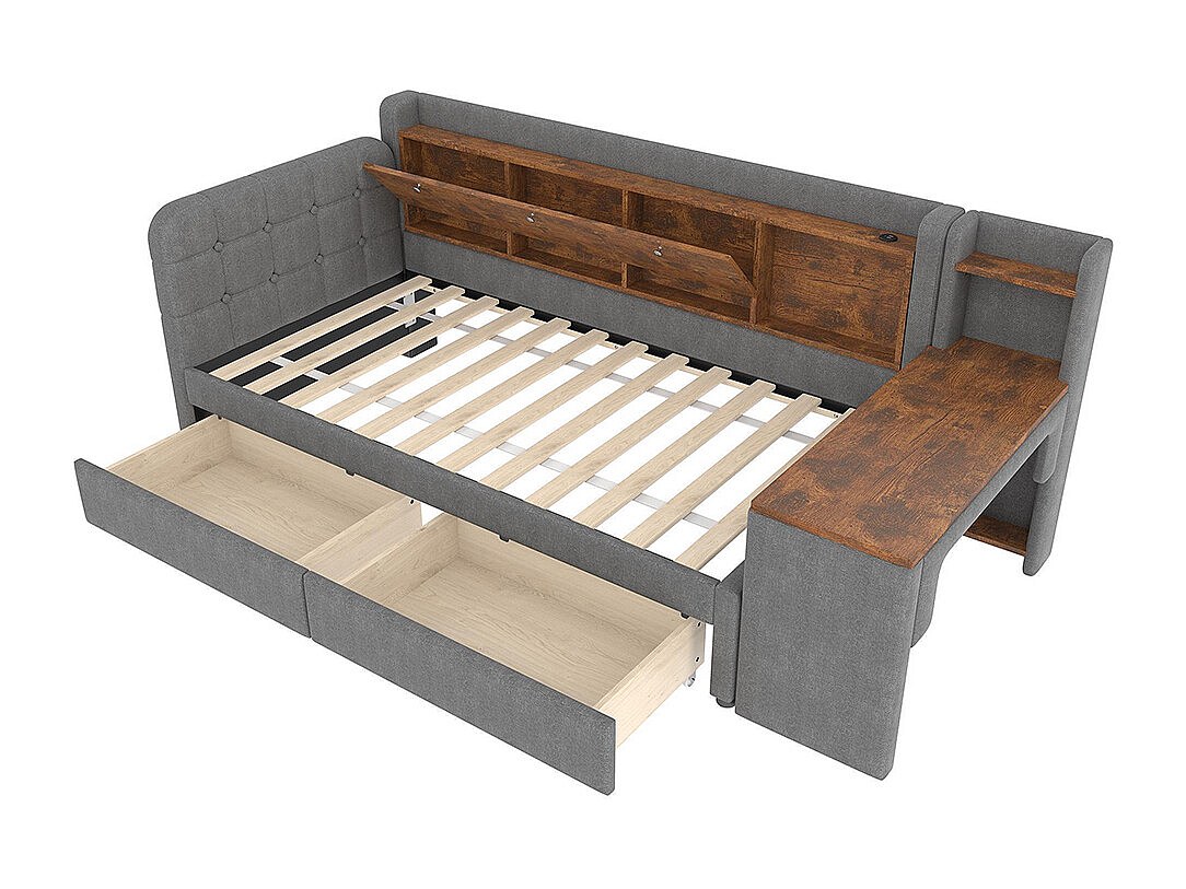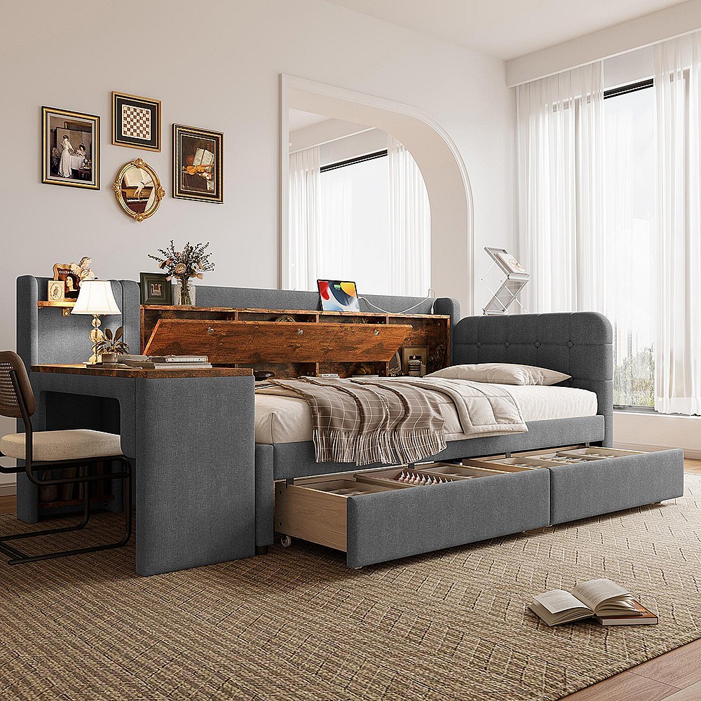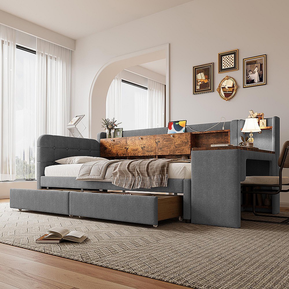 Lit banquette lit de jour convertible 90x200 cm avec bureau 2 tiroirs USB Type-C rangement rabattable sommier à lattes sans matelas lin gris