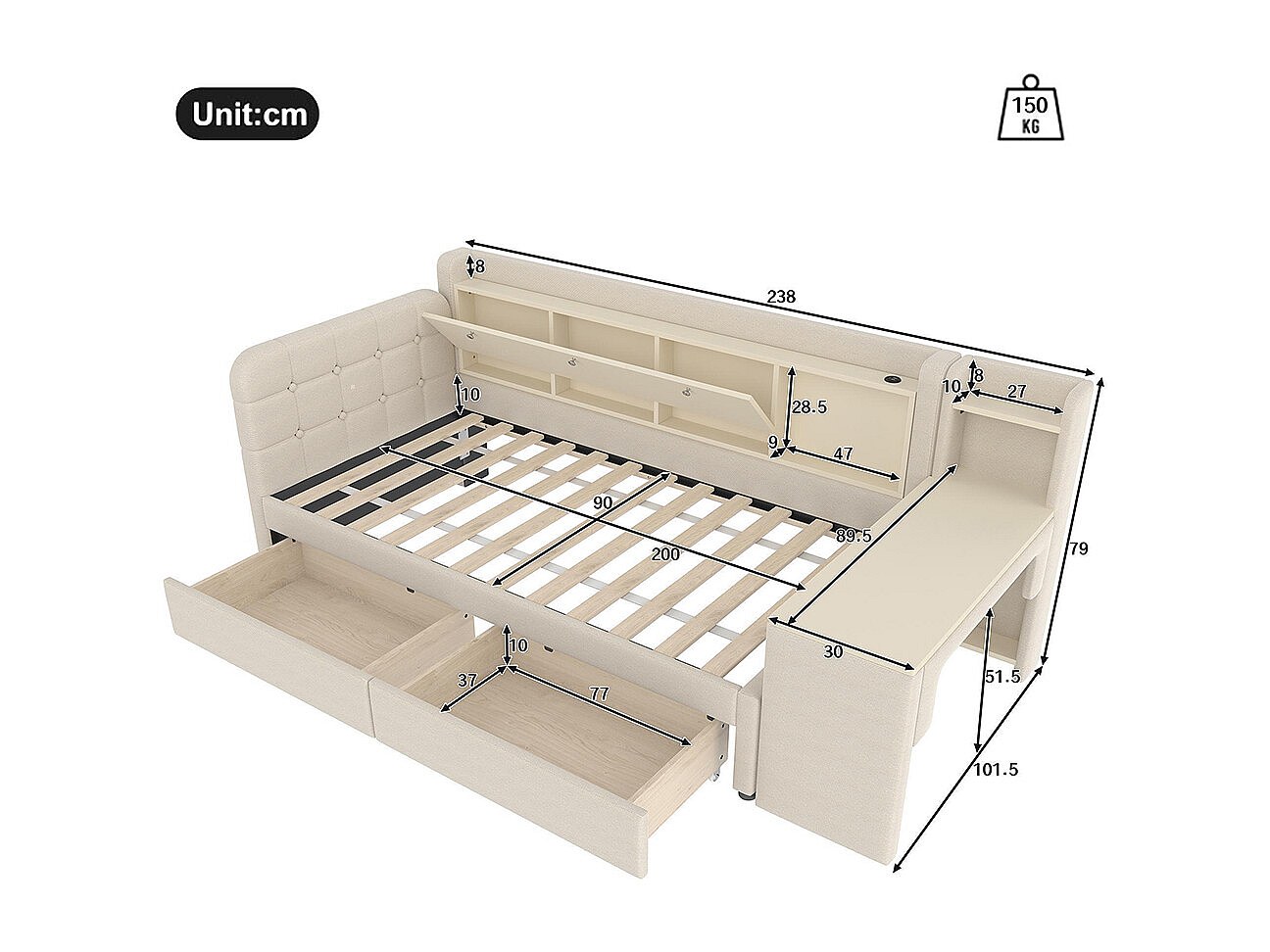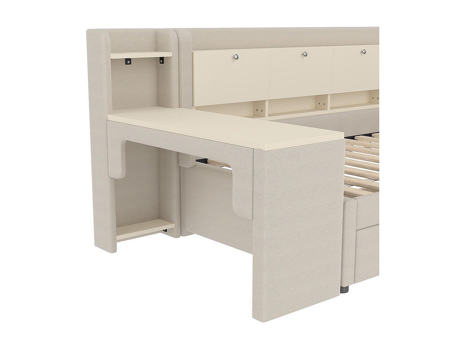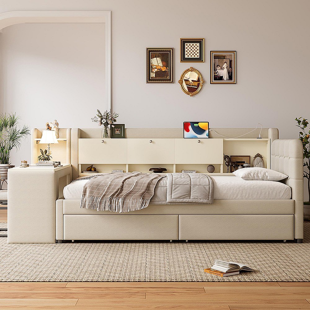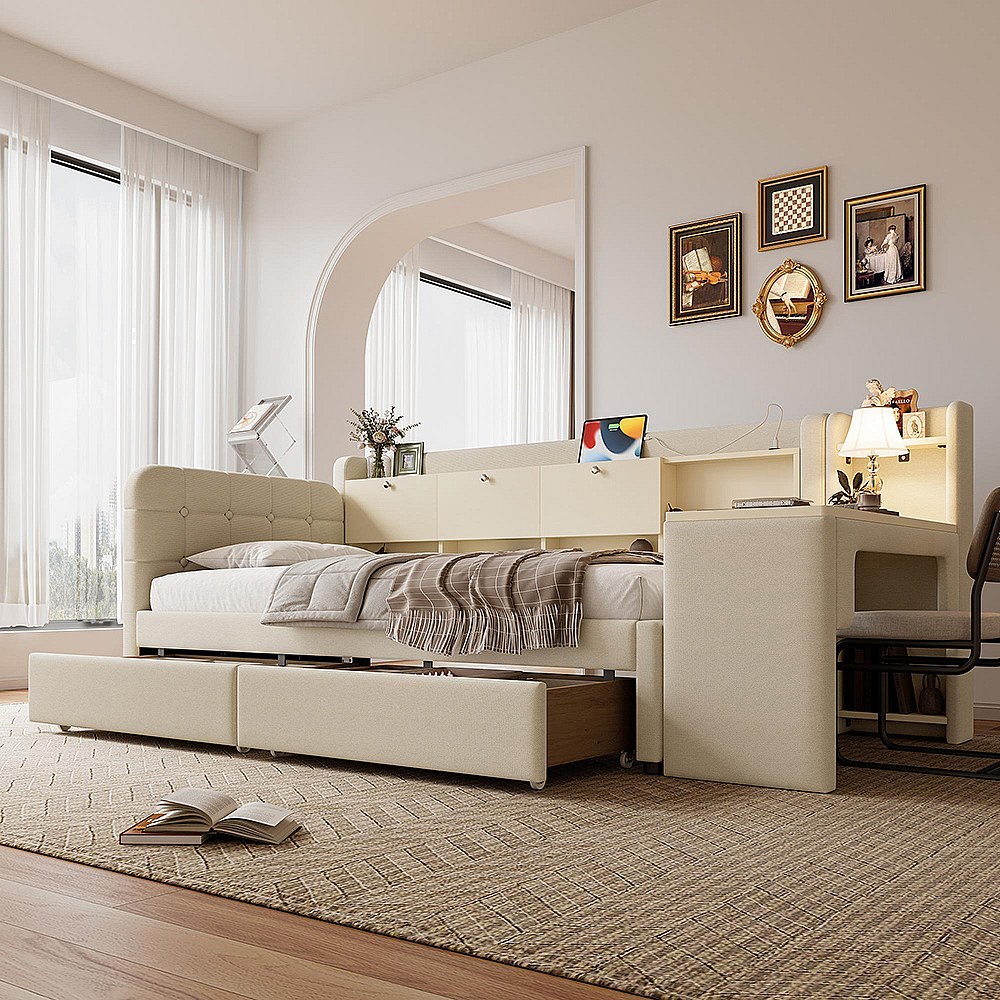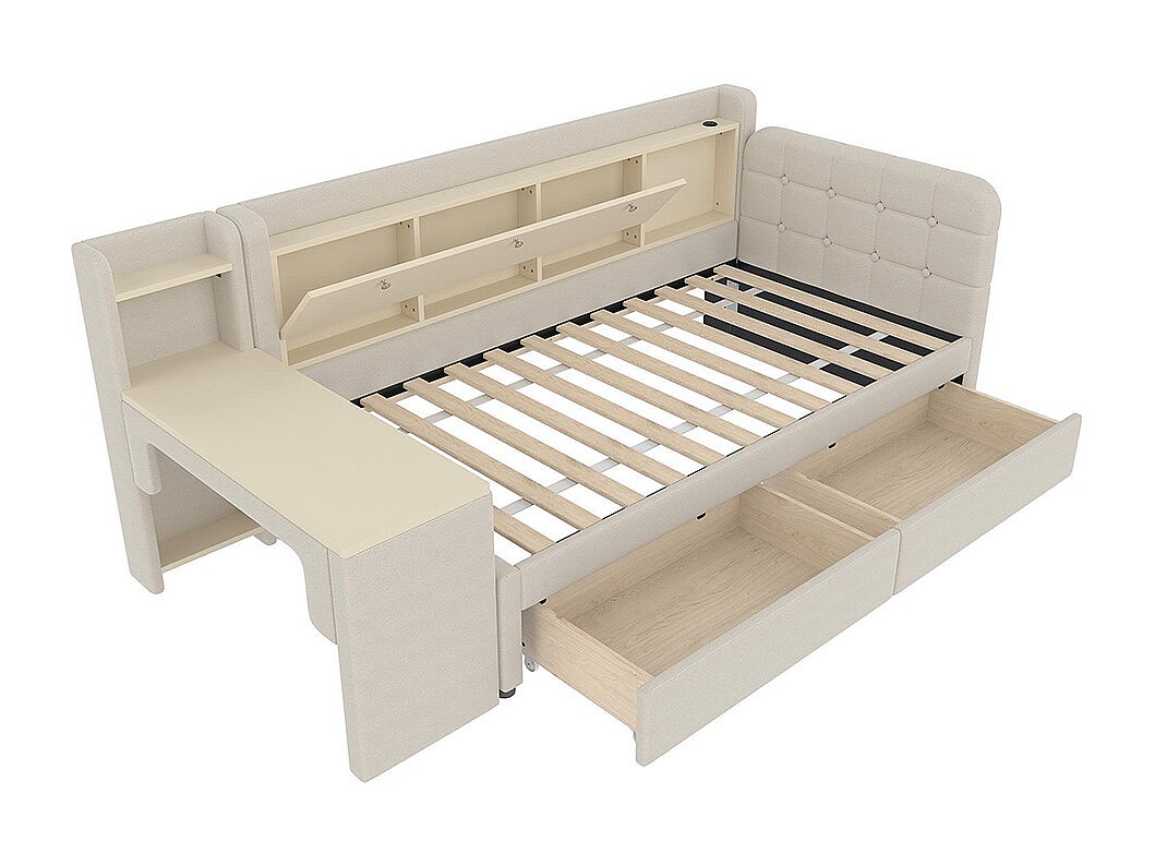 Lit banquette lit de jour convertible 90x200 cm avec bureau 2 tiroirs USB Type-C rangement rabattable sommier à lattes sans matelas rembourré beige