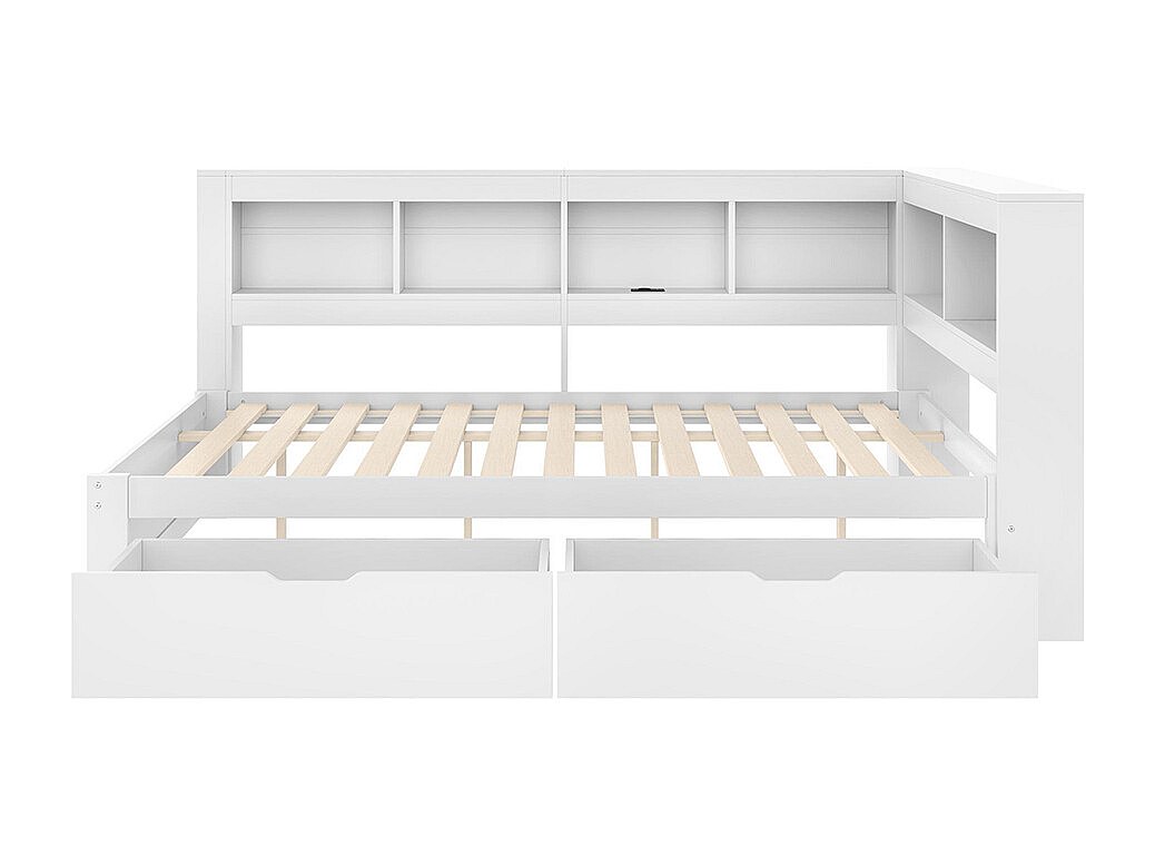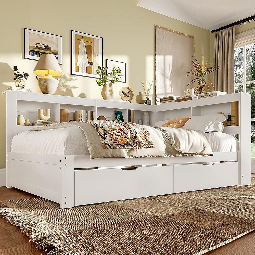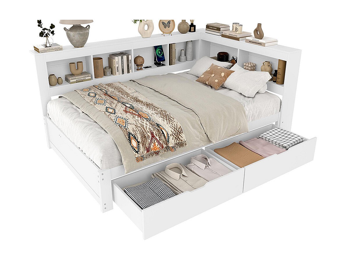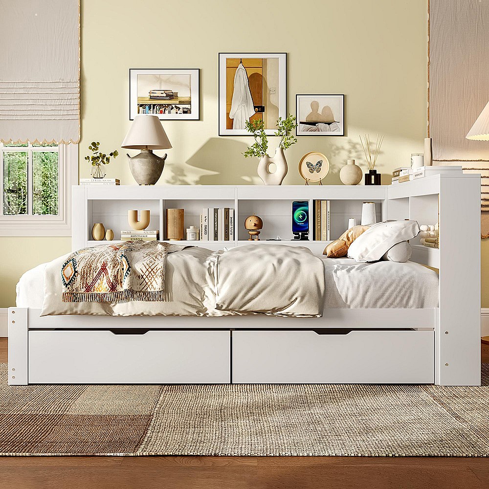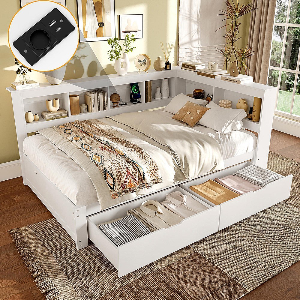 Lit banquette lit de jour rangement 140x200 cm canapé-lit 2 tiroirs ports USB électrique sommier à lattes sans matelas aggloméré blanc
