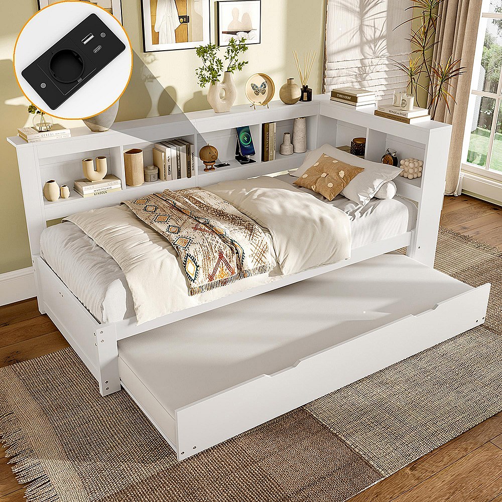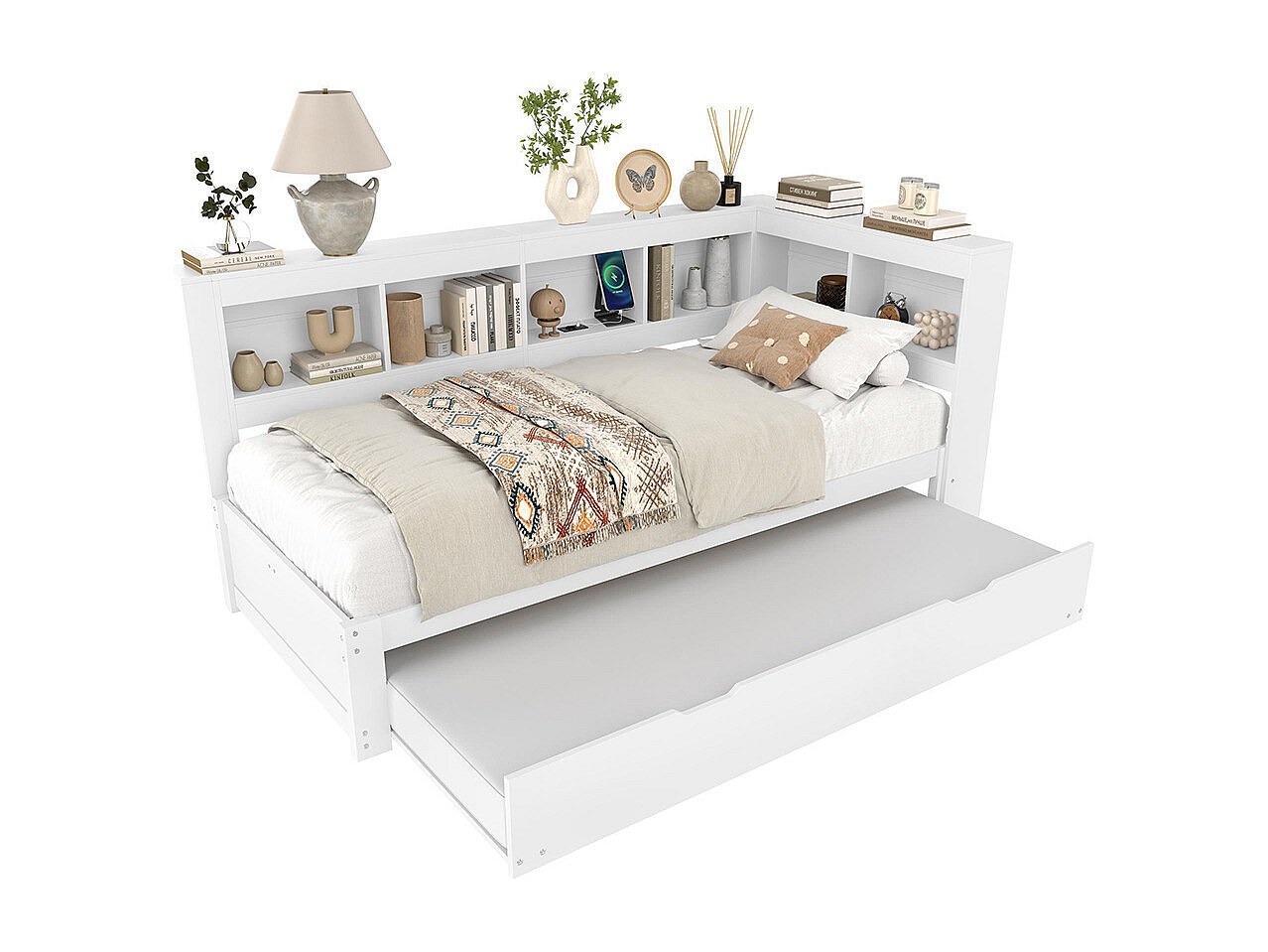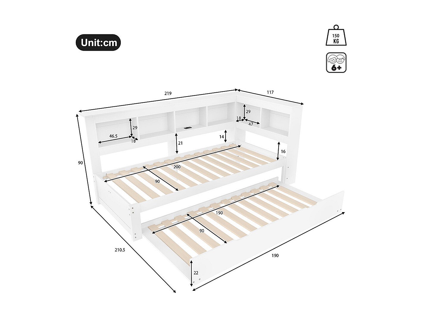 Lit banquette lit gigogne jour 90x200 cm canapé-lit ports USB électrique sommier à lattes sans matelas panneau particules blanc