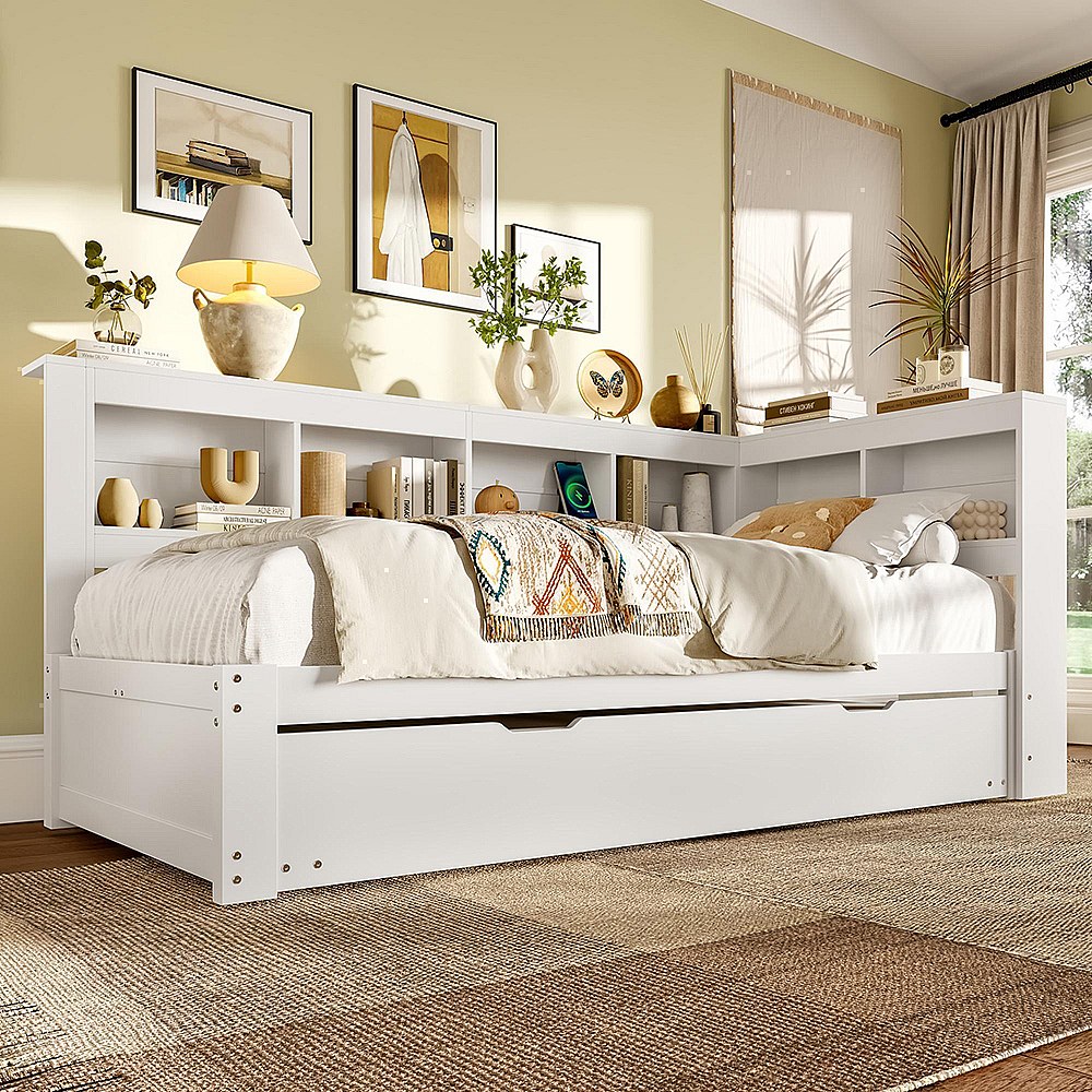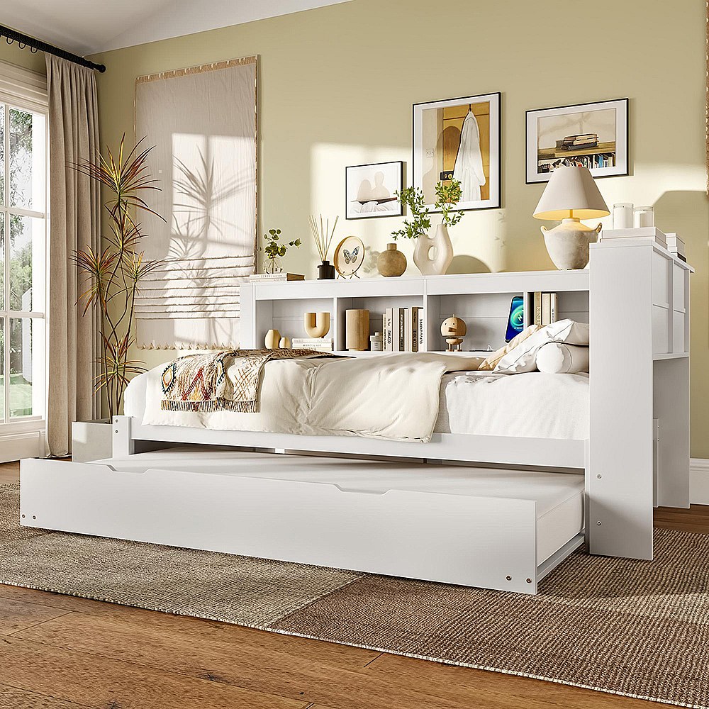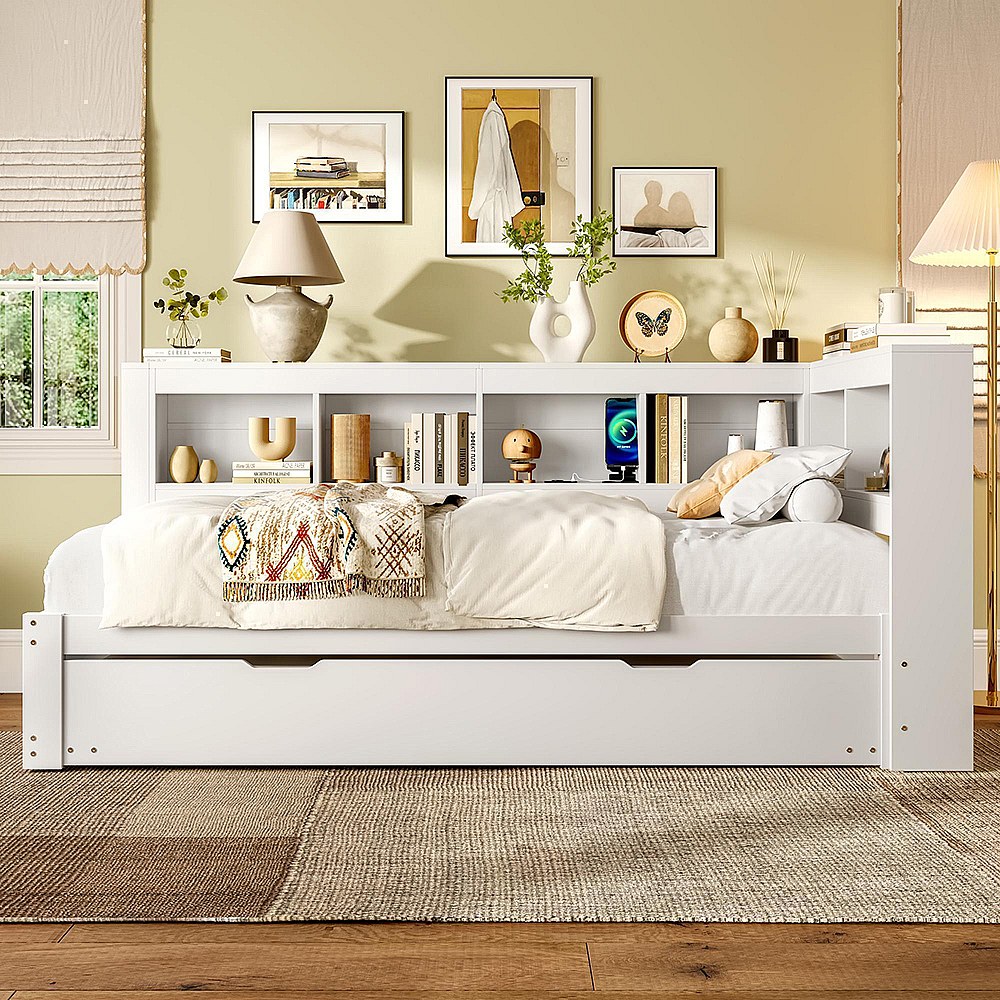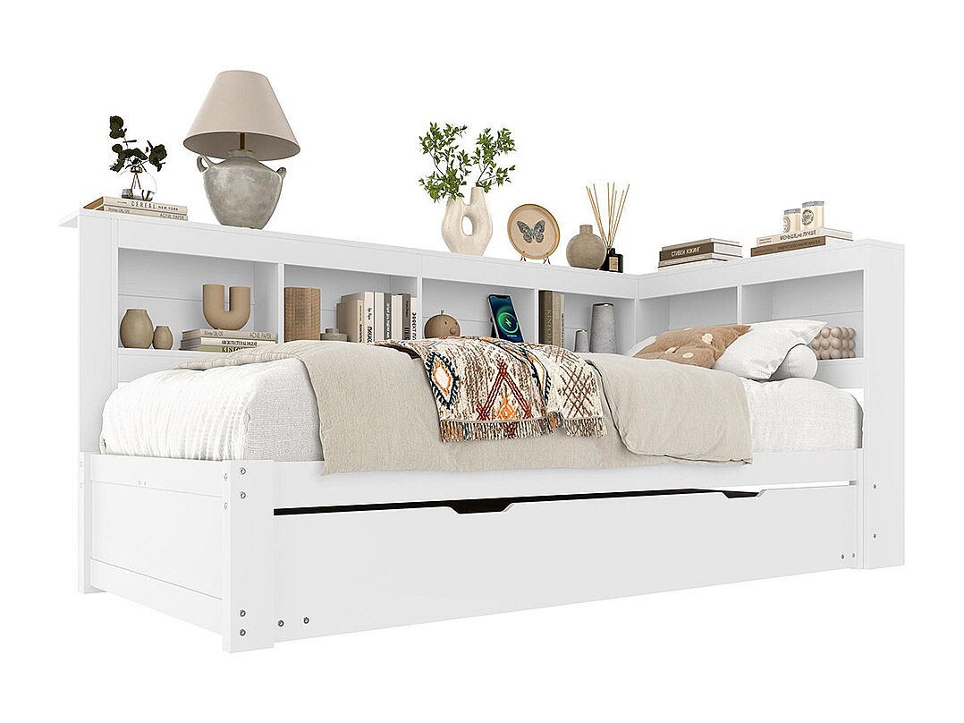 Lit banquette lit gigogne jour 90x200 cm canapé-lit ports USB électrique sommier à lattes sans matelas panneau particules blanc