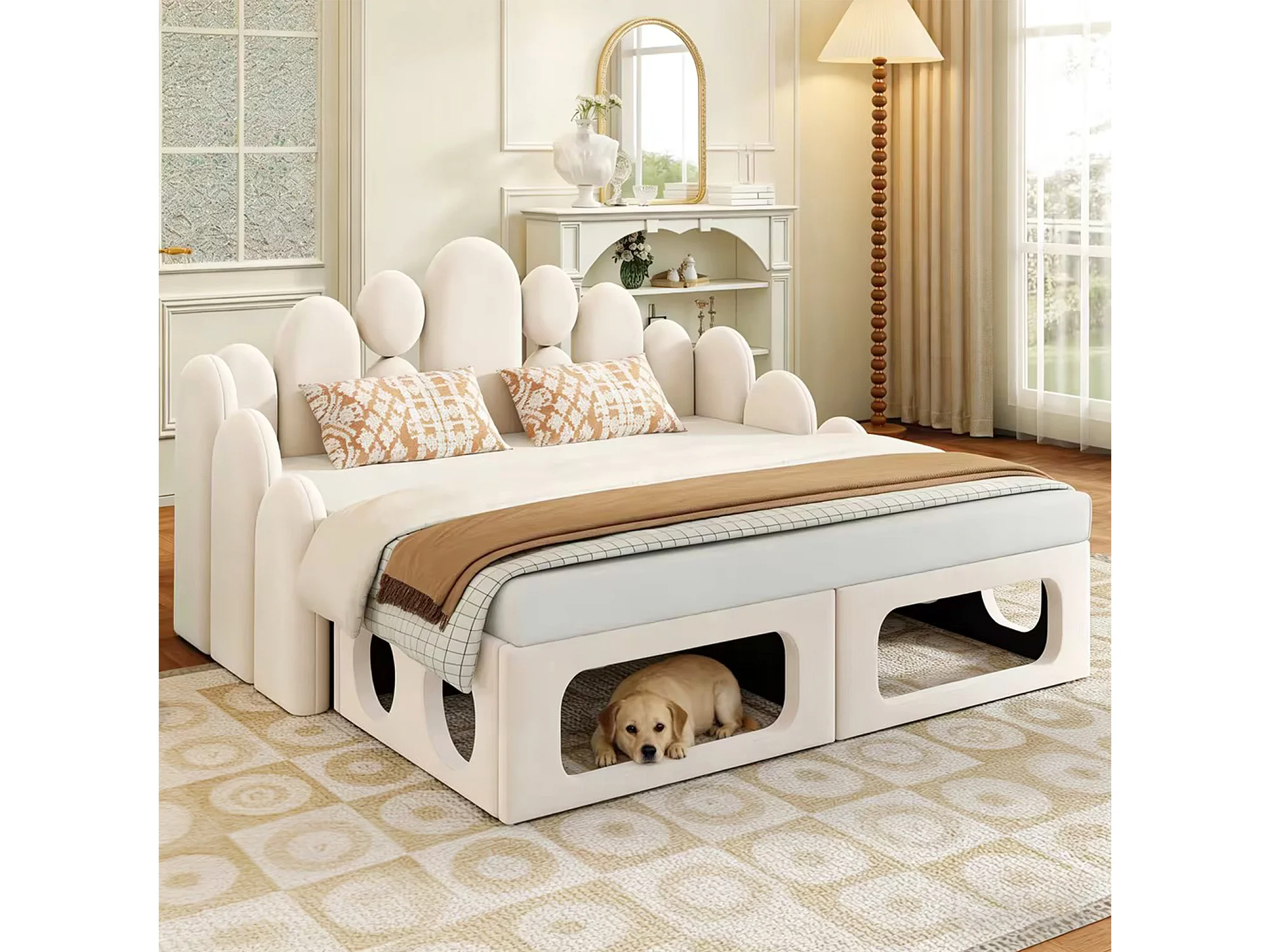 Lit banquette rembourré 2 en 1 - 180 x 200 cm - avec espace pour animaux + dossier - velours - beige