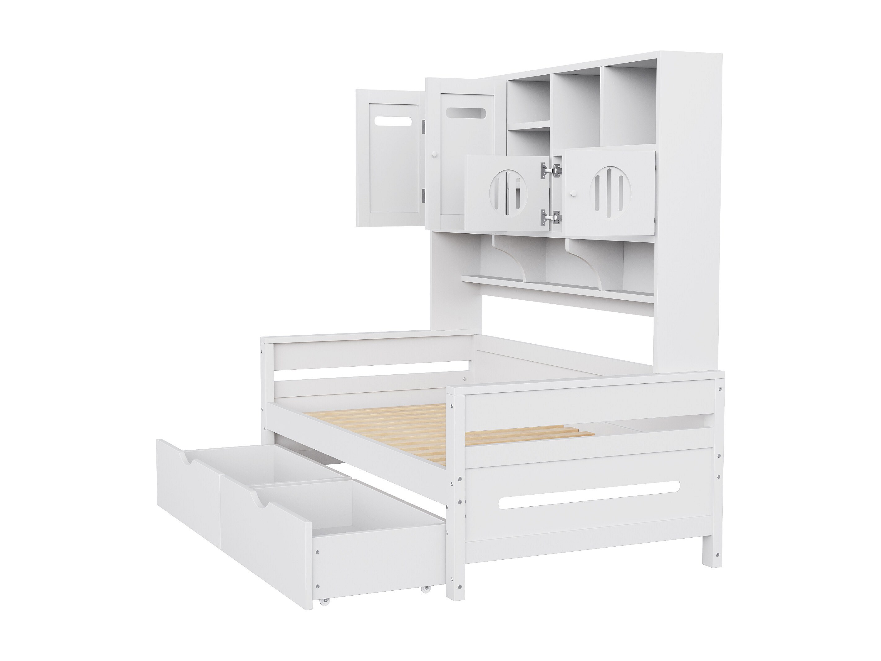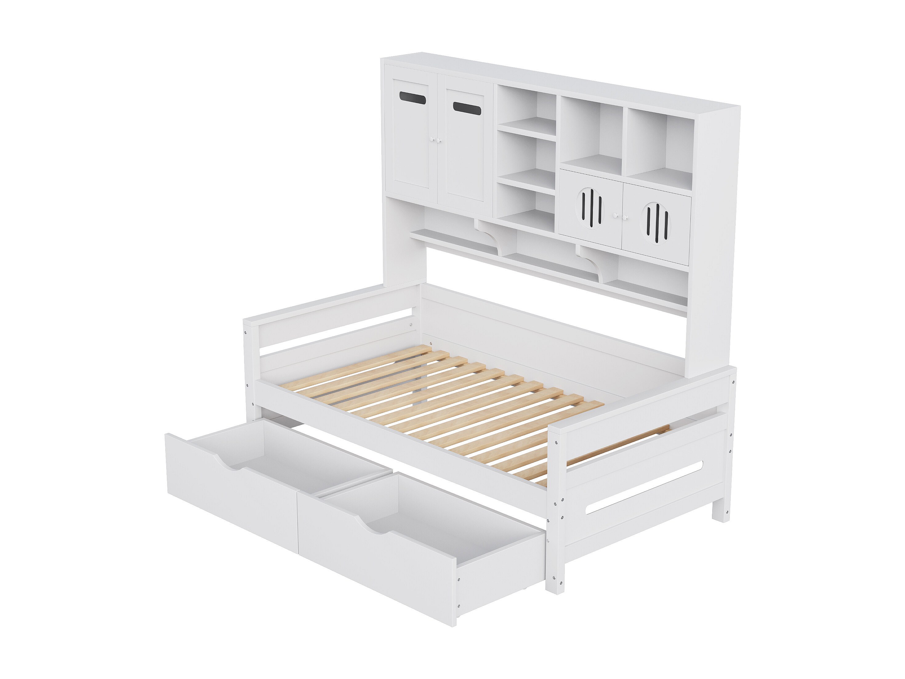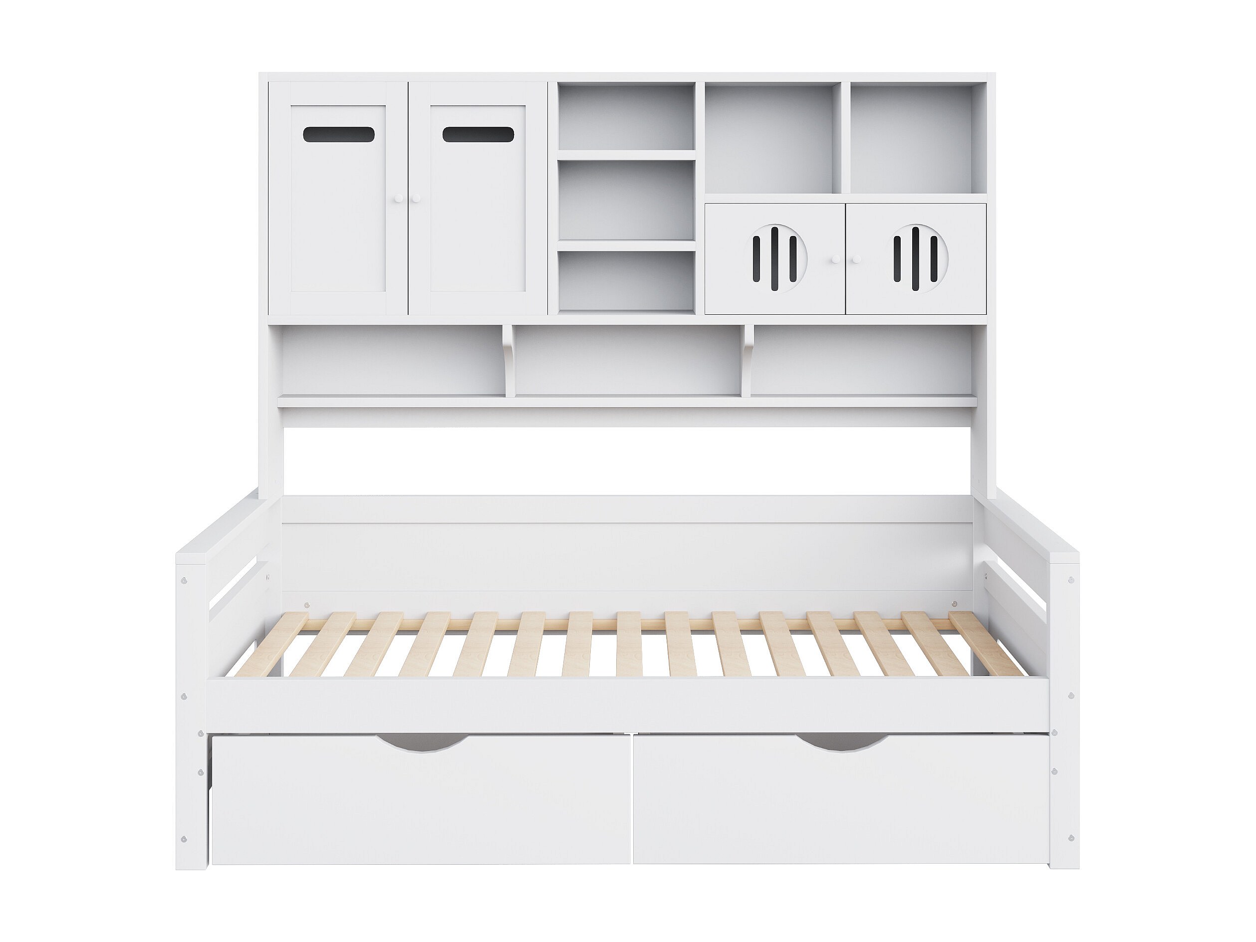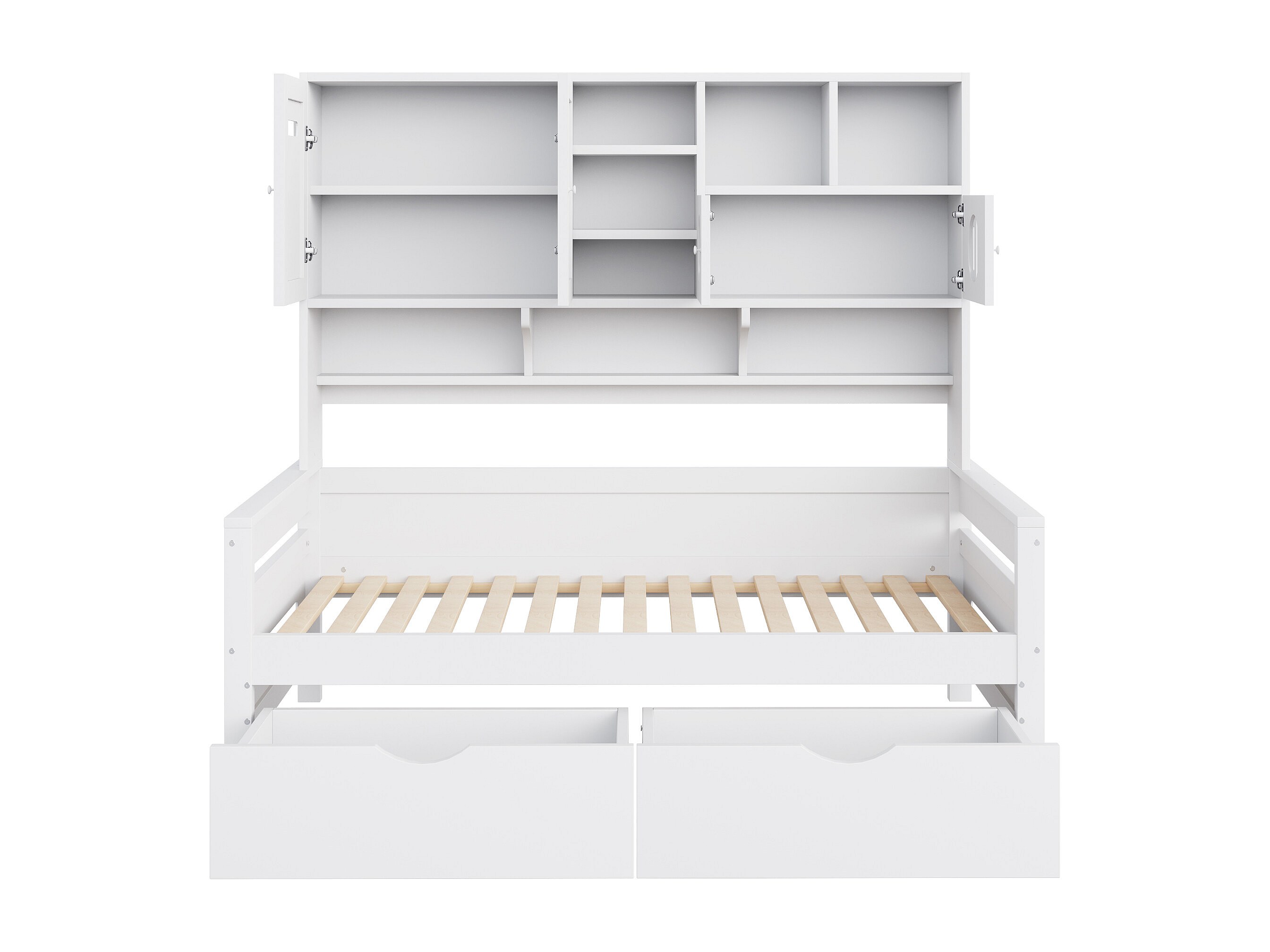Lit banquette simple en bois blanc 90x200cm avec 2 tiroirs, 4 portes et rangement, sans matelas