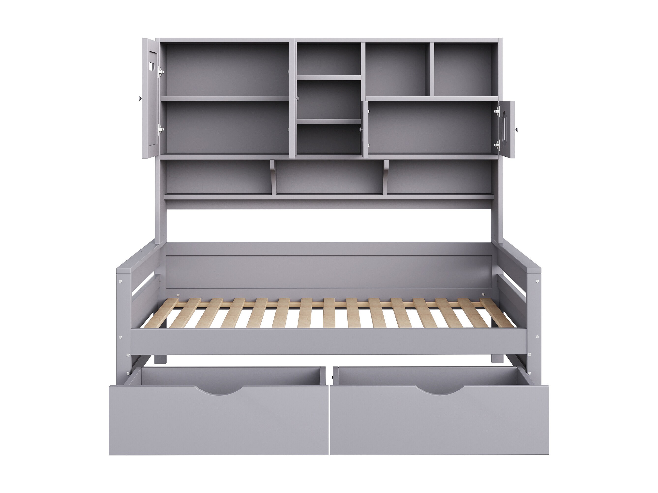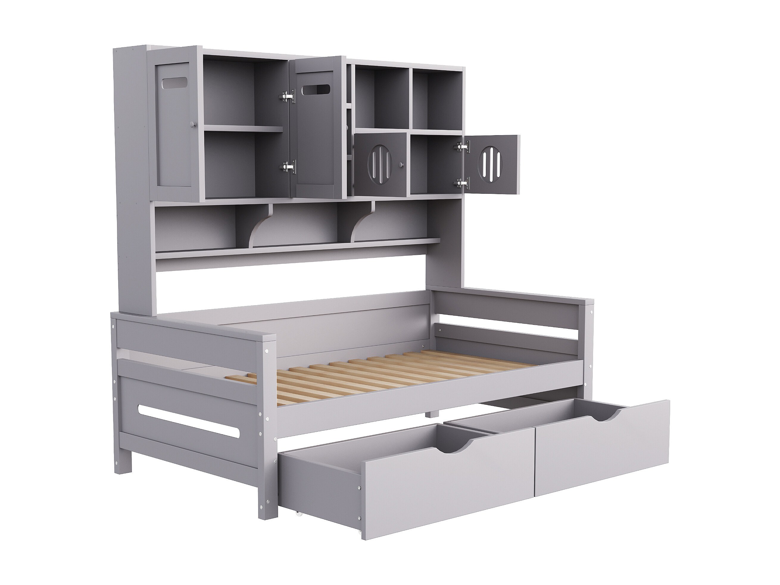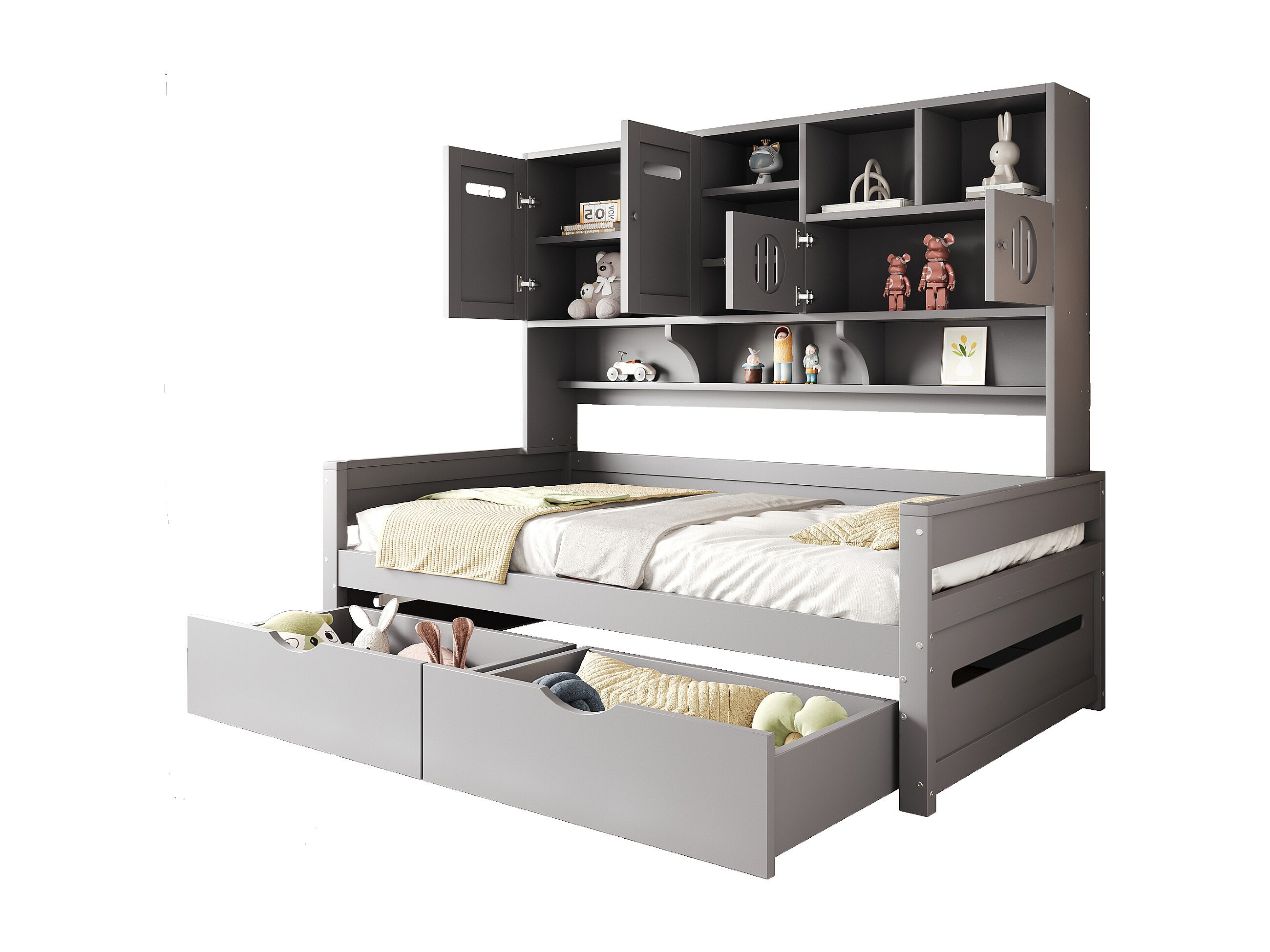 Lit banquette simple en bois gris 90x200cm avec 2 tiroirs, 4 portes et rangement, sans matelas