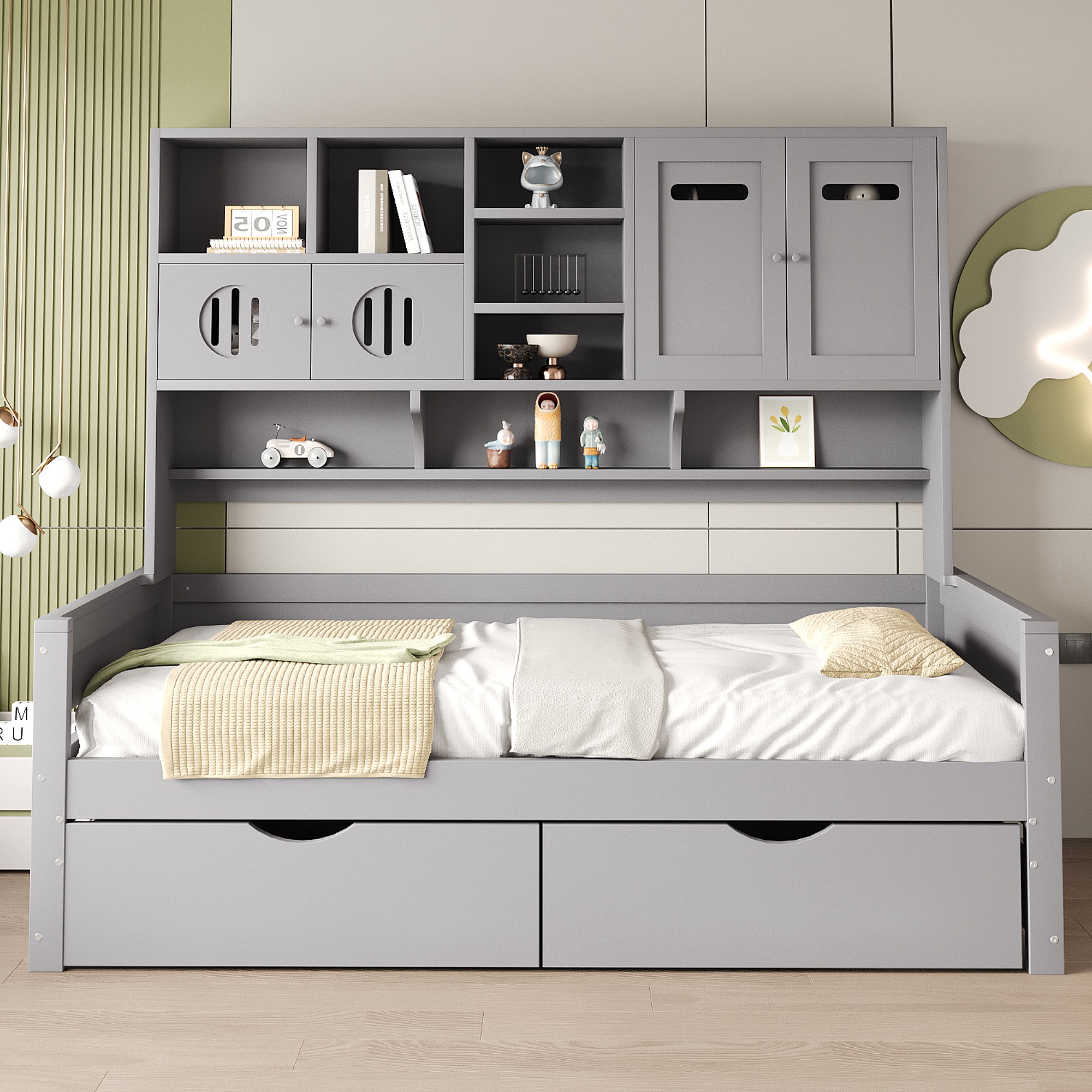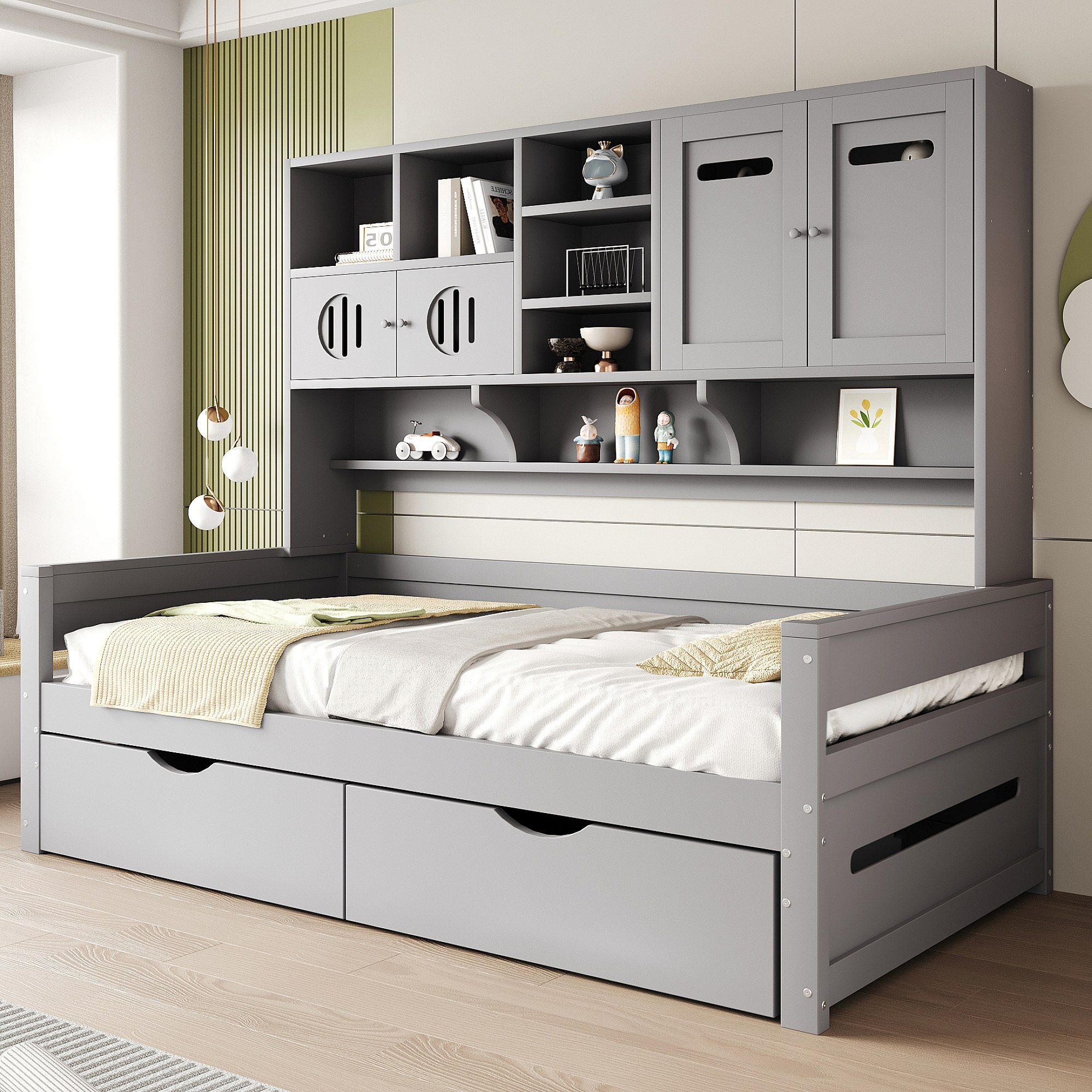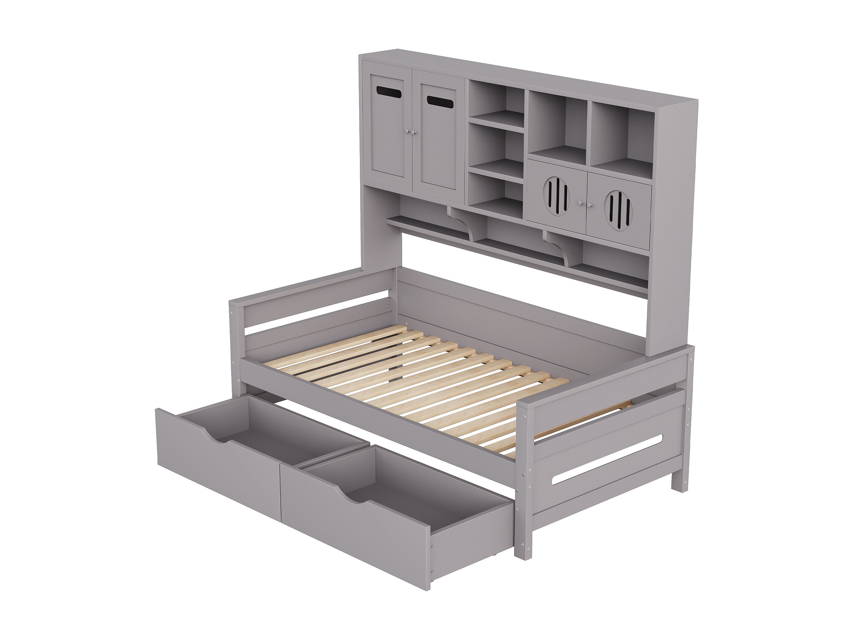 Lit banquette simple en bois gris 90x200cm avec 2 tiroirs, 4 portes et rangement, sans matelas