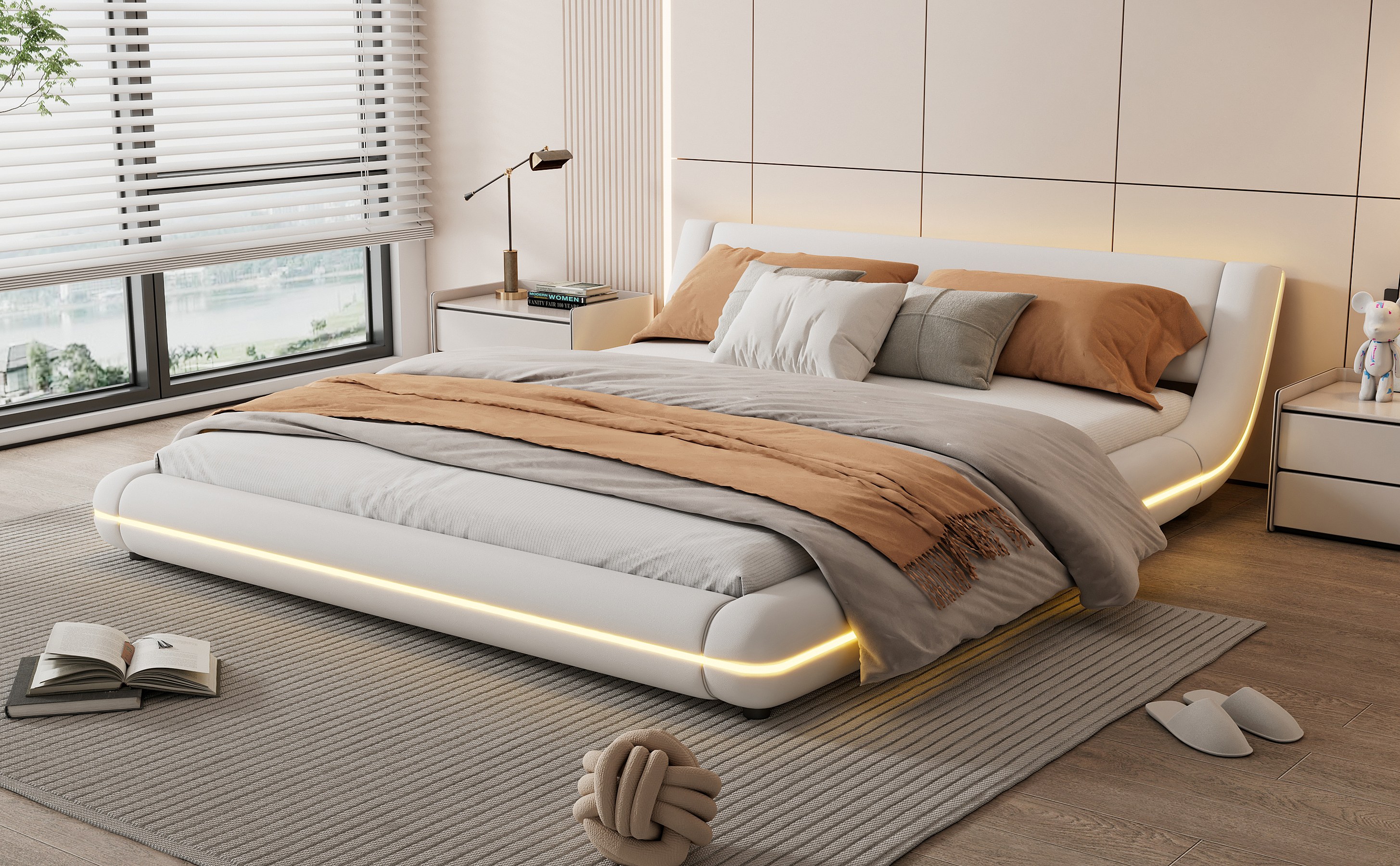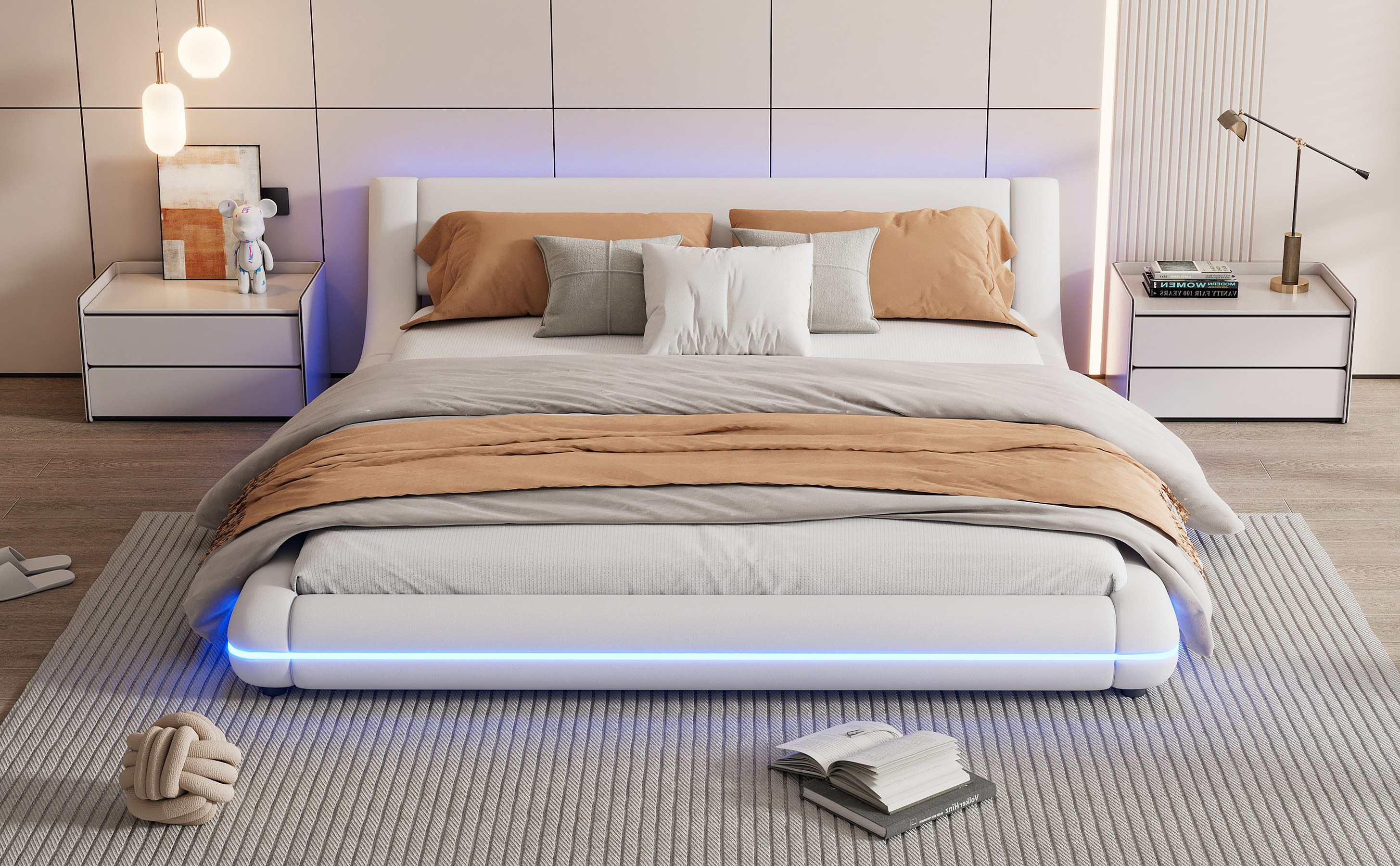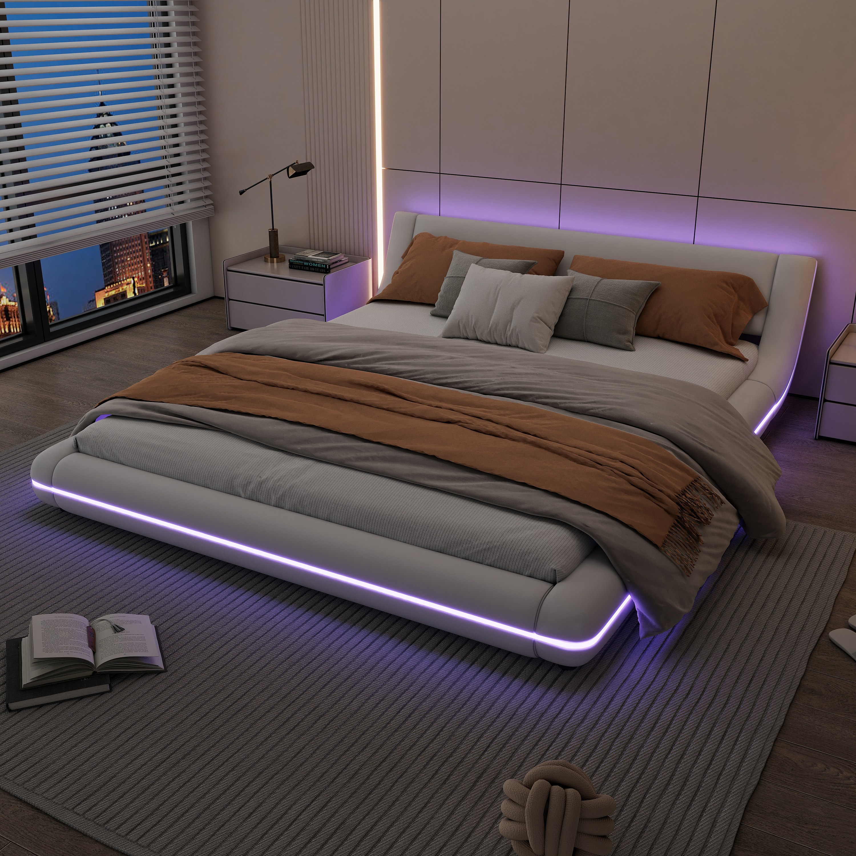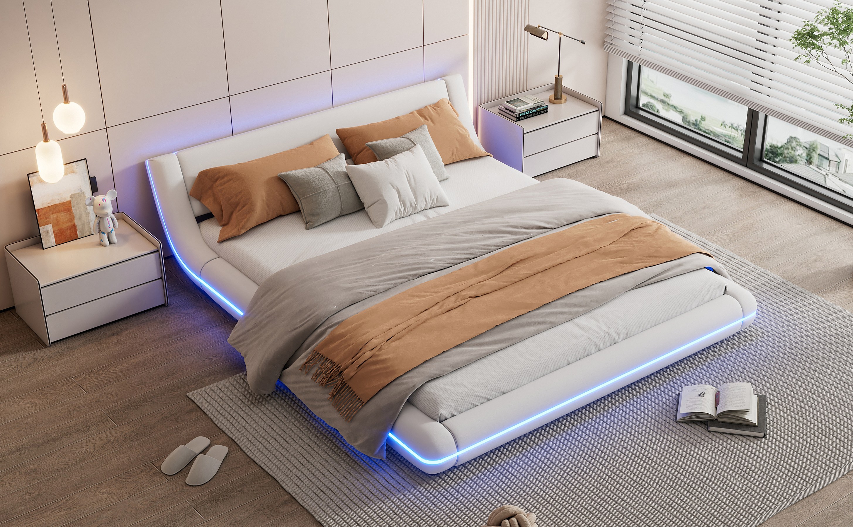 Lit bas 160x200 cm, lit plat PU, éclairage LED réglable, télécommande 24 touches, Blanc