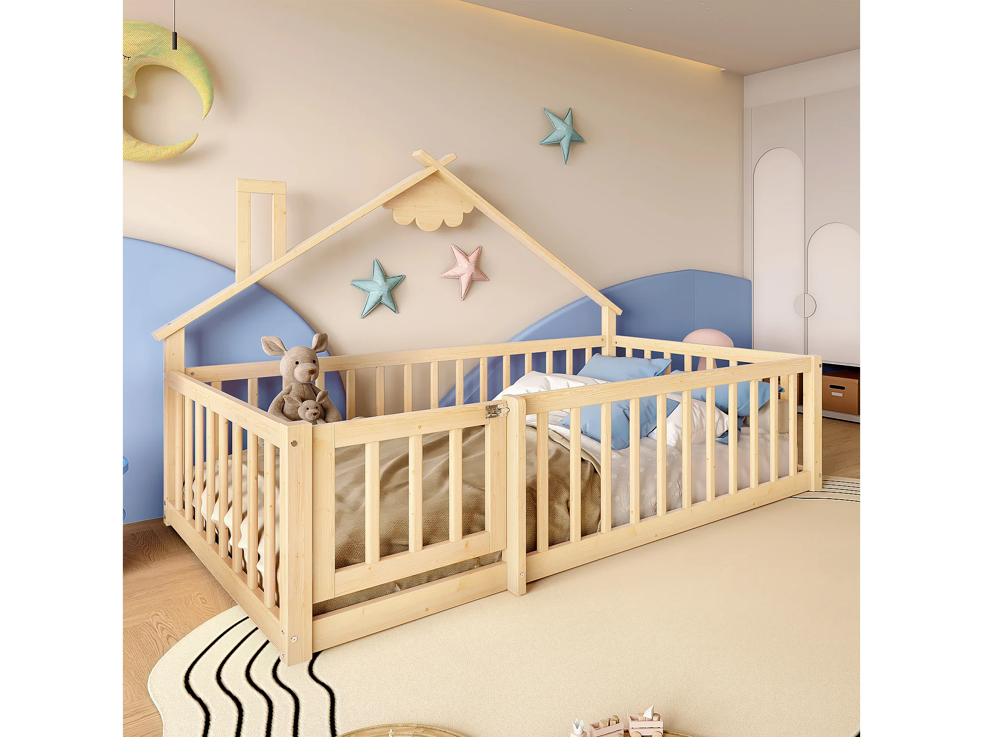Lit bas 90x190 cm pour enfant avec barreau maison, rambarde avec verrou, bois de pin, Naturel