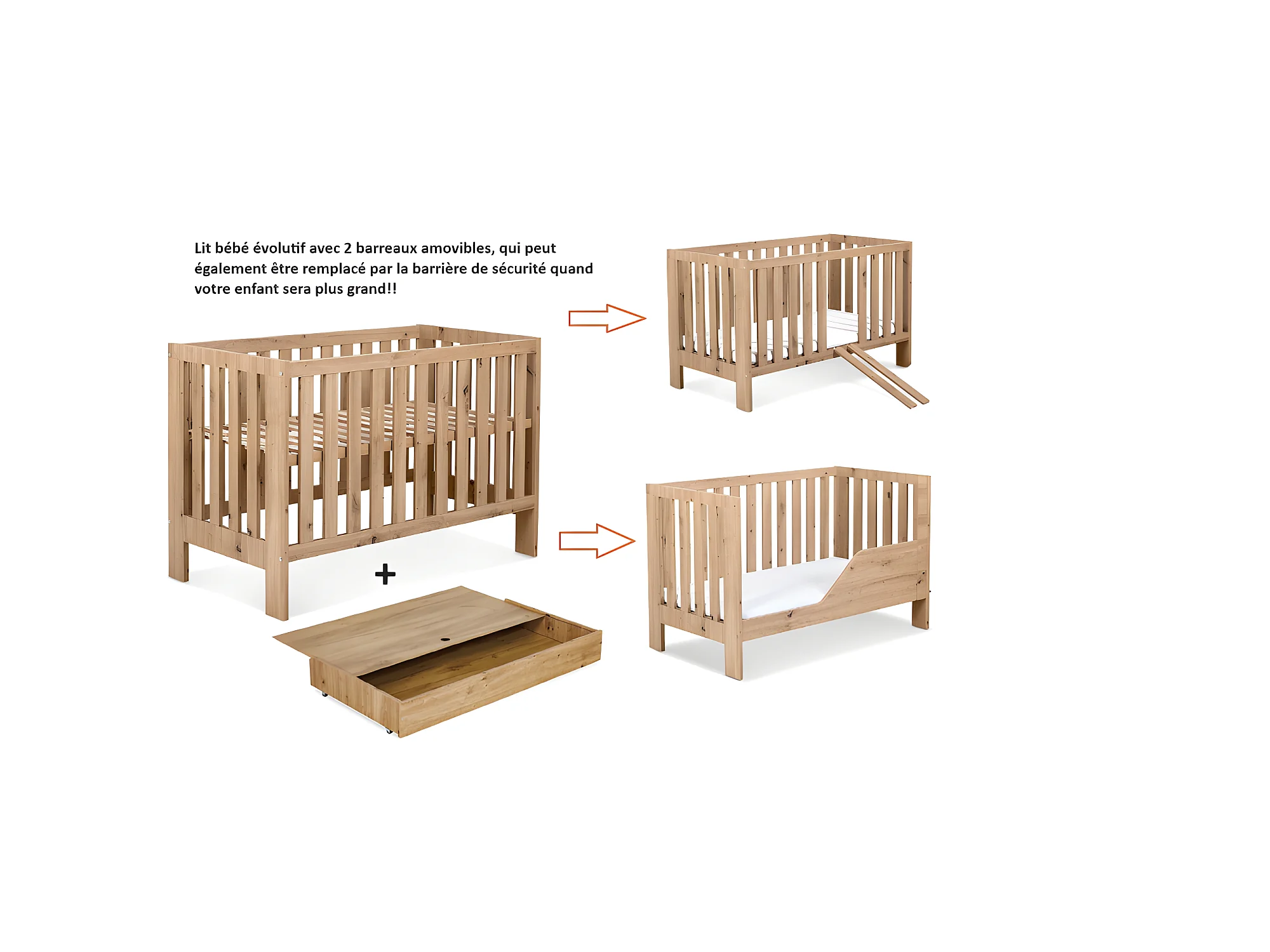Lit bébé 120x60cm avec tiroir couleur et barrière de sécurité Chêne AMELIE Lit barreaux amovible