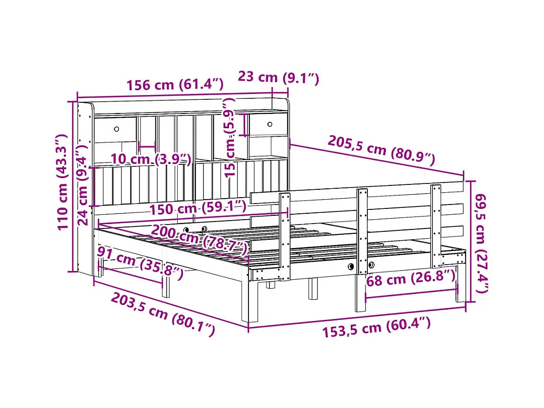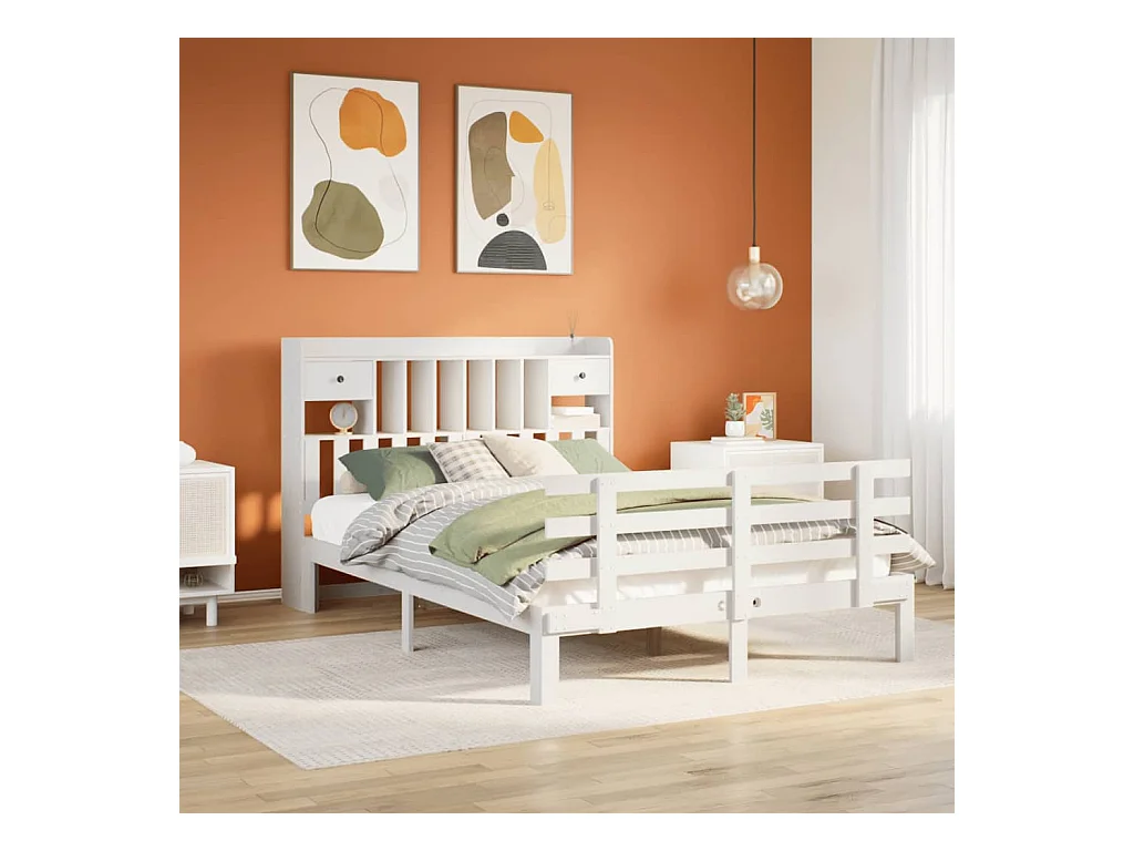 Lit bibliothèque sans matelas blanc 150x200 cm bois pin massif