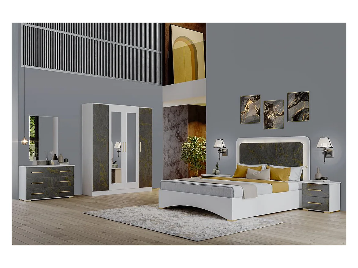 Lit blanc et gris brillant marbré doré avec Led Dova-140x190