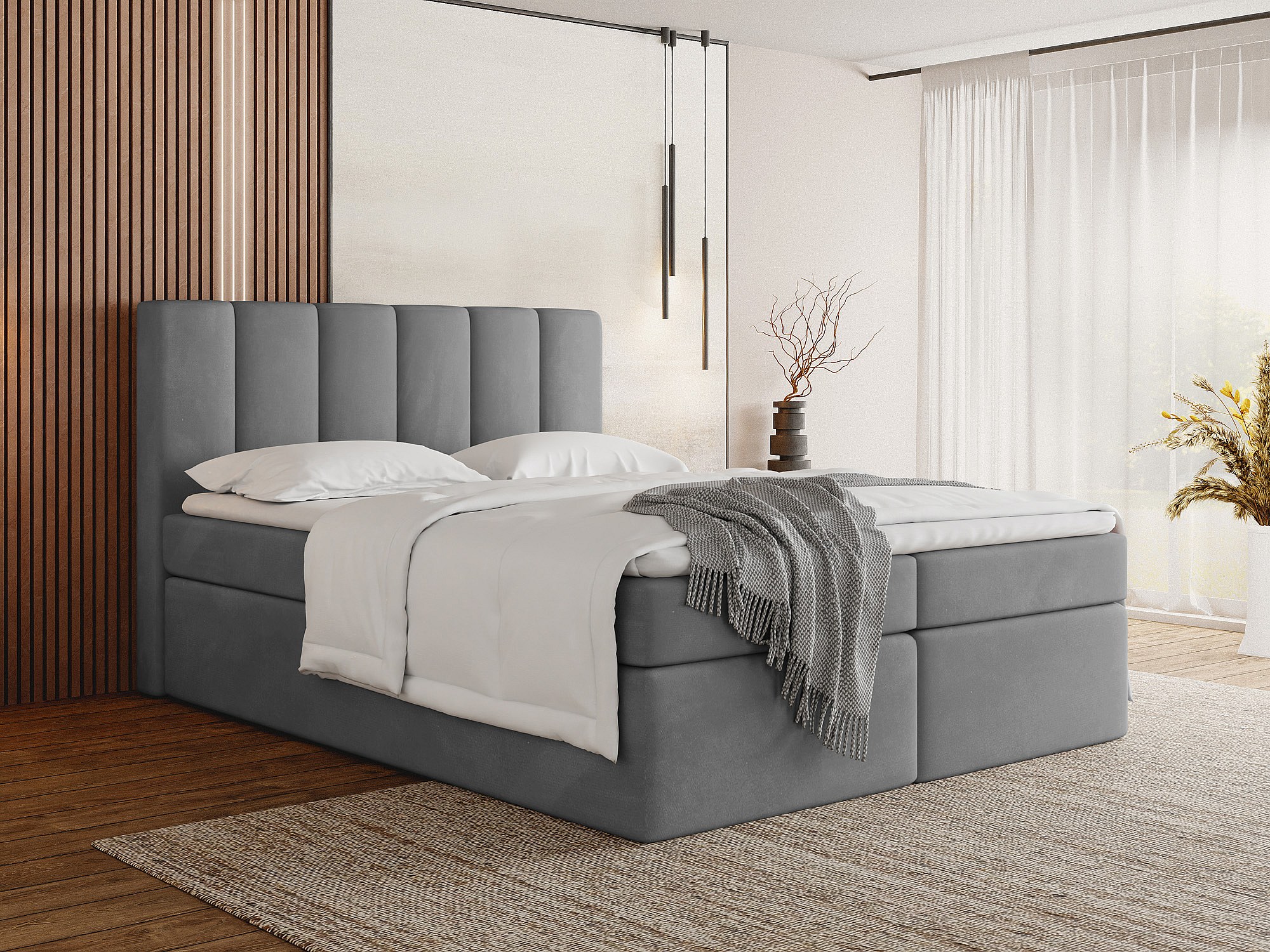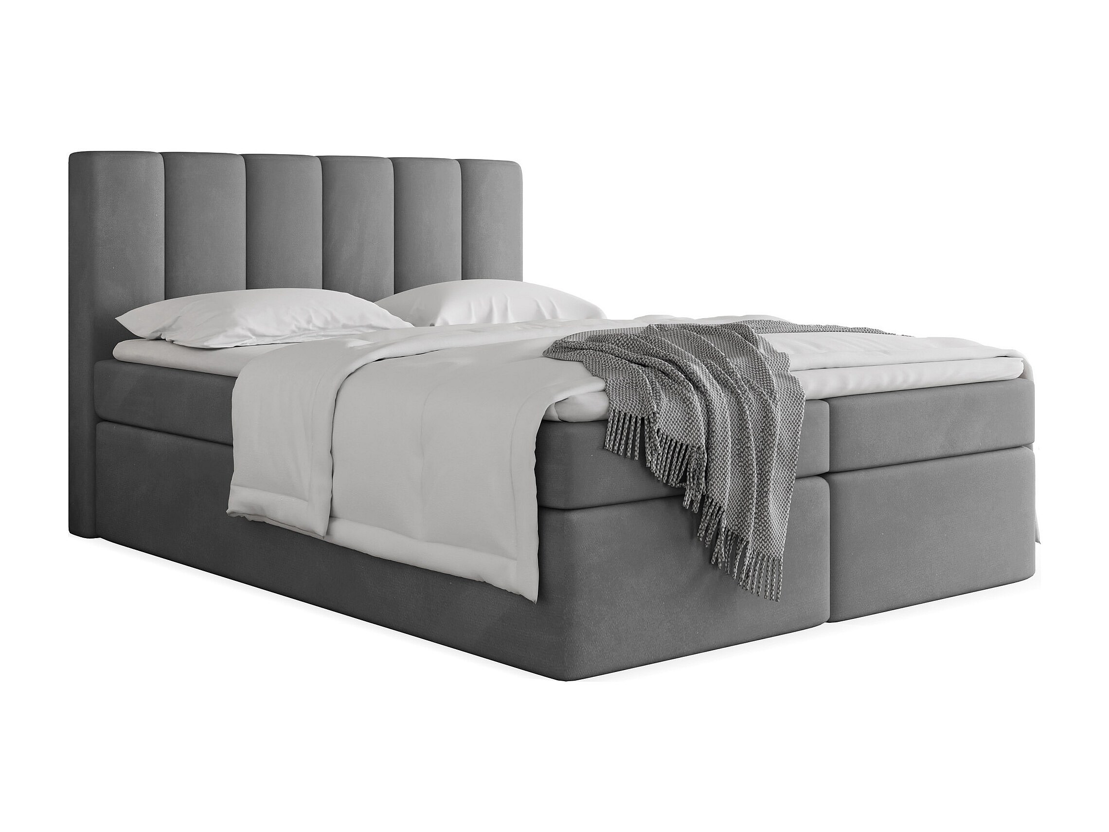 Lit Boxspring Amira 180x200 avec Matelas, Surmatelas et Coffre – Lit Coffre Tissu Velours – Tête Capitonnée – Lit Double Adulte – Gris