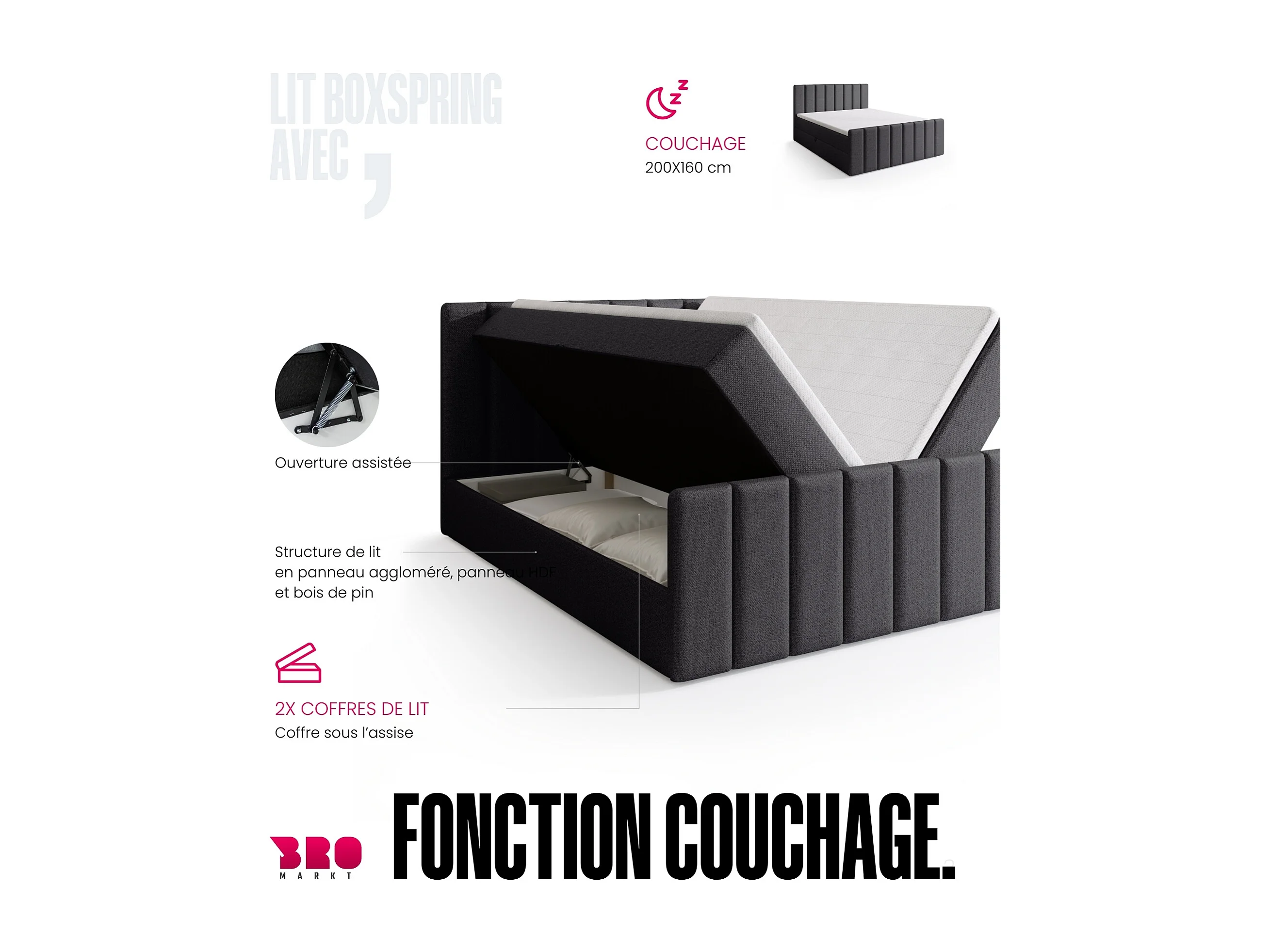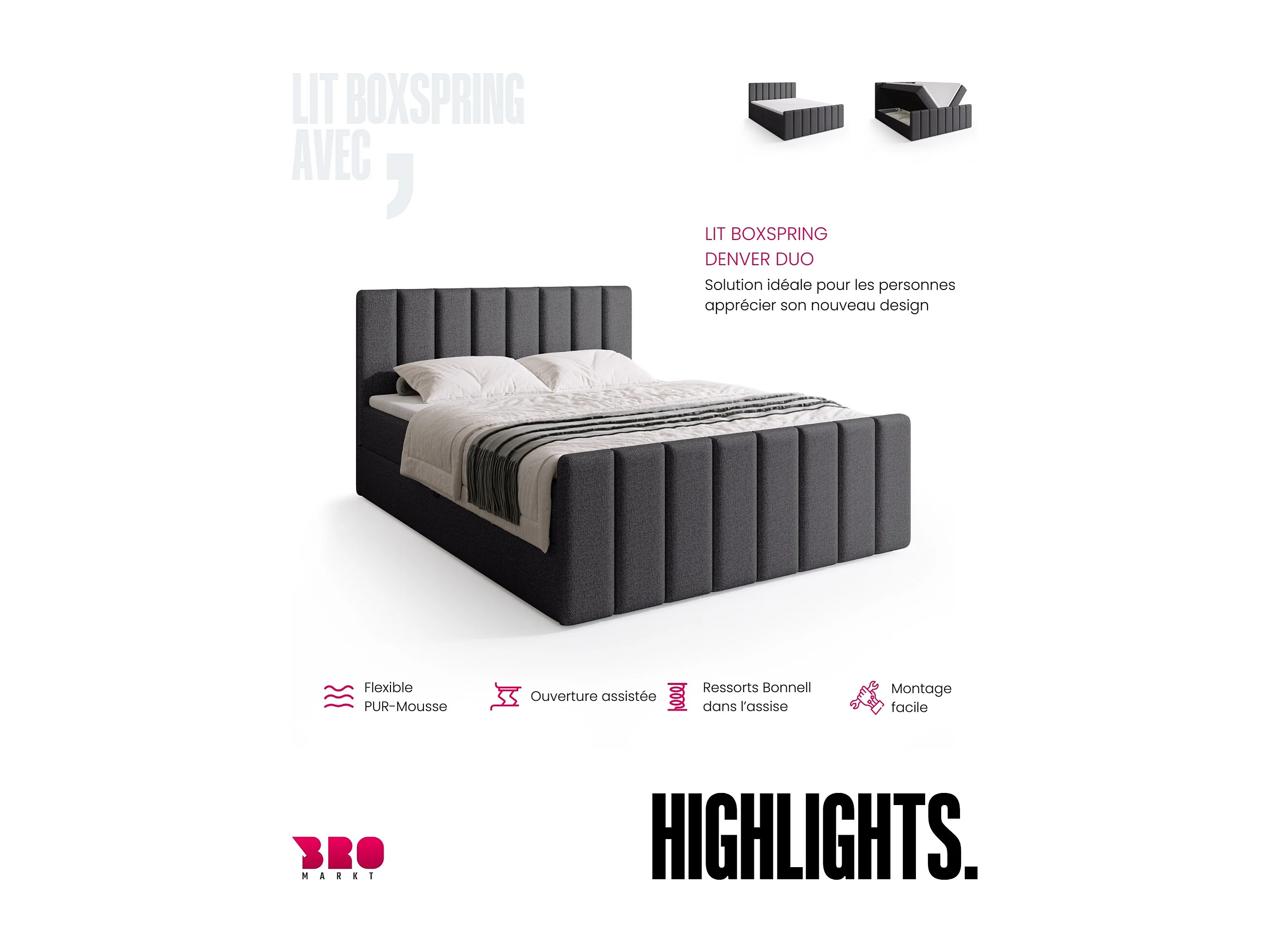 Lit boxspring avec rangement DENVER DUO - matelas - surmatelas - gris - 160x200 cm