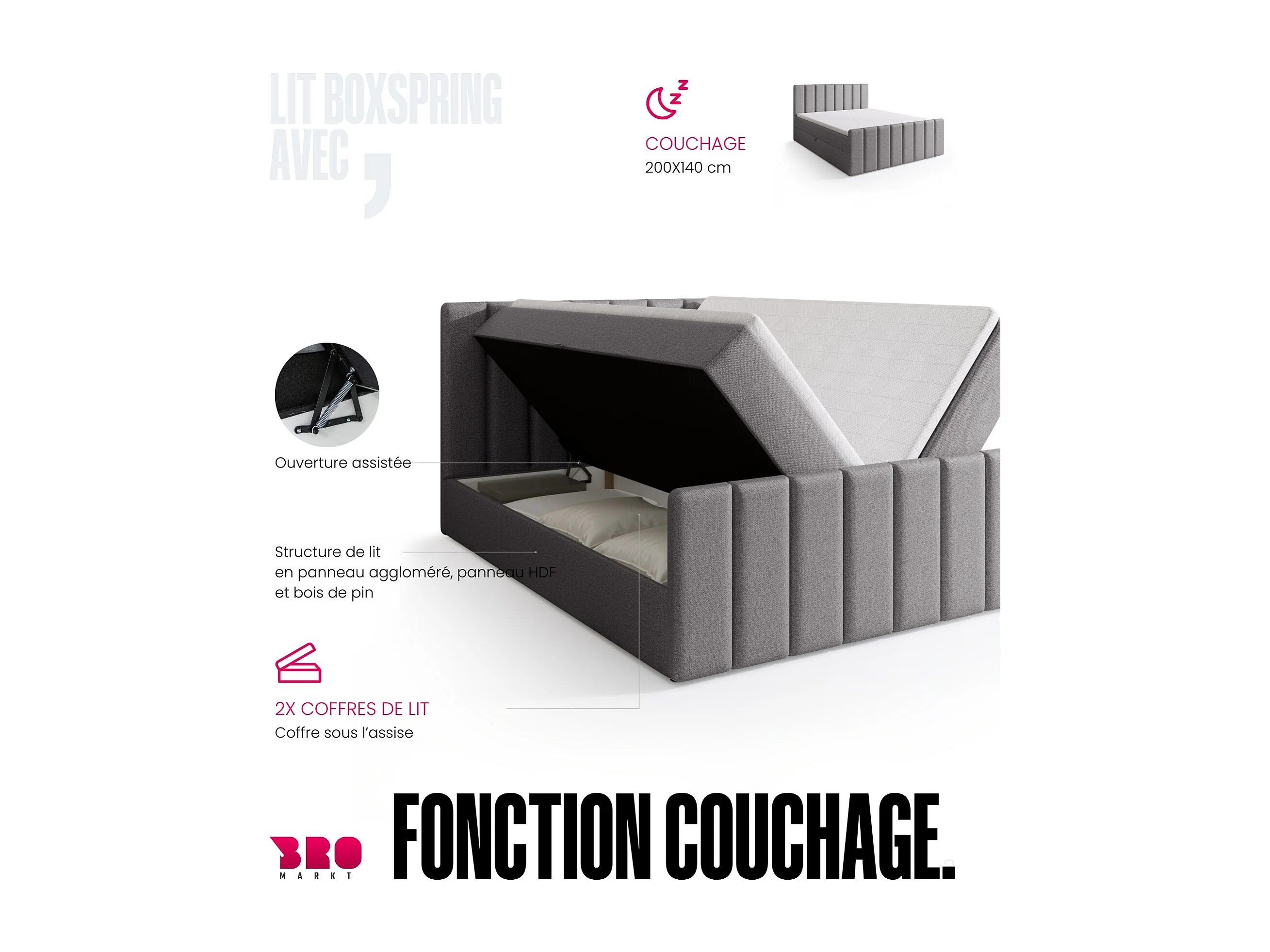 Lit boxspring avec rangement DENVER DUO - matelas - surmatelas - gris clair - 140x200 cm