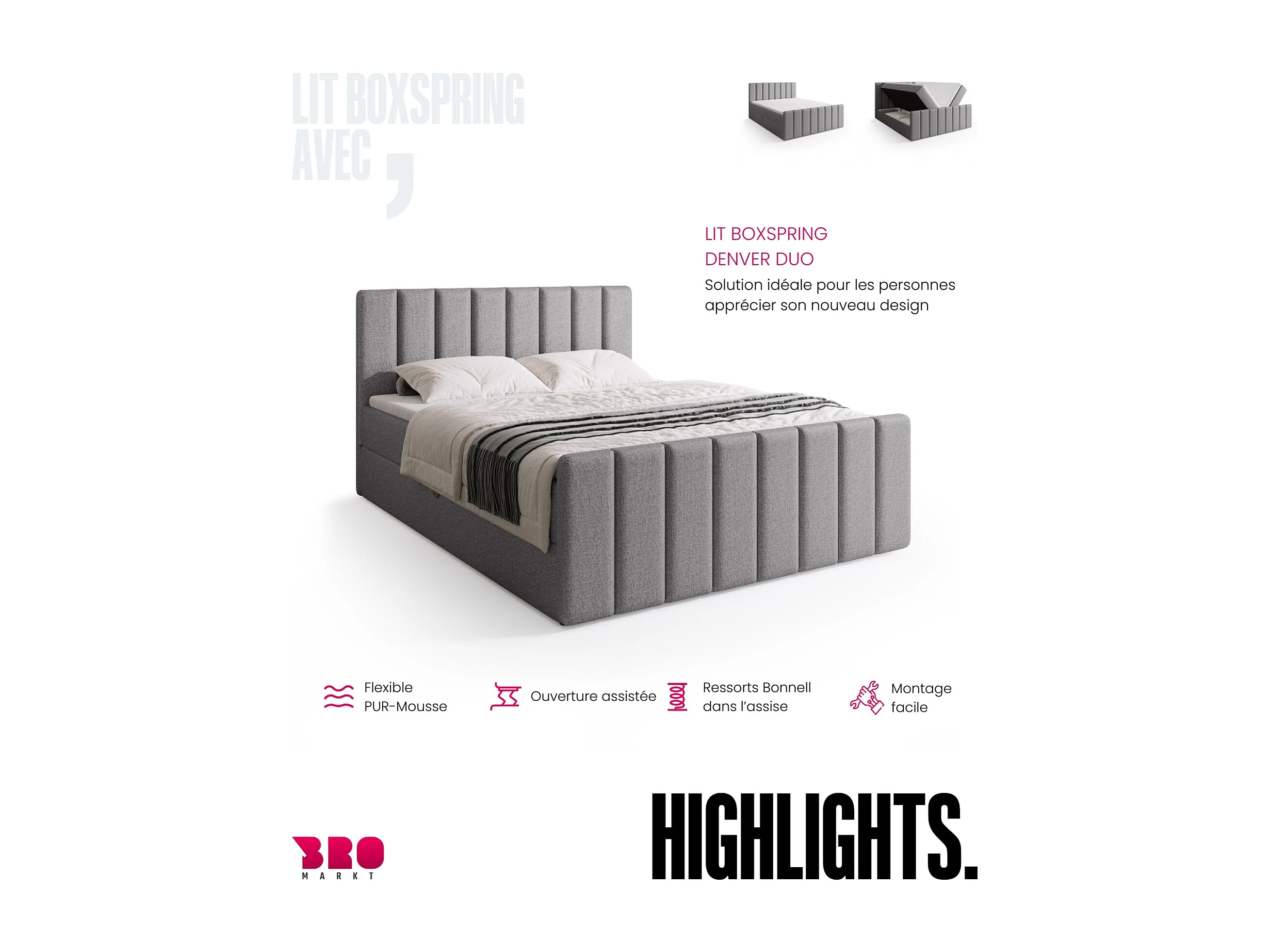 Lit boxspring avec rangement DENVER DUO - matelas - surmatelas - gris clair - 180x200 cm