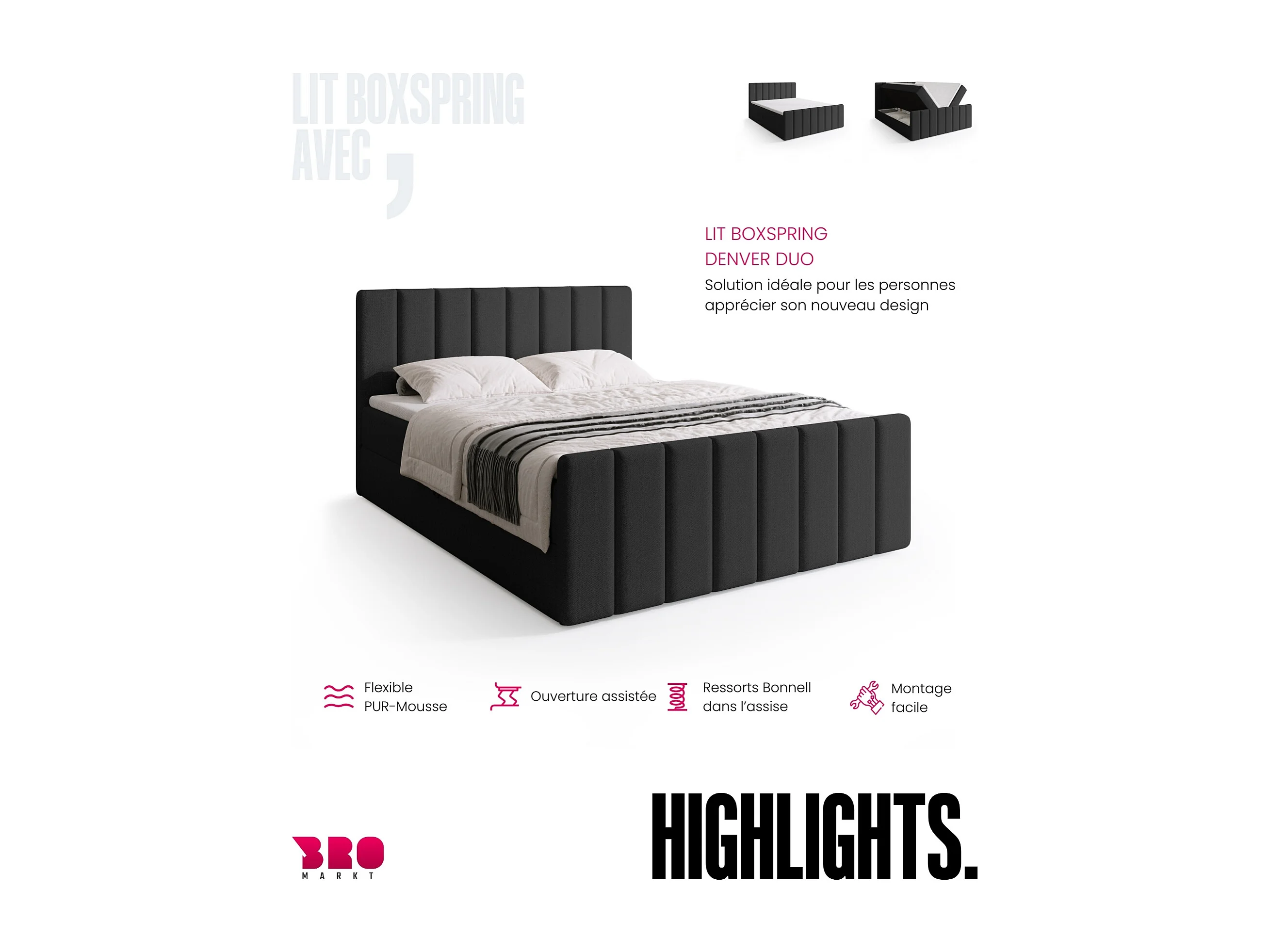 Lit boxspring avec rangement DENVER DUO - matelas - surmatelas - gris foncé - 140x200 cm