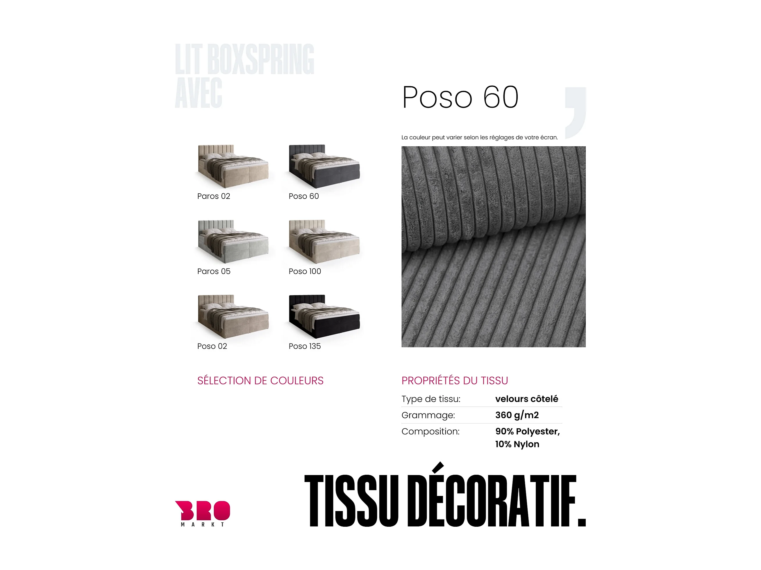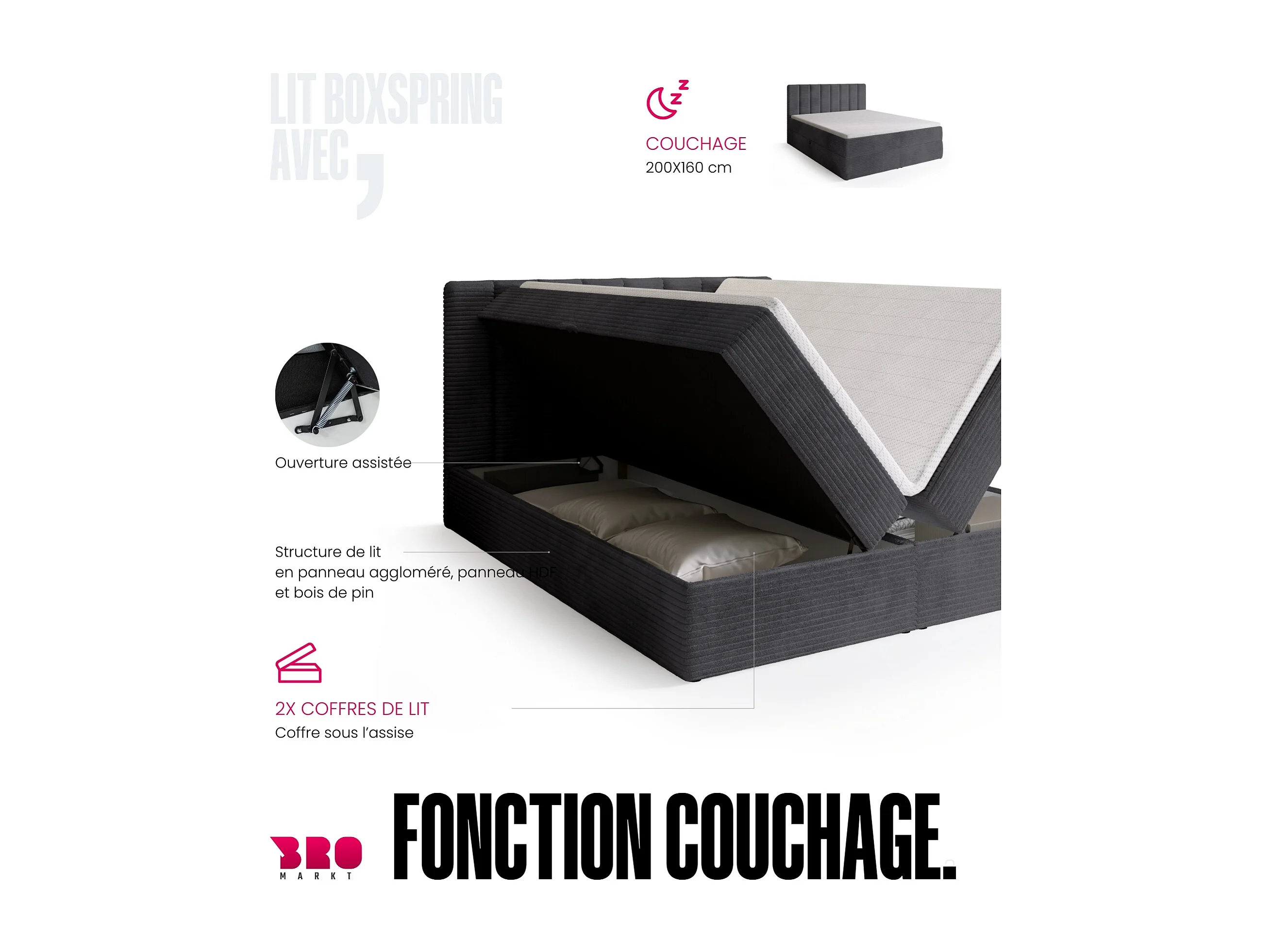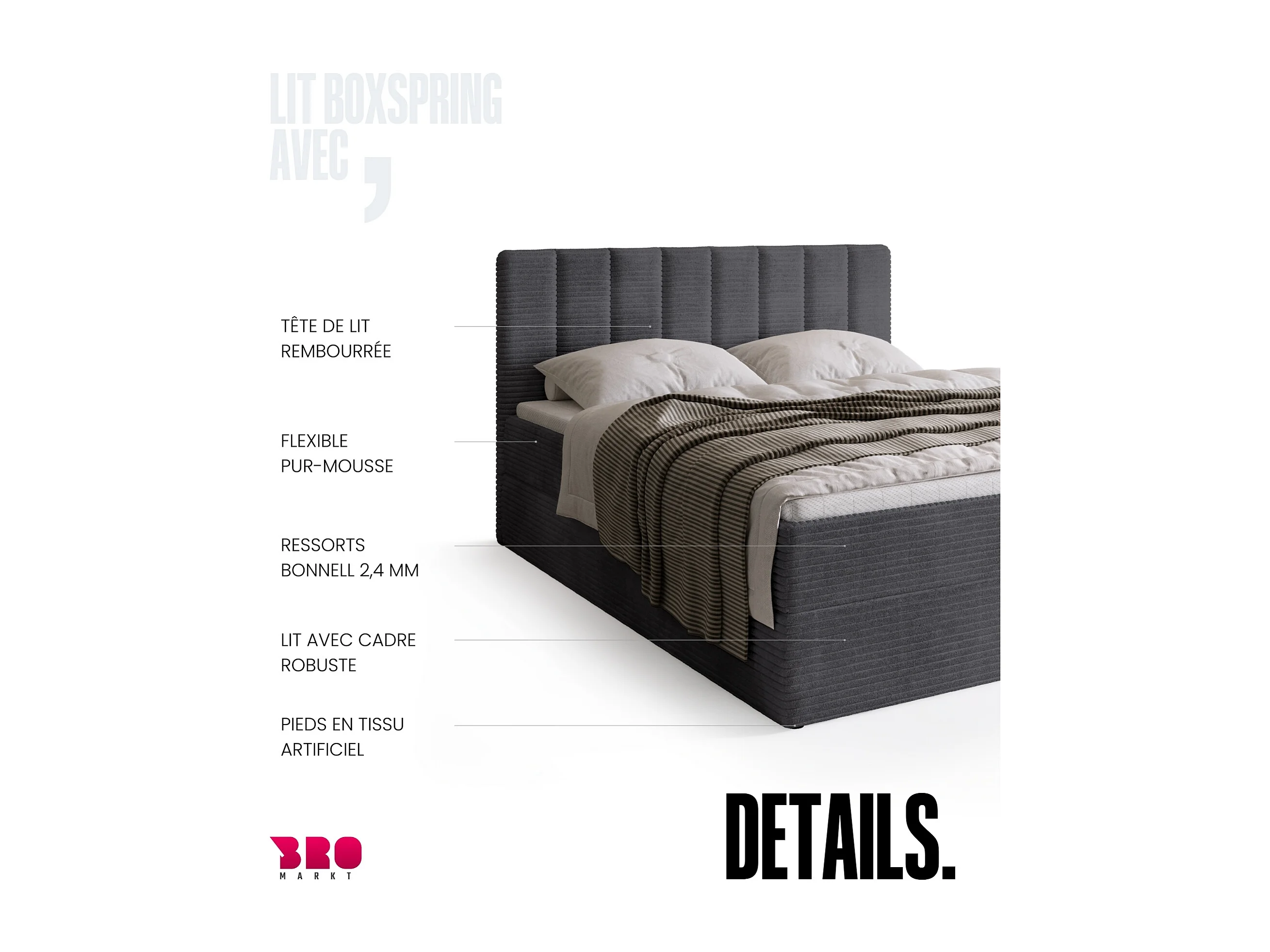 Lit boxspring avec rangement DENVER - matelas - surmatelas - gris - velours côtelé - 140x200 cm