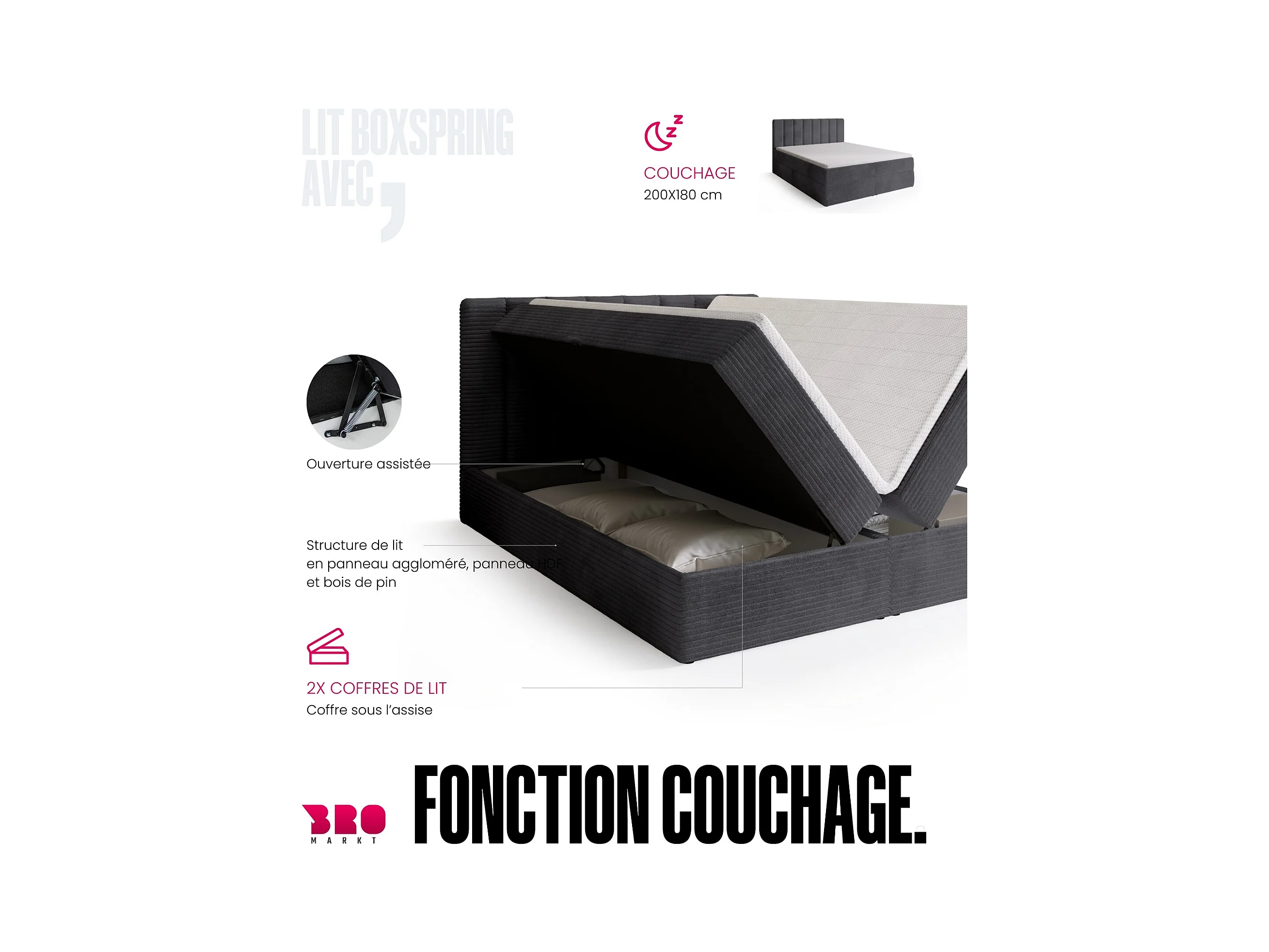 Lit boxspring avec rangement DENVER - matelas - surmatelas - gris - velours côtelé - 180x200 cm