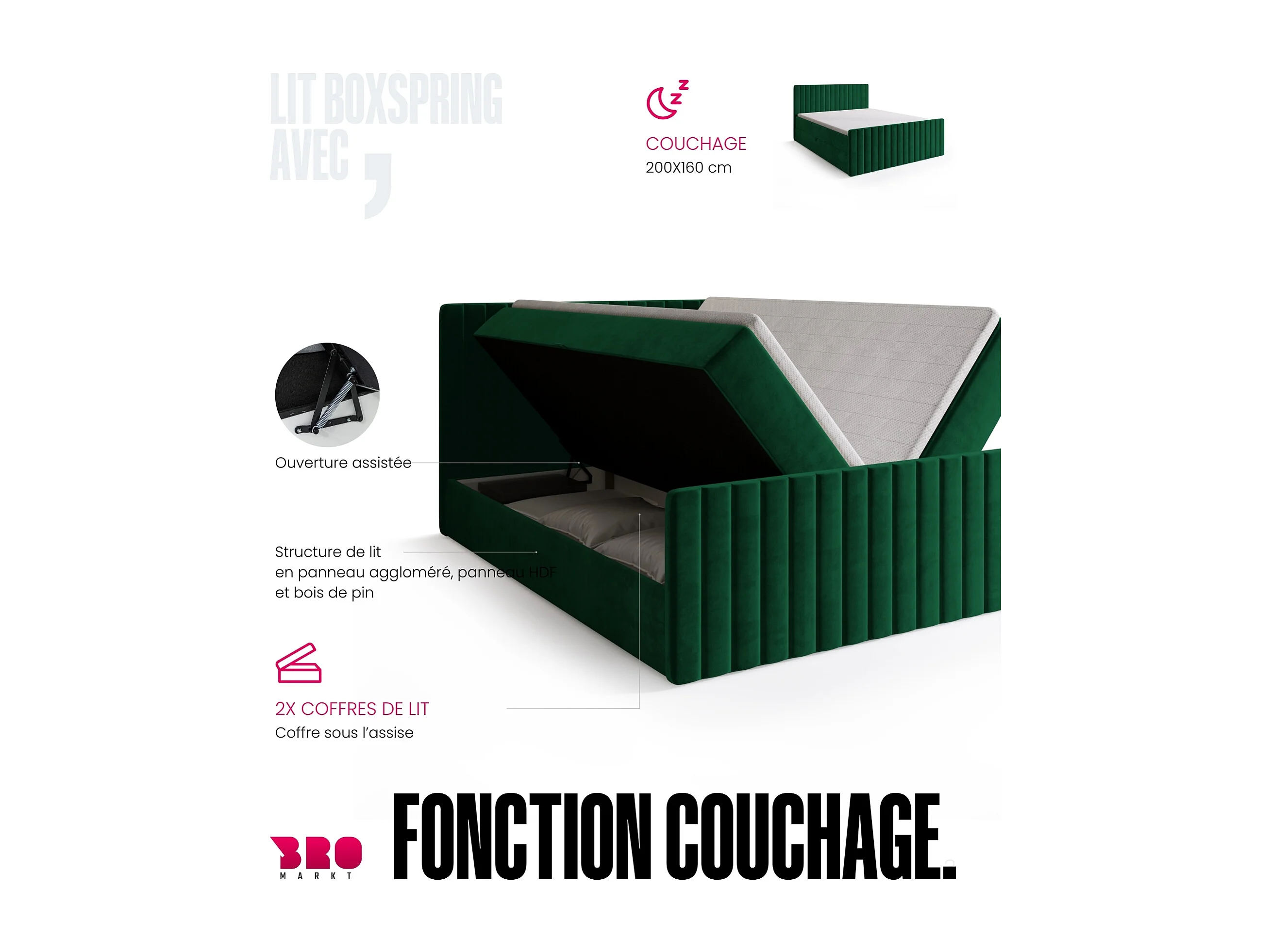 Lit boxspring avec rangement DREAM DUO - matelas - surmatelas - vert foncé - 160x200 cm