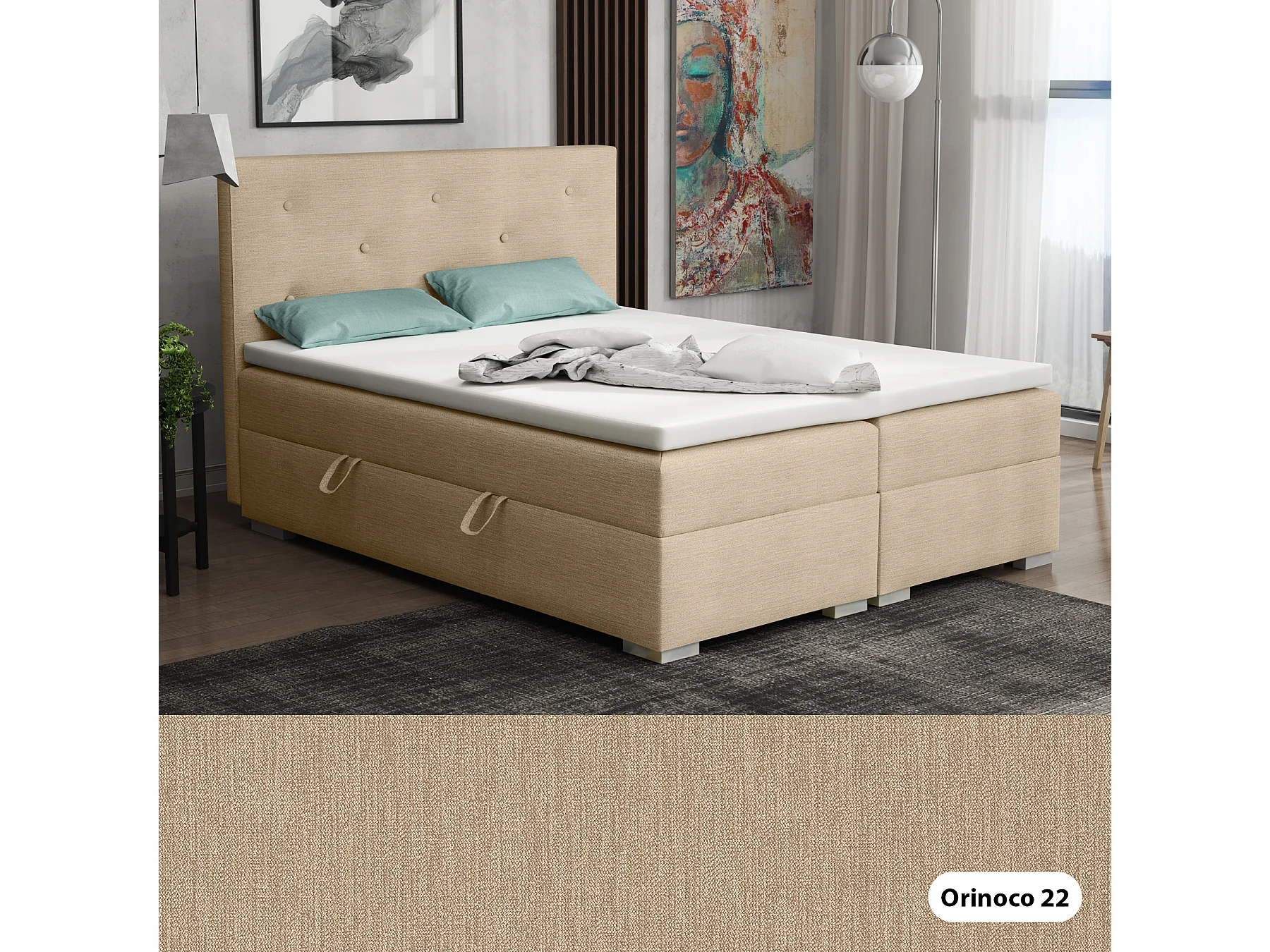 Lit Boxspring avec tiroirs de lit, Coffre de lit Topper Atlanta 160x200 cm, Orinoco 22 (Beige clair)
