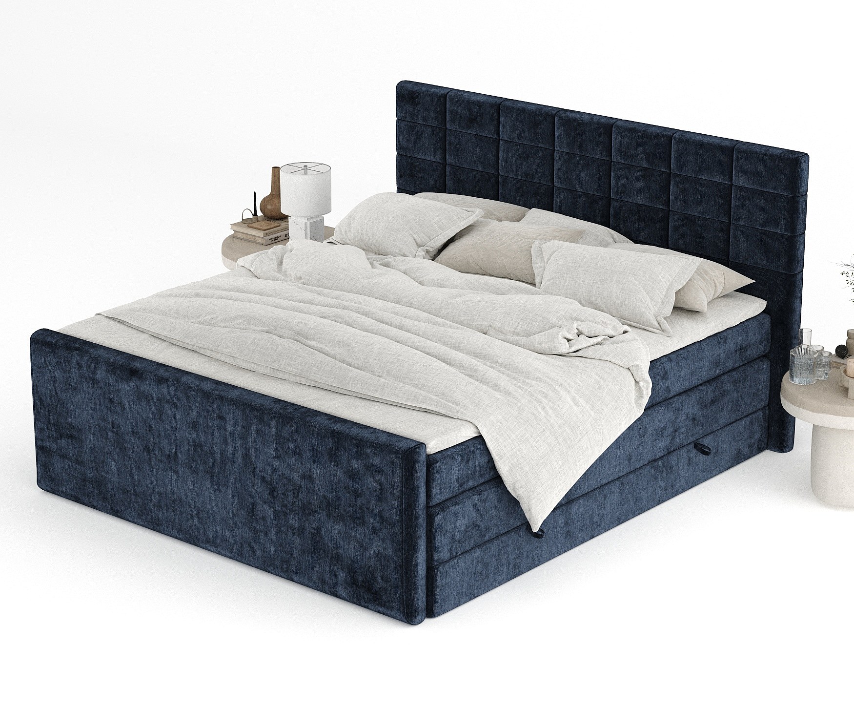 Lit boxspring en tissu chenille Ava - matelas - surmatelas - 200x200 cm - bleu marine