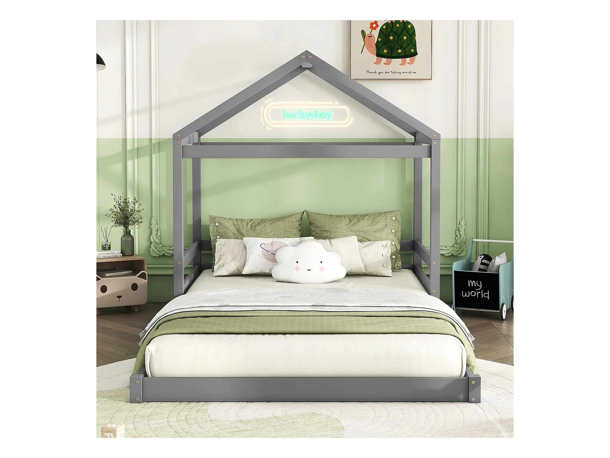 Lit cabane 140x200 cm en pin gris avec sommier, style minimaliste pour enfant, design maison ouvert