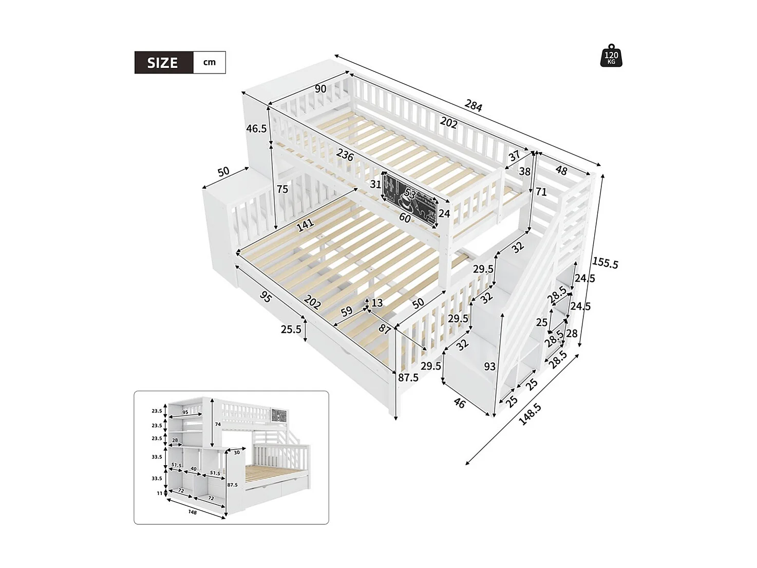 Lit cabane 140x200cm + 90x200cm, lit enfant, lit superposé, avec panneau style graffiti, escalier et tiroirs, blanc, sans matelas