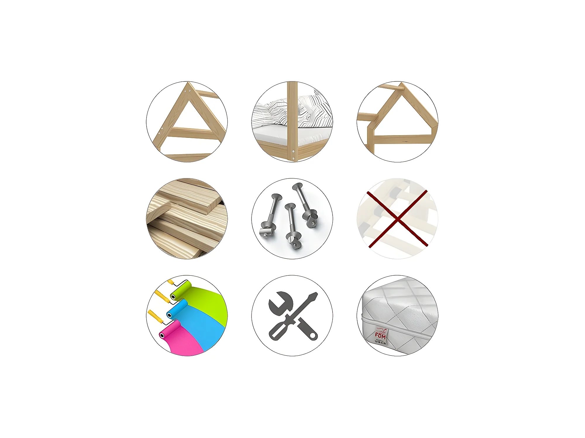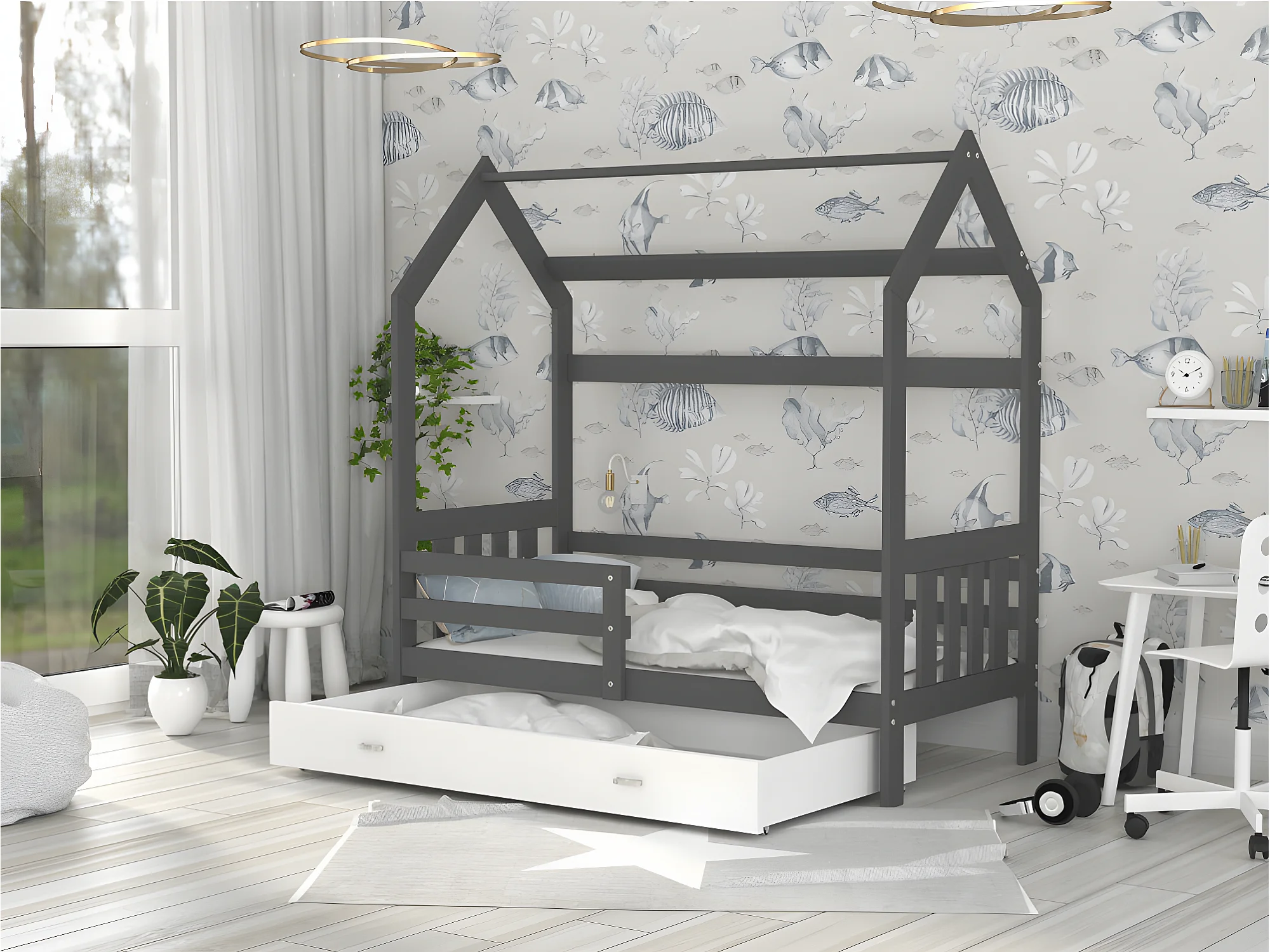 Lit Cabane 2 80x160 Gris - blanc Livré avec sommiers, tiroir et matelas en mousse de 7cm