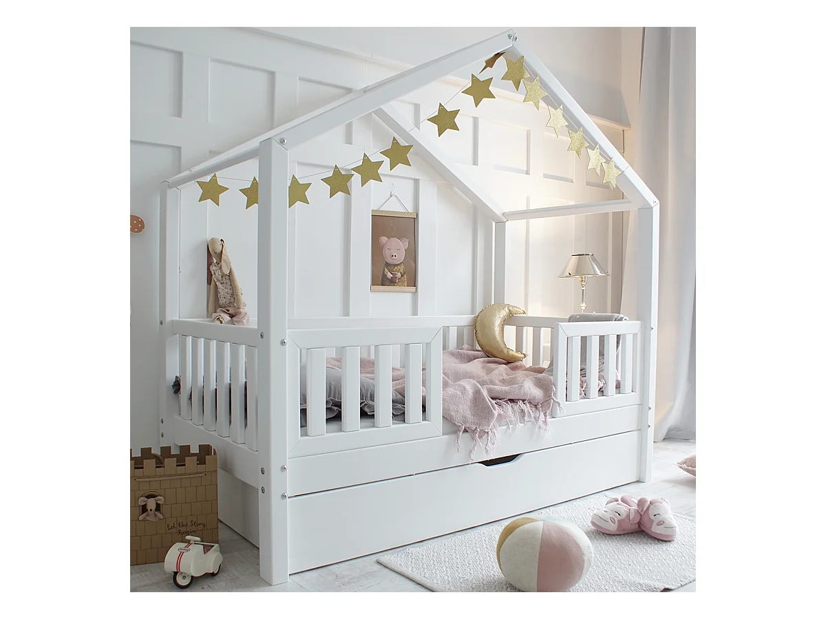 Lit cabane 90x190 barrières sommier et tiroir inclus Roxane Blanc