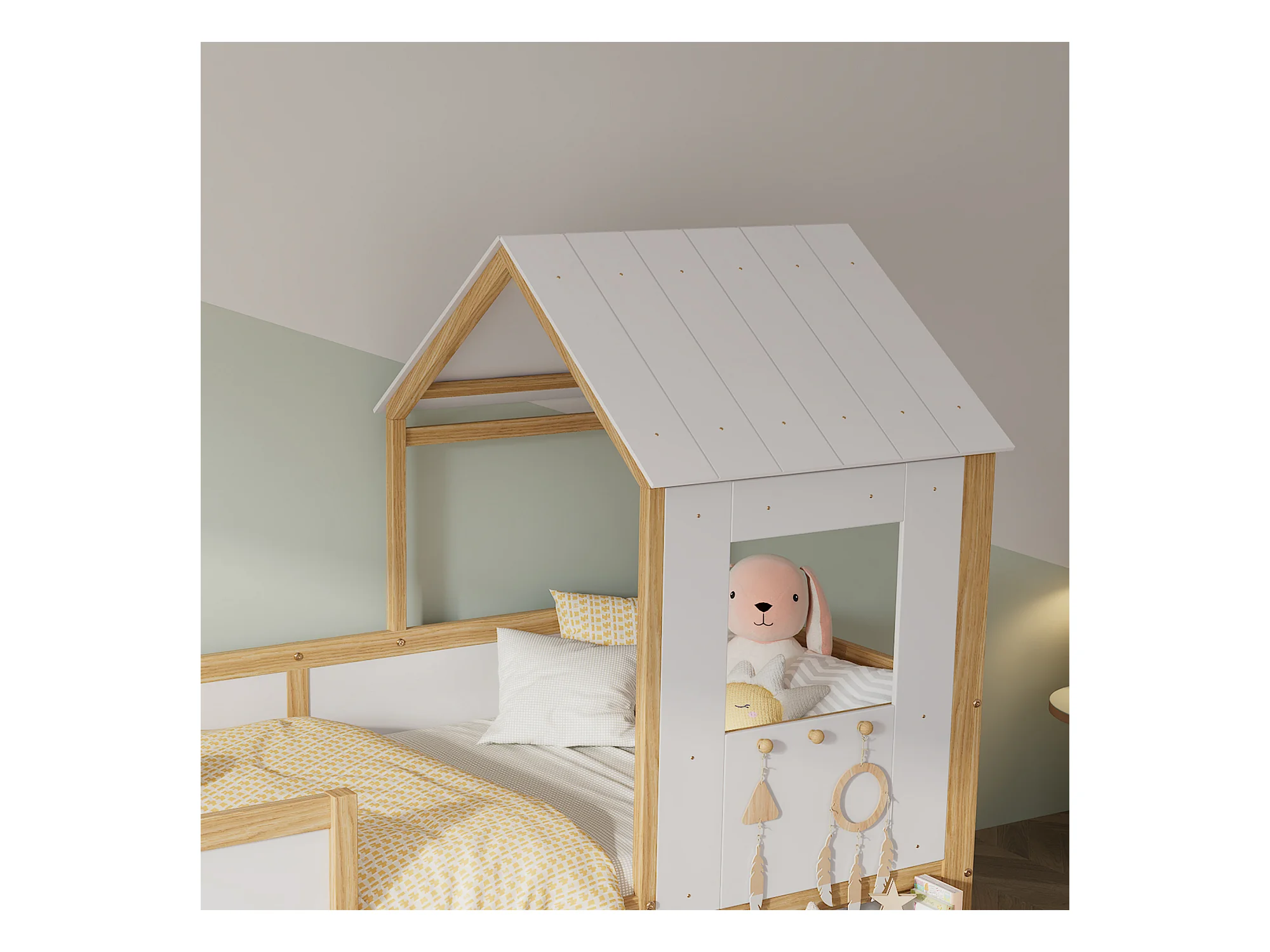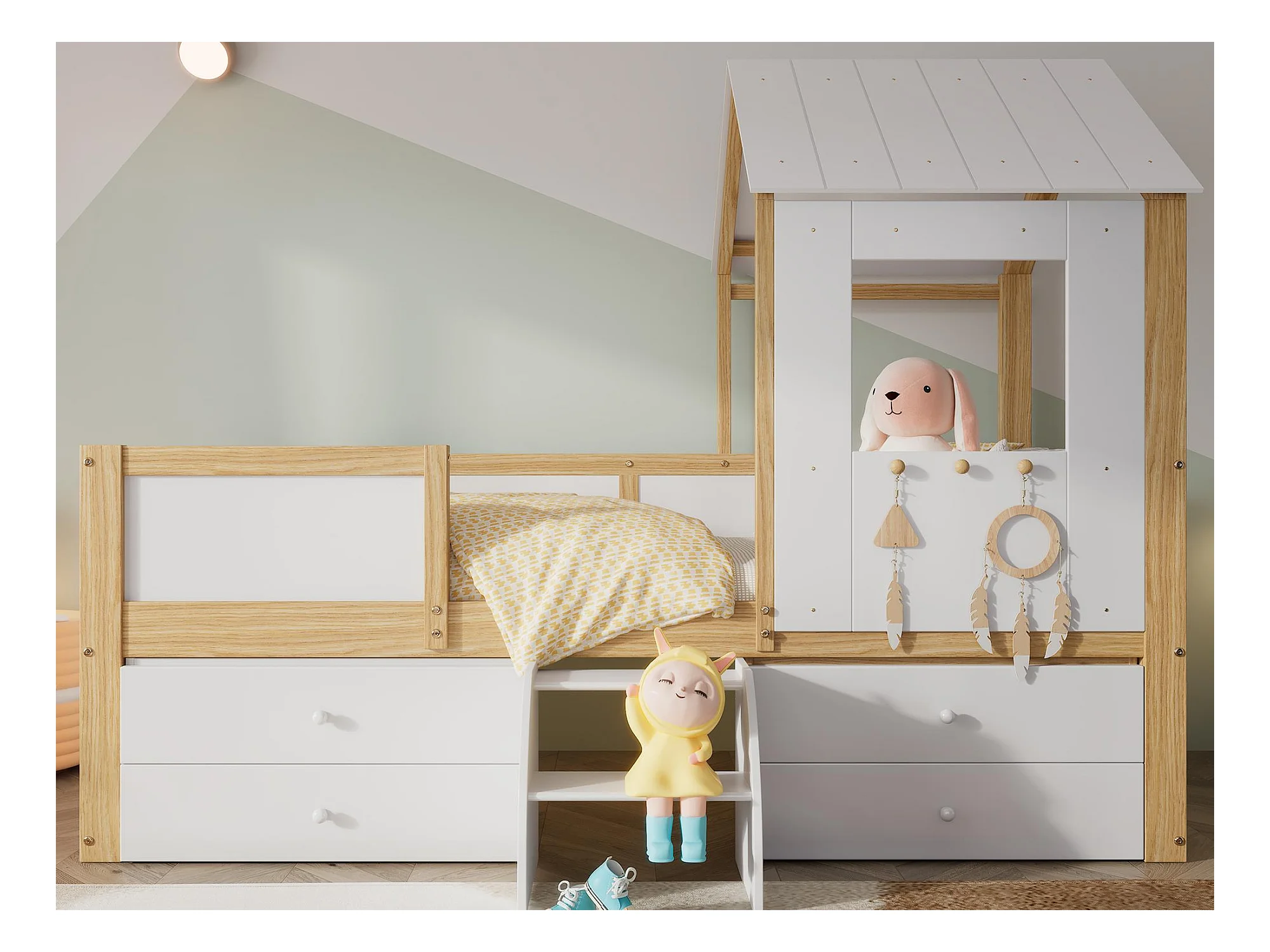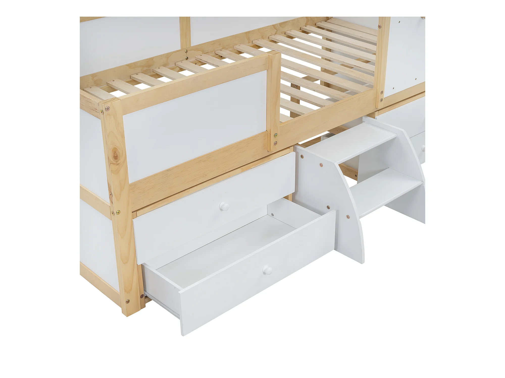 Lit cabane 90x200 cm avec barrière de sécurité - avec 4 tiroirs et escalier - en bois de pin et MDF - Blanc & Naturel