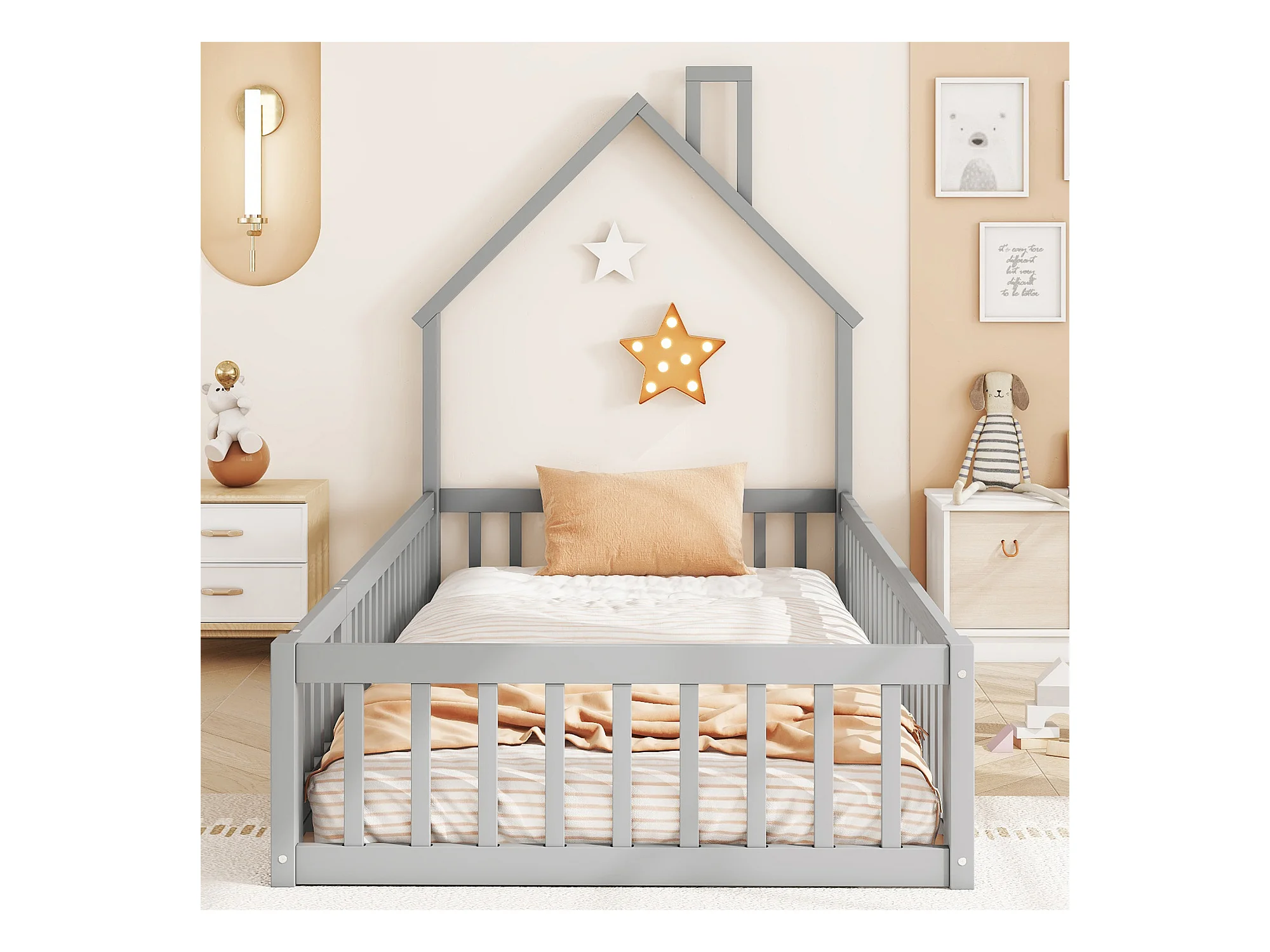 Lit cabane 90x200 cm en pin gris avec sommier, design cheminée, style maison minimaliste pour enfant